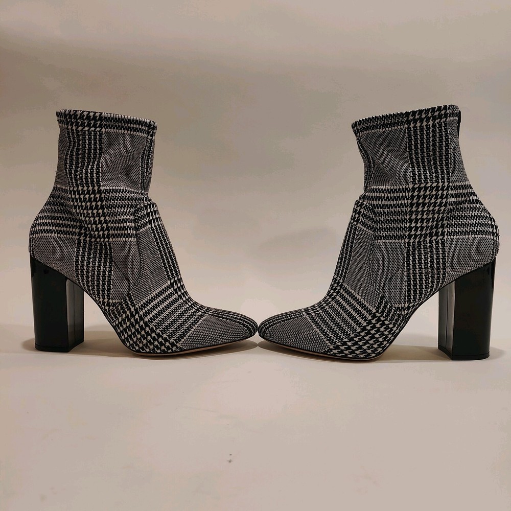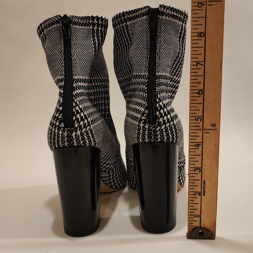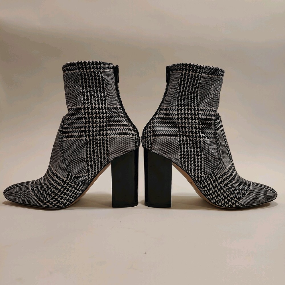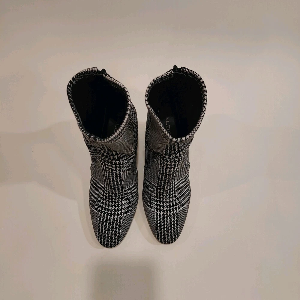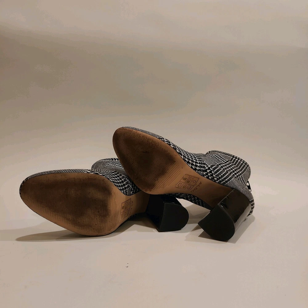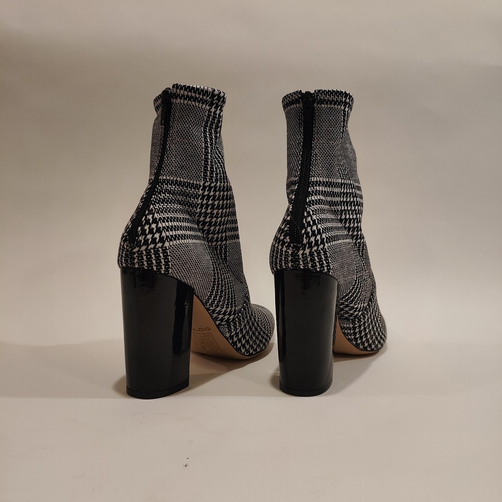 These Aldo Lovelee ankle booties are stylish women's shoes featuring a houndstooth pattern in black and white. These booties have a high block heel measuring 4 inches, adding a touch of glamour to any outfit. The boots have a zip closure for easy wear and a stretch feature for added comfort. The synthetic upper material is durable and easy to clean, making these booties a fashionable and practical choice for any wardrobe.