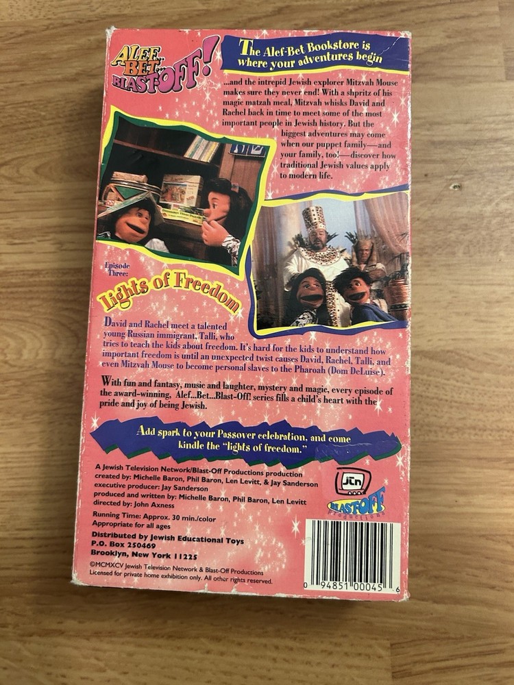 The product is a VHS tape of the "Lights Of Freedom" cartoon show featuring Jewish puppets, aimed at kids. The show is in English and follows the NTSC signal standard. Starring Elliott Gould and produced by Blast Off Productions, this family-friendly adventure offers a fun and educational experience for children. With a G rating, this full-screen edition from the United States is sure to entertain and inspire young viewers. Good condition. The dust sleeve has some wear.