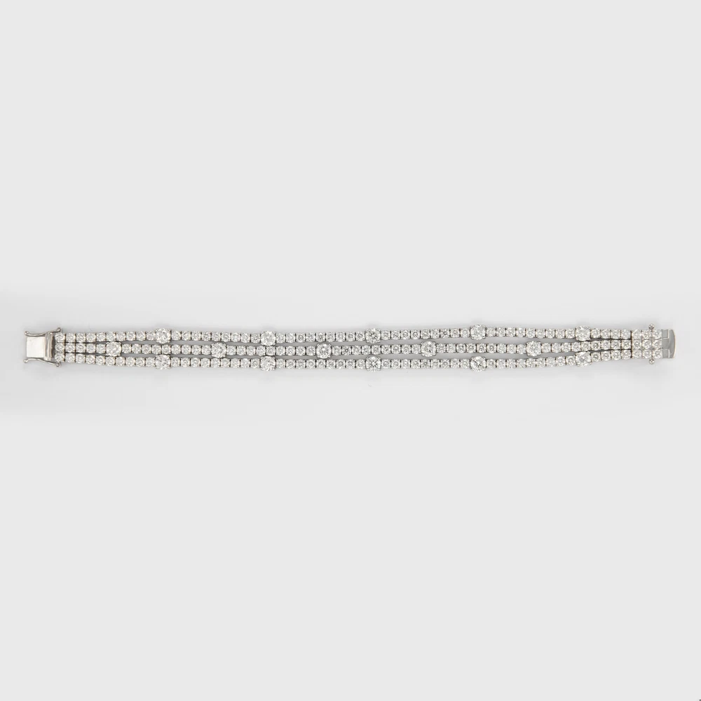 Exquisite and timeless three row diamonds tennis bracelet. By Alexander Beverly Hills. 174 diamonds total, 17.40 carats total. 15 larger round brilliant diamonds 4.68ct, approximately H/I color and SI clarity. 159 round brilliant diamonds 12.72ct, approximately H/I color and SI clarity. Prong set in 18k white gold, 7in. Accommodated with an up-to-date digital appraisal by a GIA G.G. once purchased, upon request. Please contact us with any questions. Item Number B3663