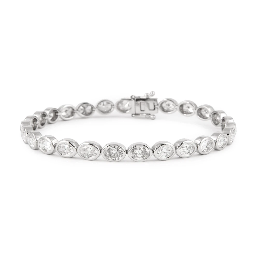 Stunning modern bezel set east-west oval cut diamond tennis bracelet. High jewelry by Alexander Beverly Hills. 27 oval cut diamonds, 8.46 carats. Approximately F/G color and SI clarity. 18k white gold, 14.87 grams, 7.25 inches. Accommodated with an up-to-date digital appraisal by a GIA G.G. once purchased, upon request. Please contact us with any questions. Item Number BS1783