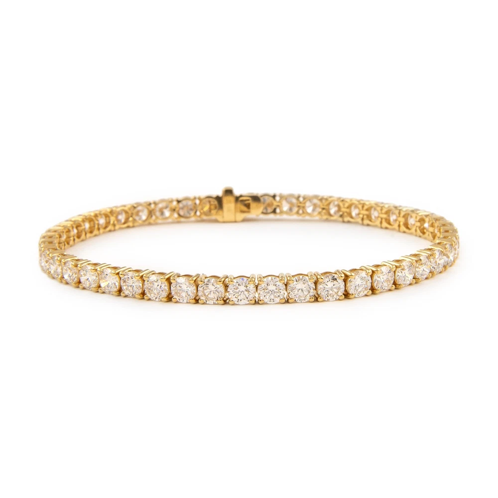 Exquisite and timeless diamonds tennis bracelet, by Alexander Beverly Hills. 42 round brilliant diamonds, 9.88 carats total. Approximately H/I color and VS clarity. Four prong set in 18k yellow gold, 12.72 grams, 7 inches. Accommodated with an up-to-date appraisal by a GIA G.G. once purchased, upon request. Please contact us with any questions. Item Number MD008