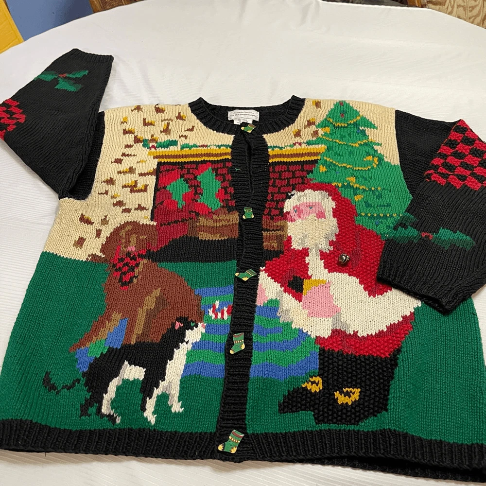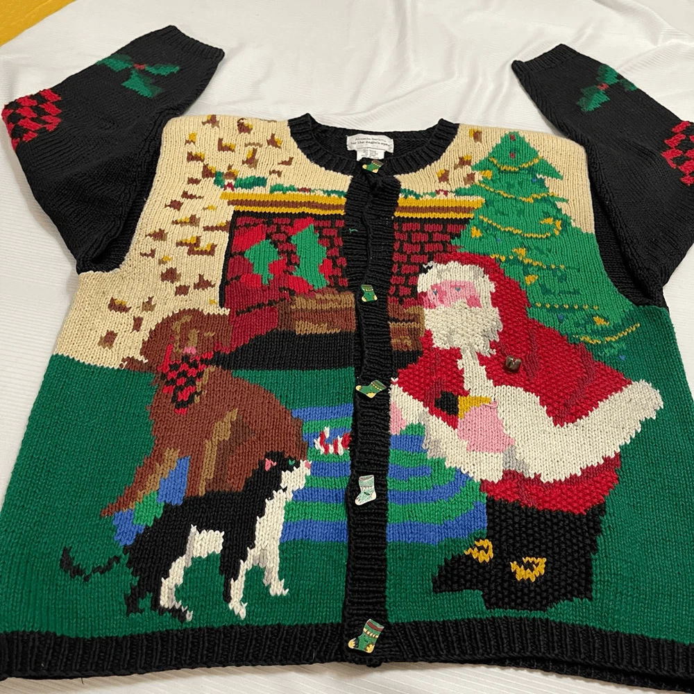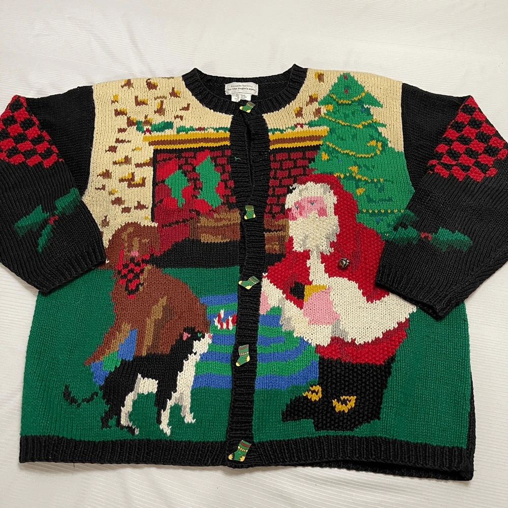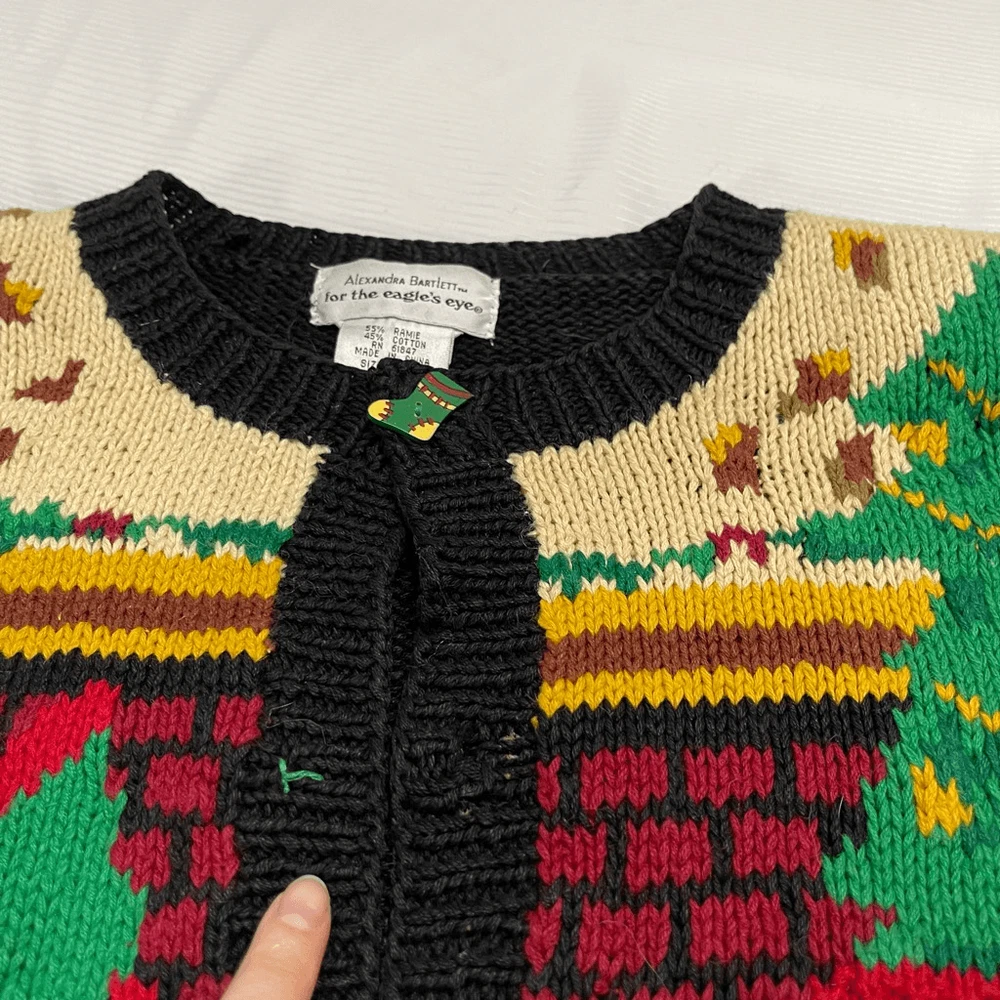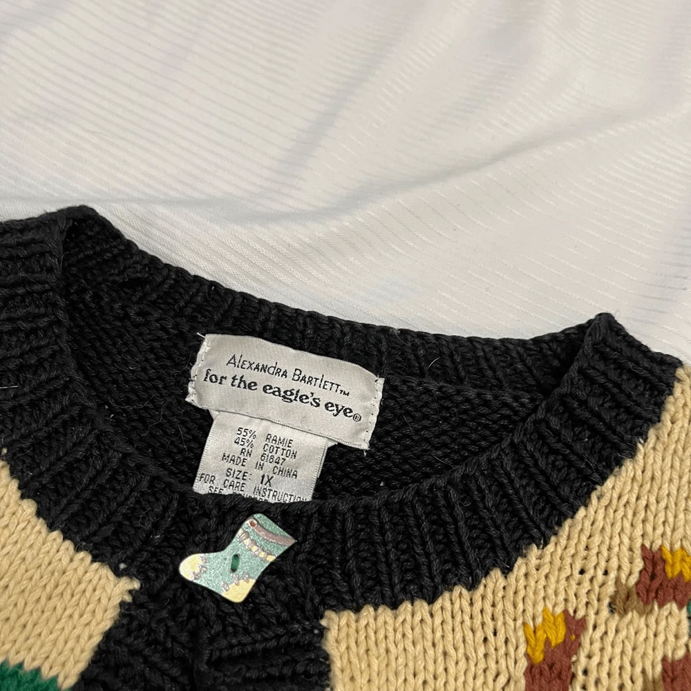 Alexandra Bartlett Eagles Eye VTG Santa Sweater Cardigan Plus Size 1X Missing a button May have some stains or wear since it’s a rare vintage piece please see all photos See photos for measurements 55% ramie 45% cotton