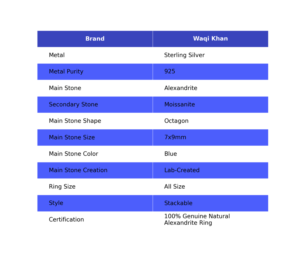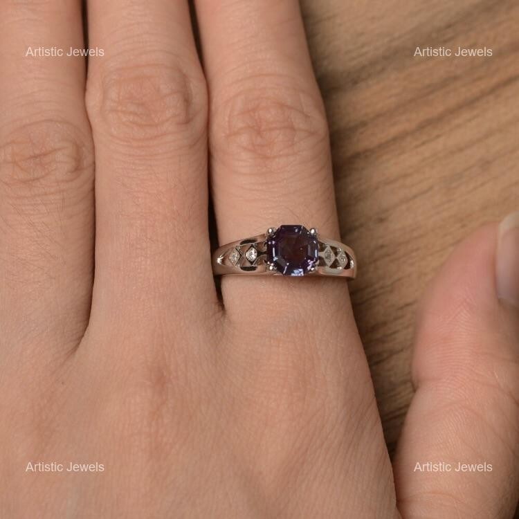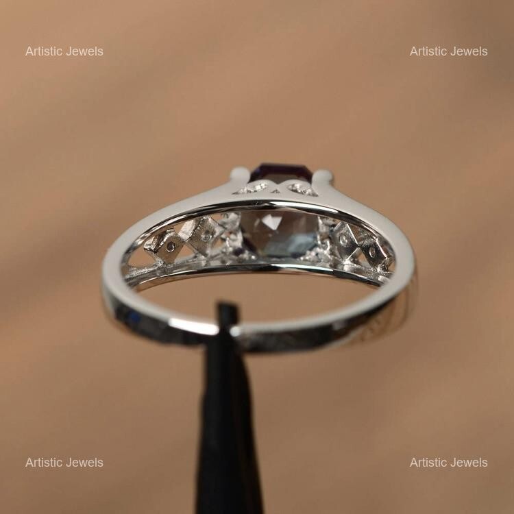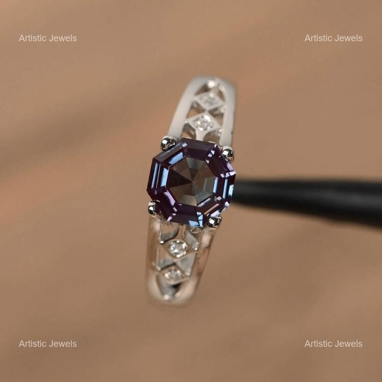 Simple and elegant, this 925 Sterling Silver Alexandrite studded Ring will make your look fashionable and classy. Its classy shine and flawless finish enhances its majestic charm and makes it more adorable. Welcome to Waqikhan ! Gift For Her Lab-Created Alexandrite Stackable Ring Size All Size 925 Silver NOTE :- "ALL RING SIZES ARE AVAILABLE WITH US FROM SIZE 4 TO 14. PLEASE MESSAGE US WITH DESIRED SIZE OF YOURS" Description :- SKU:- M788 Metal:- Sterling Silver Metal Purity:- 925 Gemstone:- Alexandrite, Moissanite Gemstone Color:- Blue Gemstone Shape :- Octagon Gemstone Creation :- Lab-Created Stone Setting :- Prong Ring Size:- All Size US Shipping & Delivery Policy :- We offer worldwide shipping via Registered and Express mail services, each providing a tracking number for your convenience. Please note that any additional charges, such as customs duties or taxes, are the responsibility of the buyer. We only ship to the registered address provided during checkout. Handling Time :- 2-3 business days. Delivery Time :- Standard shipping typically takes 15-25 days, depending on your location. Expedited shipping is available for an additional fee. Return & Refund Policy :- Your satisfaction is our top priority. If you're not completely happy with your purchase, please contact us immediately so we can address any concerns. We offer a 100% satisfaction guarantee, including full refunds. Return Period :- Items may be returned within 30 days of receiving your order. Payment & Support :- We value our customers! If you have any questions or concerns, please feel free to reach out. We are committed to ensuring your satisfaction and resolving any issues. Feedback :- We provide positive feedback upon receiving payment. If you encounter any issues, please contact us before leaving neutral or negative feedback. We are dedicated to resolving problems swiftly and professionally. Jewelry Care Instructions :- Avoid Liquids & Chemicals: Keep your jewelry away from perfumes, seawater, chlorinated pools, hairspray, and sweat. Remove at Night: Take off your jewelry before sleeping to prevent damage. Protect from Heat & Humidity: Keep your pieces away from direct sunlight, high temperatures, and humid conditions. Avoid Water: Remove jewelry before bathing, showering, or swimming. During Physical Activities: Take off jewelry during exercise, cleaning, or gardening to prevent damage. Cleaning: Gently clean your jewelry after each wear and occasionally polish with a soft cloth. Proper Storage: Store your jewelry in an airtight container or jewelry box, and keep pieces separate to avoid scratches. Why Choose Us? Harmless & Hypoallergenic :- Our jewelry is nickel-free, lead-free, and hypoallergenic, handcrafted with care by Waqikhan. Perfect Gift :- Ideal for birthdays, weddings, anniversaries, and special occasions, our timeless designs make thoughtful gifts. Solid 925 Sterling Silver :- All pieces are made from genuine 925 sterling silver, stamped for authenticity, and designed for everyday wear. Versatile & Stylish :- Our jewelry is the perfect complement to any outfit or occasion, blending modern sleekness with classic elegance. Mesmerizing Design :- Each piece comes beautifully packaged in a jewelry box, making it an ideal gift for Mother’s Day, Valentine’s Day, anniversaries, and more. Our Policies :- Image Policy :- All product photos are taken in natural lighting to ensure the item you see is exactly what you’ll receive. Product Guarantee :- You will receive the exact handmade product shown in the images. Orders & Customization :- We accept orders from around the world, including custom and bulk requests. Please reach out with any special requirements. Customer Satisfaction :- Your feedback is important to us! After receiving your product, we encourage you to leave a review. Your satisfaction is our priority. Thank you for choosing Waqikhan! We look forward to serving you.