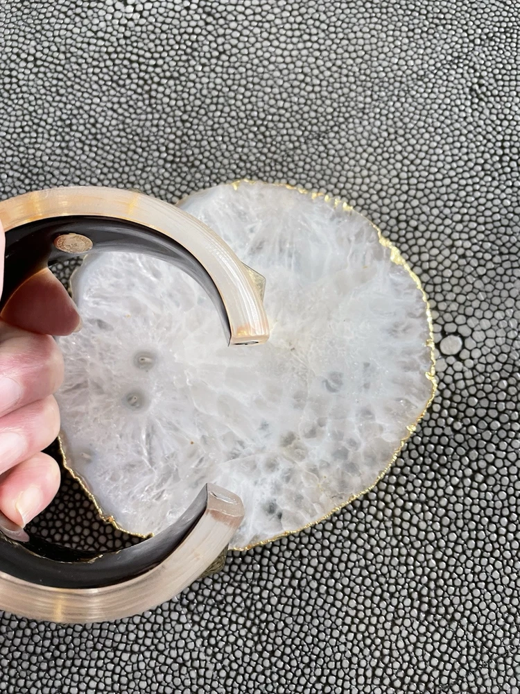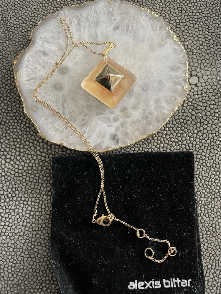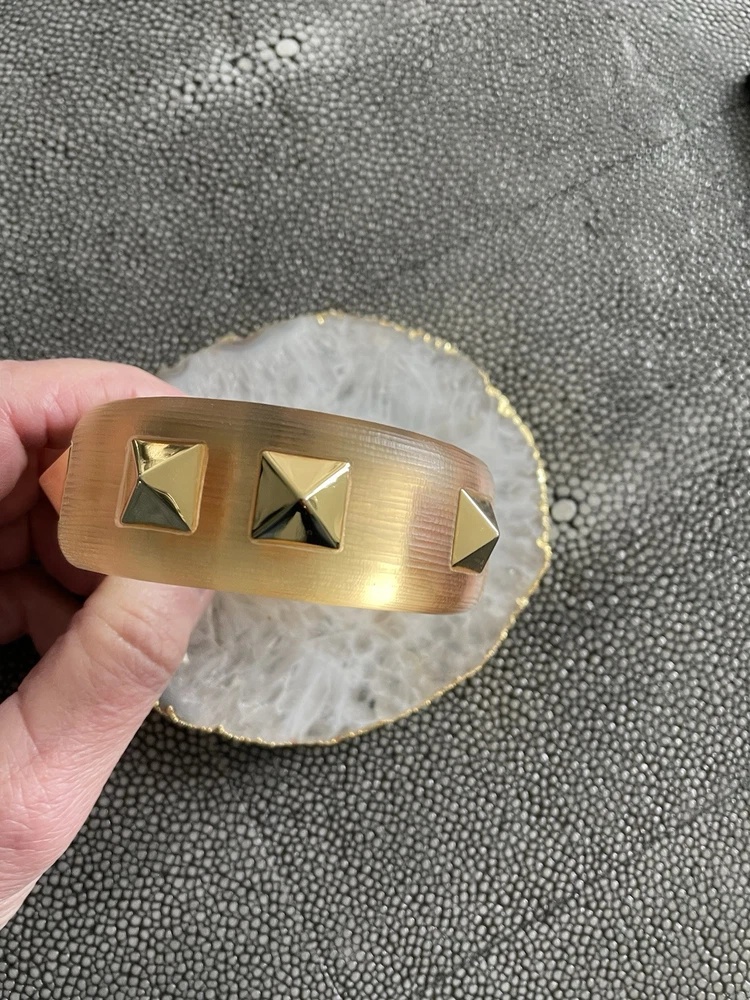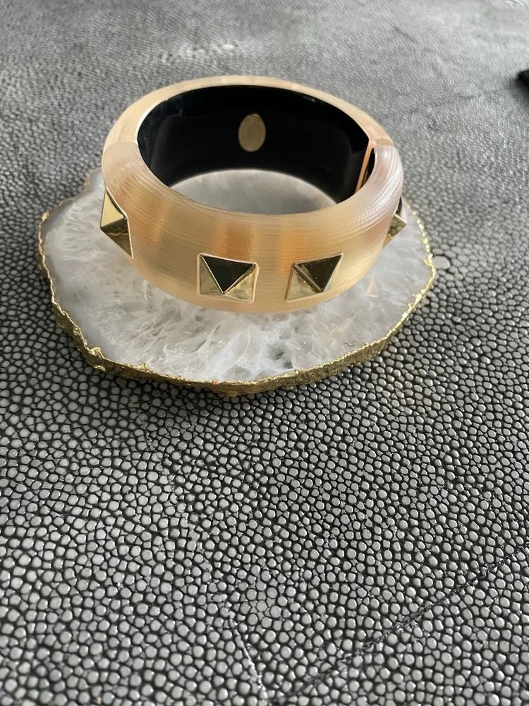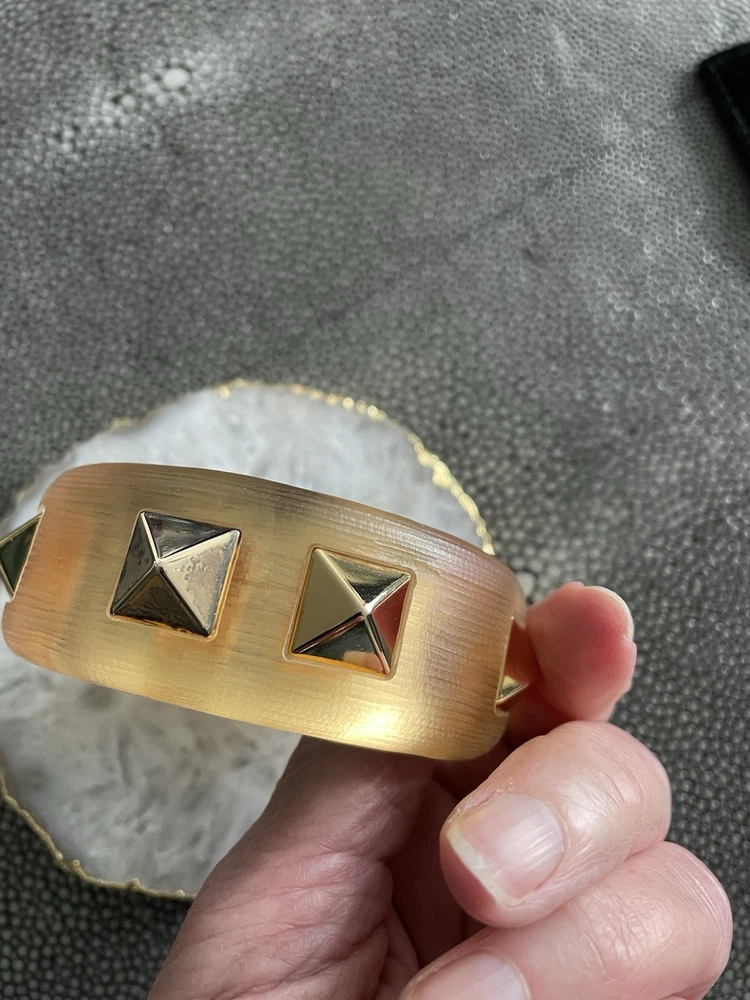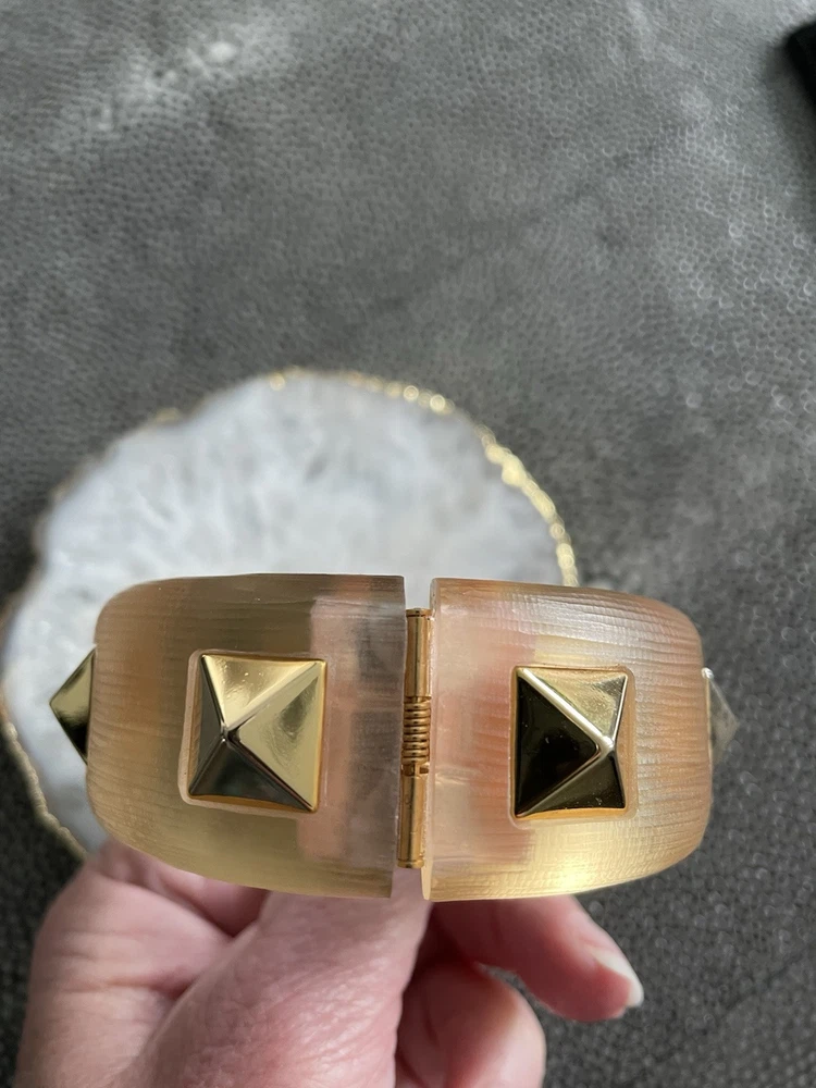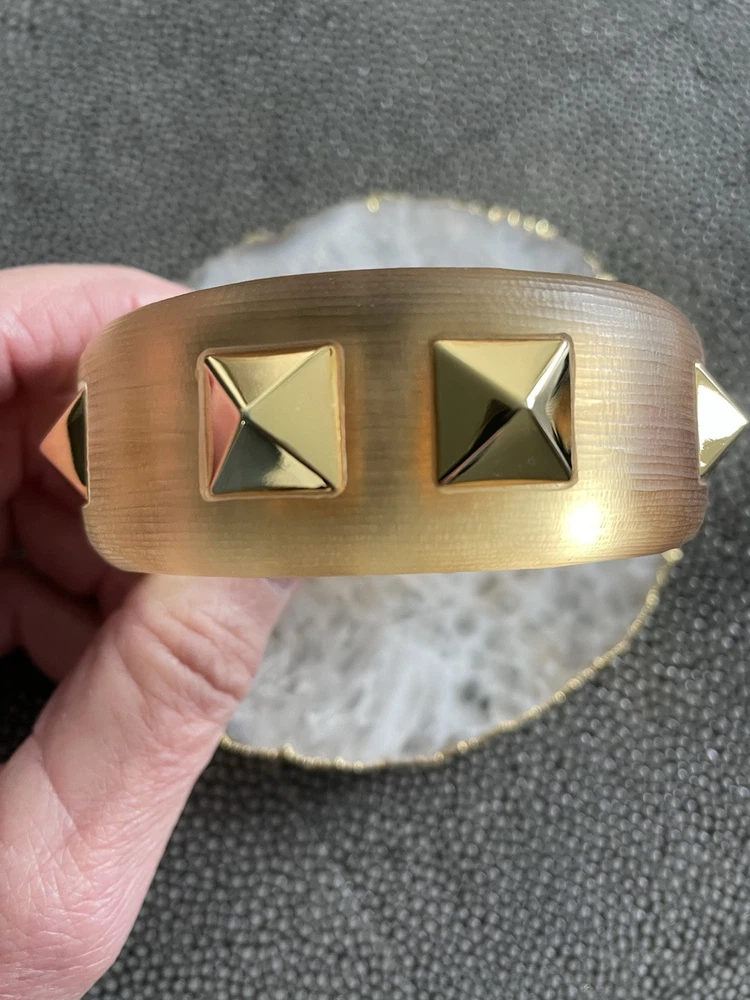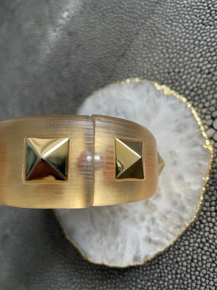 Hand sculpted, polished and signed by one of the greatest 21st century luxury designers, Alexis Bittar. His designs are classic and modern and exude class. I’m offering 3 pieces set that includes a necklace with gold adjustable length chain drop 8-12”, a beautiful wide cuff bracelet with hinge for easy on and off and the matching ring approximately size 7-8. All consists of hand sculpted Lucite with gold embellishments and chain. A raised pyramid prong is centered in the ring and necklace and surrounding the bracelet. Purchased at Saks Fifth Avenue in early 2000’s. Quality fine jewelry! Very classy attention getting pieces! It’s priced as a set and that would be my preference but will consider selling individually. Please inquire for individual pricing.