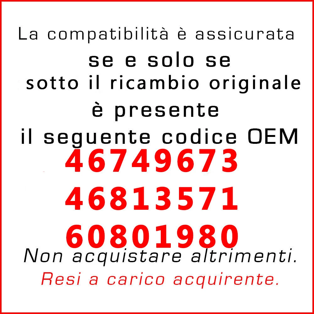 Compatibilità universale: No MPN: 47AH Codice ricambio originale OE/OEM: 46749673, 46813571, 60801980 Parti auto d'epoca: No Source: A-3048254169840935-GIA Marca: Vinciann Ricambio ultra performante: No Colore: Nero Garanzia produttore: 2 anni