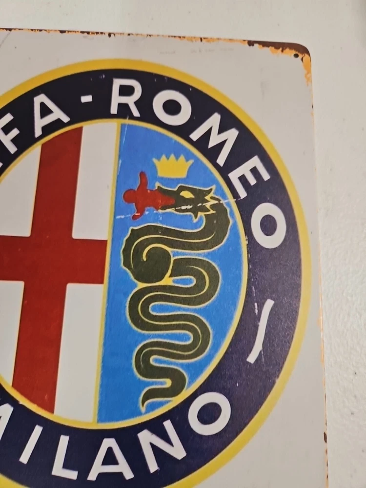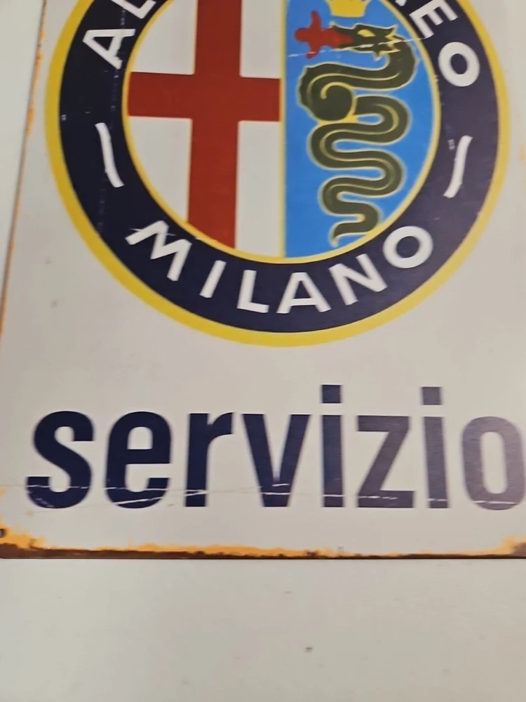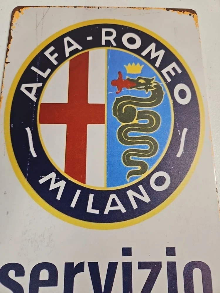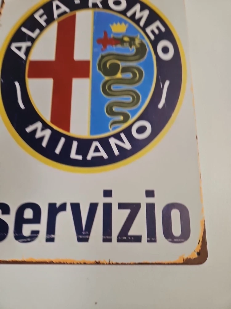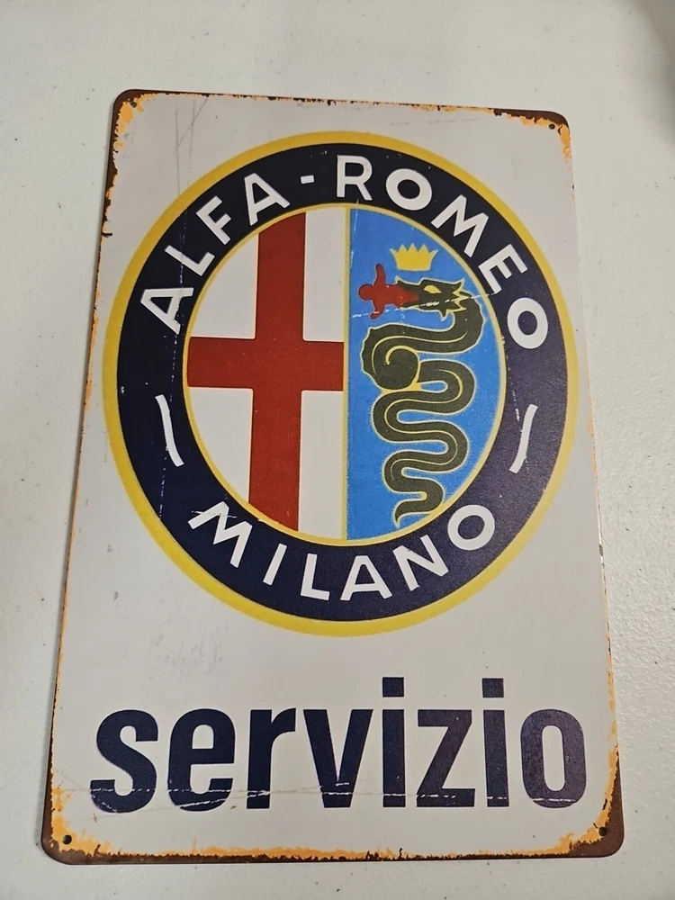 Add a touch of rustic charm to your space with this Alfa-Romeo, Milano, Servizio sign. Crafted from metal, this vertical rectangular sign measures 8x12 inches and features a multicolor finish that makes it perfect for any indoor or outdoor setting. The sign is easy to mount, and it can be hung on a wall or door, or mounted directly on a door. This decorative sign is perfect for Alfa-Romeo enthusiasts and those who appreciate rustic style. It requires no additional parts and is ready to display. Whether you're looking to add some character to your garage or outdoor space, this sign is a great choice.