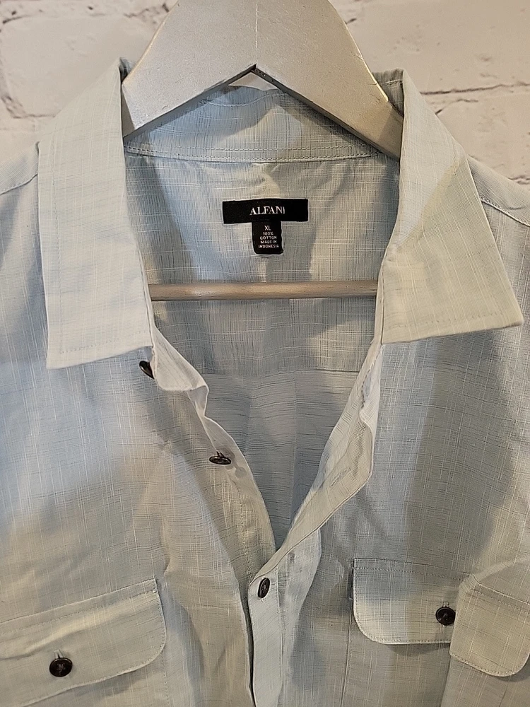 Crafted for the modern man, the Alfani Button-Down Casual Dress Shirt offers a blend of comfort and style, adds a touch of vibrancy to your wardrobe, perfect for those looking to make a subtle statement. Made from soft cotton, this shirt promises breathability and ease of movement, ideal for both spring and summer seasons.With a regular fit that ensures a flattering silhouette, this long-sleeved shirt features a classic button-down collar and a neat button closure. Whether it's for a day out or a casual office setting, this Alfani dress shirt, boasting a solid pattern with floral accents, is a versatile addition to any discerning gentleman's collection. Any questions feel free to ask before purchase.