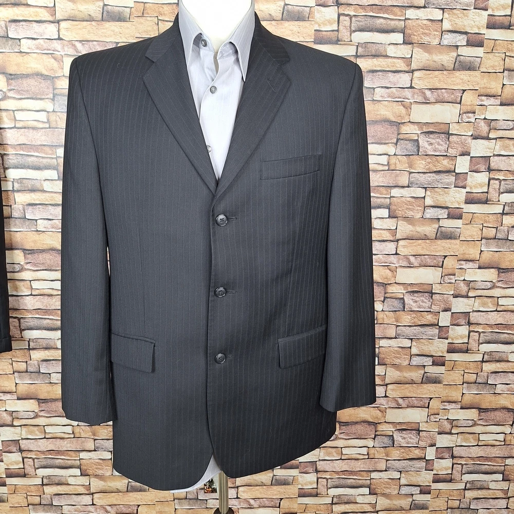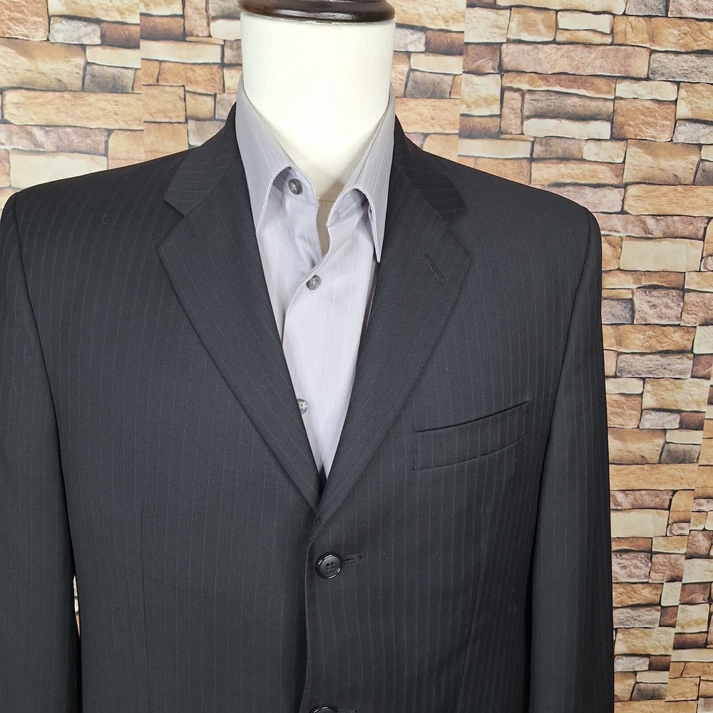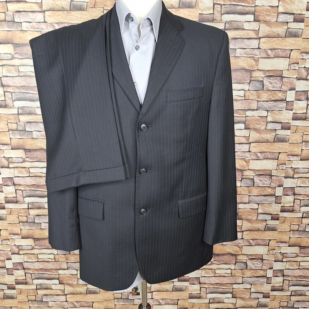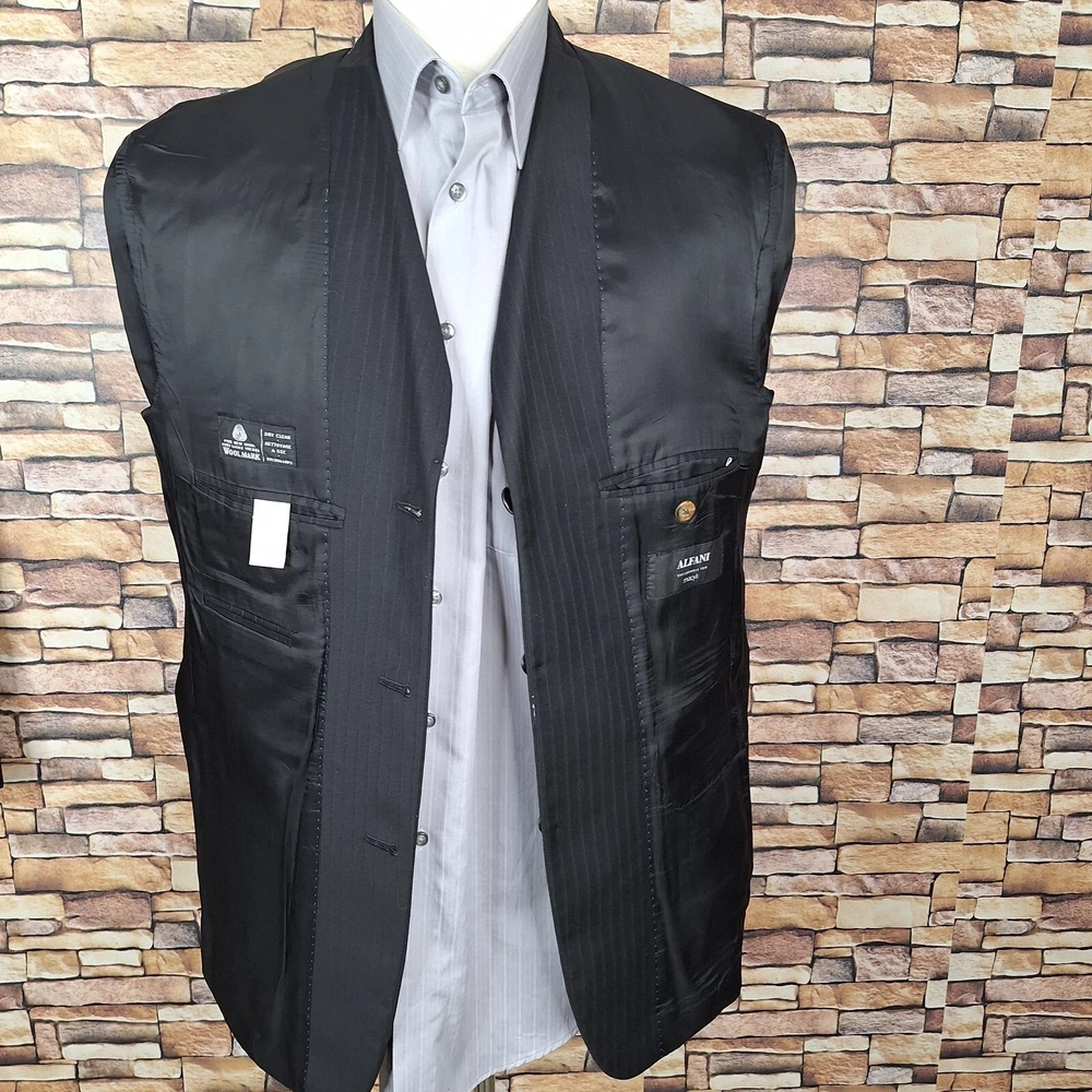 Features: Inner Pockets Lining Material: Viscose/Rayon Chest Size: 40 Material: Wool Size Type: Regular Fit: Regular Season: Fall, Spring, Summer, Winter Occasion: Business, Casual, Formal, Party/Cocktail, Travel, Wedding Size: 40 Jacket Sleeve Button Style: Four-Button Style: 2 Piece Theme: Classic, Designer, Elegant, Modern, Preppy, Wedding Type: Suit Color: Black Waist Size: 34 in Country/Region of Manufacture: Canada Inseam: 32 in Handmade: No Jacket Cut: Single-Breasted Garment Care: Dry Clean Only Pattern: Striped Jacket Front Button Style: Two-Button Jacket/Coat Length: Regular Jacket Vent Style: Ventless Department: Men UPC: Does not apply gtin13: Does not apply Front Type: Pleated Vintage: Yes Jacket Lapel Style: Notch Number of Pieces: 2 Piece Personalize: No Brand: Alfani