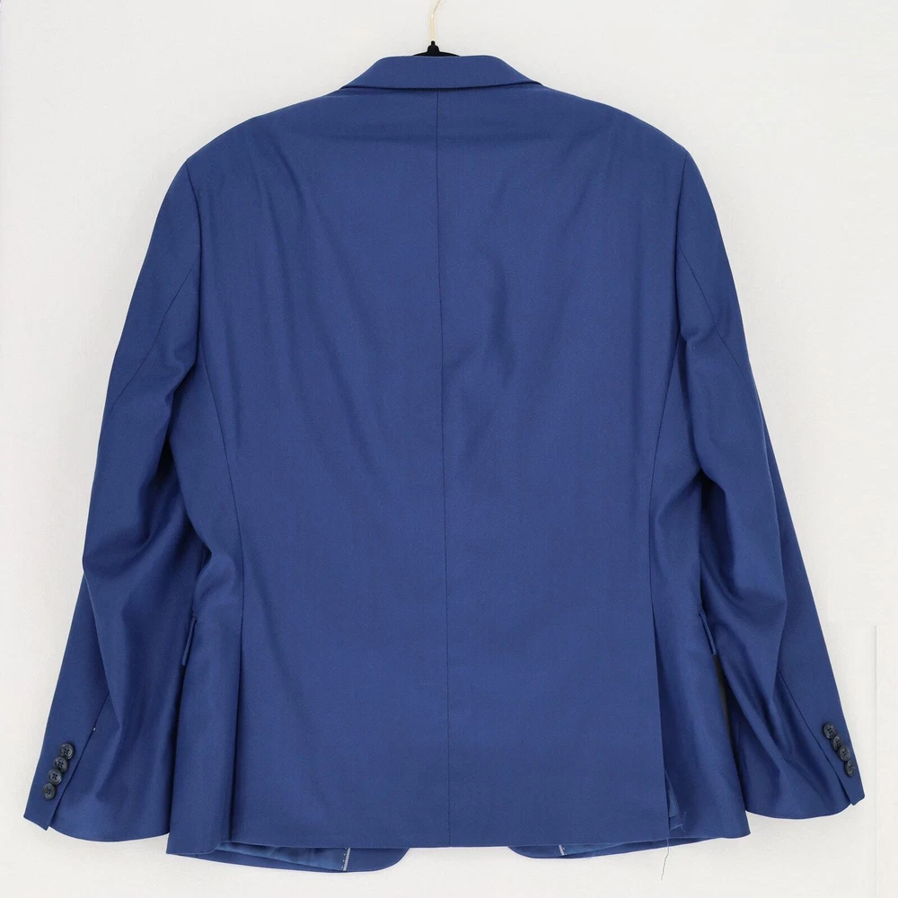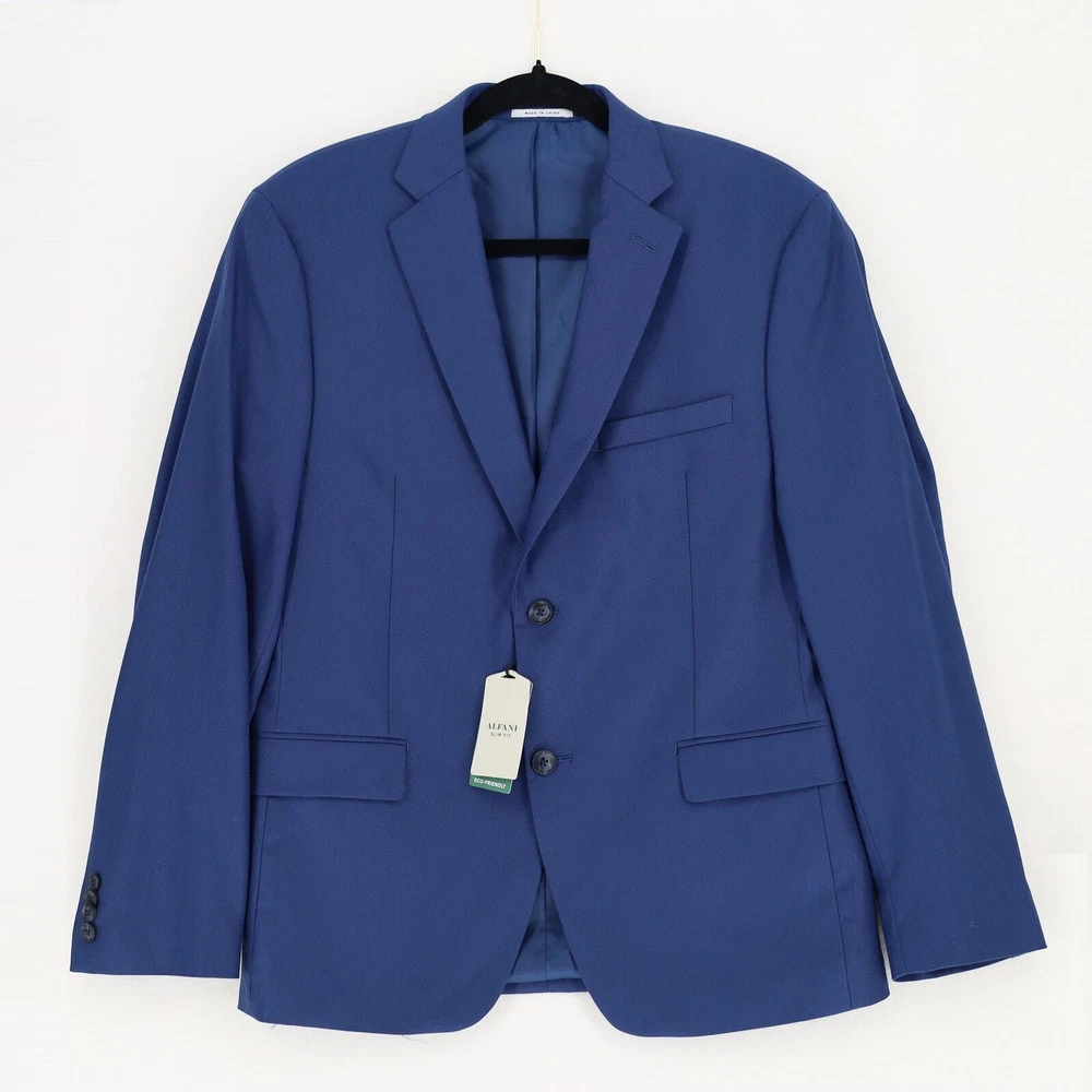 Alfani Men's Blue Solid Classic Slim-Fit Wrinkle Resistant Suit Jacket Size 40S New with tags MRSP $360 Luxe blue suit jacket Slim fit through the shoulders, chest and waist with higher armholes and sleeves Notched lapel Two-button closure Four-button cuffs Two front flap pockets Left chest welt pocket Side vents Fully lined Stretch performance Shell: 49% recycled polyester / 27% polyester / 31% viscose / 3% elastane Lining: 100% polyester Dry clean Length 28" Armpit to armpit 20.5" Shoulders 17.5" Sleeve 25"