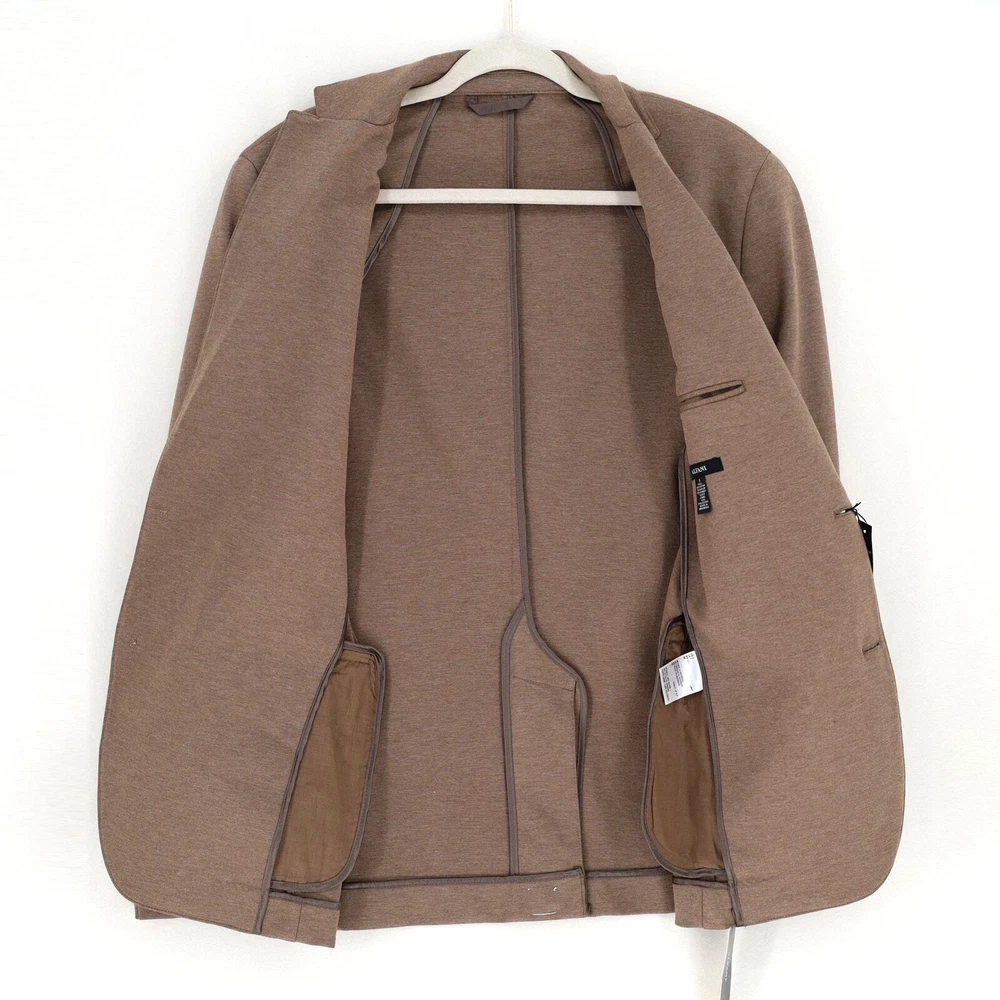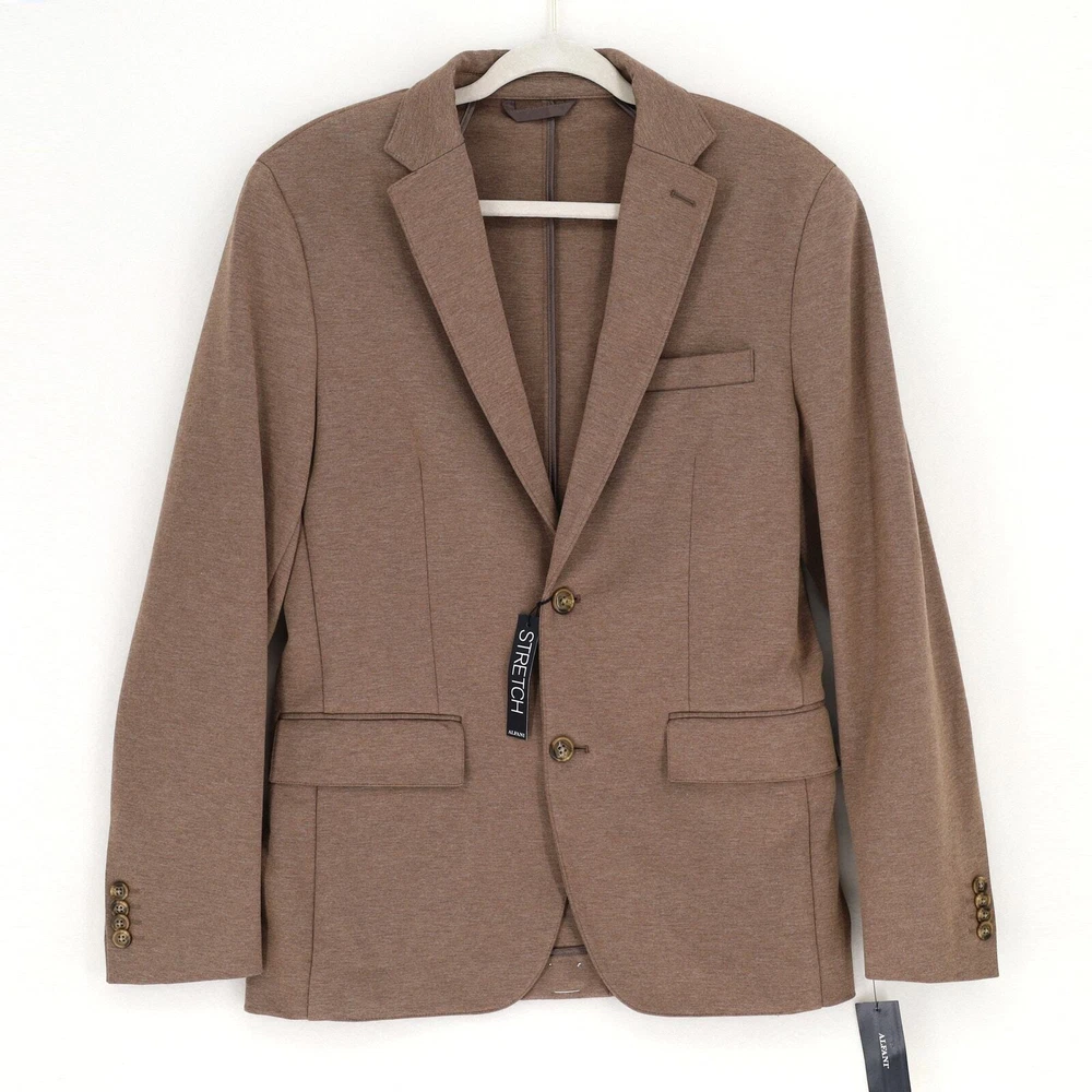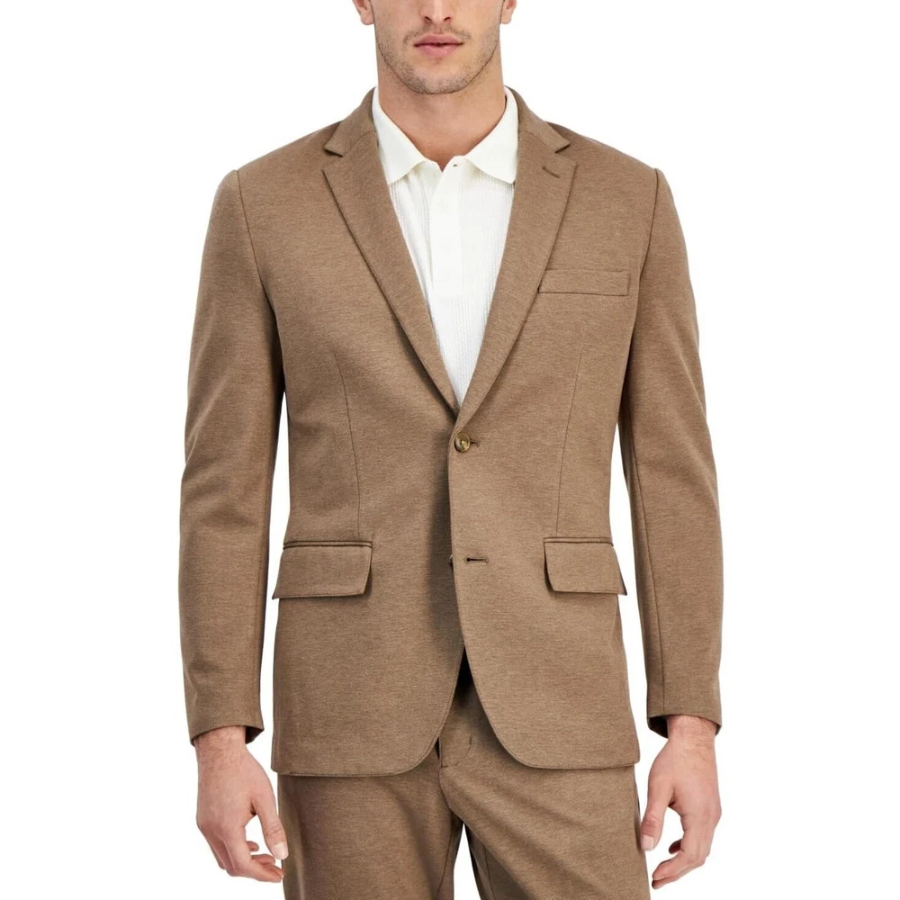 Alfani Men's Brown Heather Knit Stretch Rayon Modern-Fit Suit Jacket Size S New with tags MSRP $140 Style and comfort with the modern fit Athletic fit through the shoulders, chest and waist with higher armholes and trimmer sleeves Soft knit stretch fabric Center vent Notched lapel Two-button closure Four-button cuffs Two front flap pockets Left chest welt pocket Interior pocket Unlined 65% rayon, 30% nylon, 5% spandex Machine wash Length 29" Armpit to armpit 19" Sleeve 26" Shoulders 18"