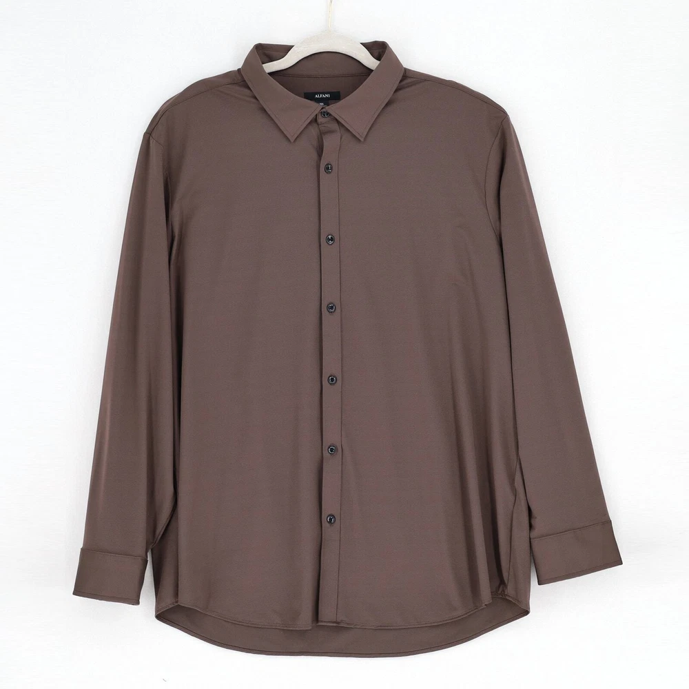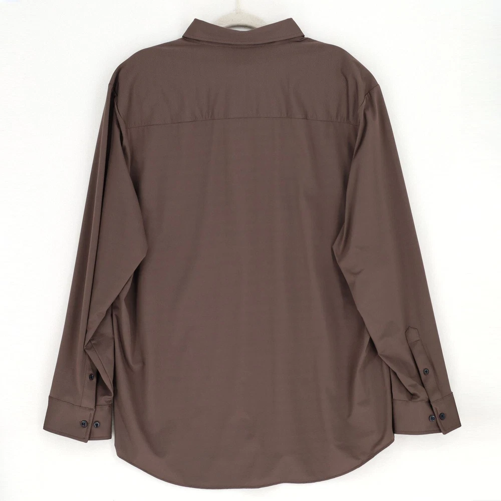 Alfani Men's Brown Jersey Yarn-Dyed Alfatech Casual Performance Shirt Size XXL New with tags Stretch knit fabric with built-in UV sun protection Point collar Button-front closure Long sleeves Button cuffs Classic fit 80% nylon / 20% spandex Machine washable