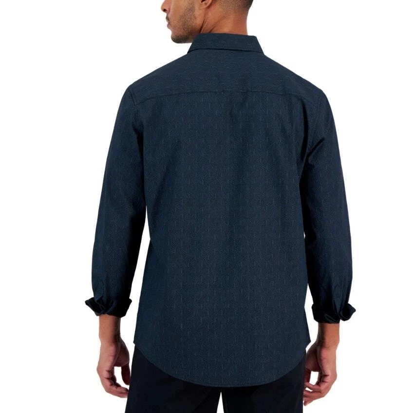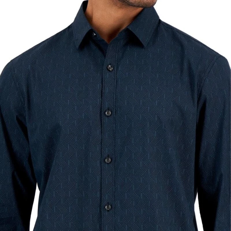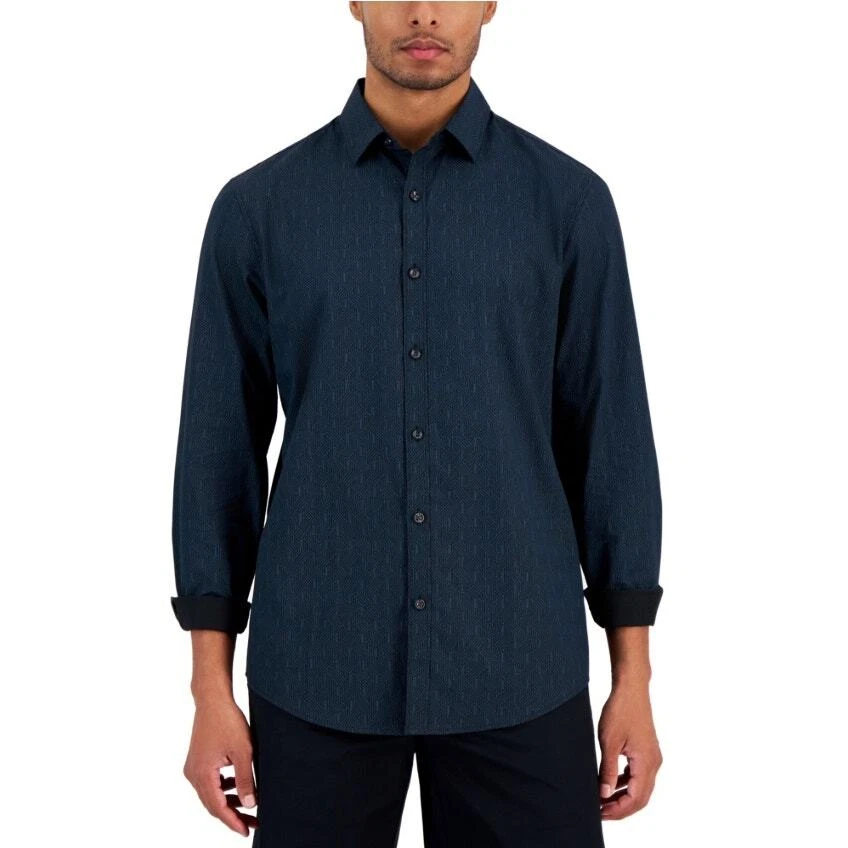 Alfani Men's Dark Blue Geo Print Cotton Long Sleeve Button Down Shirt Size S New with tags Allover geometric print Button up closure Regular fit Spread collar Long sleeves with button cuffs 100% cotton Machine washable Length 29" Armpit to armpit 21" Sleeve 25"
