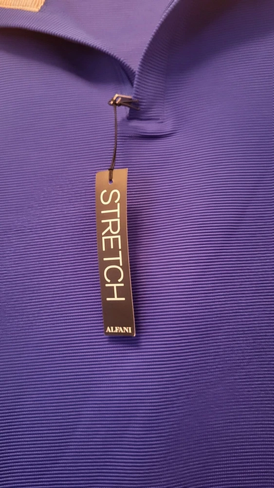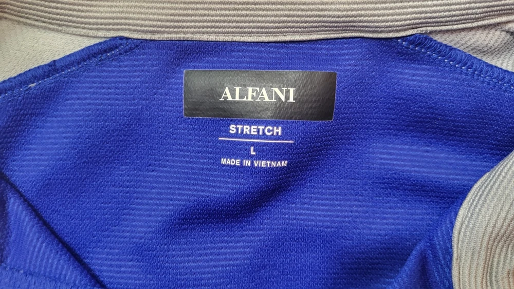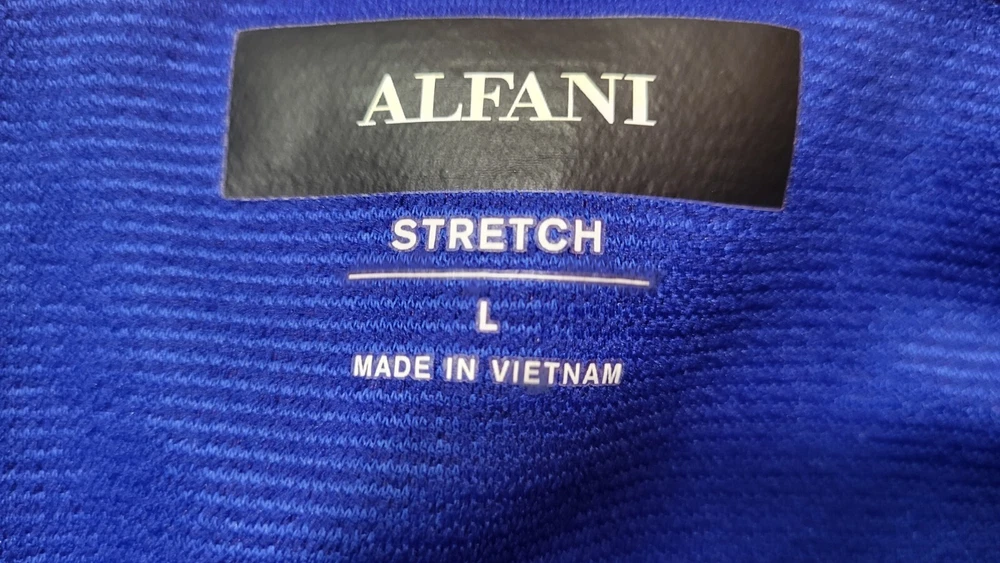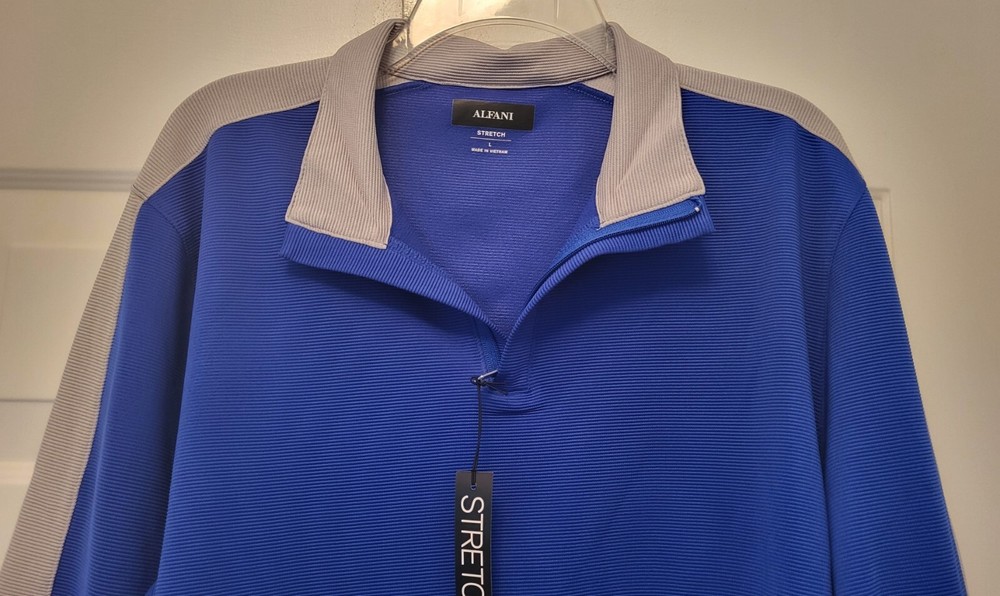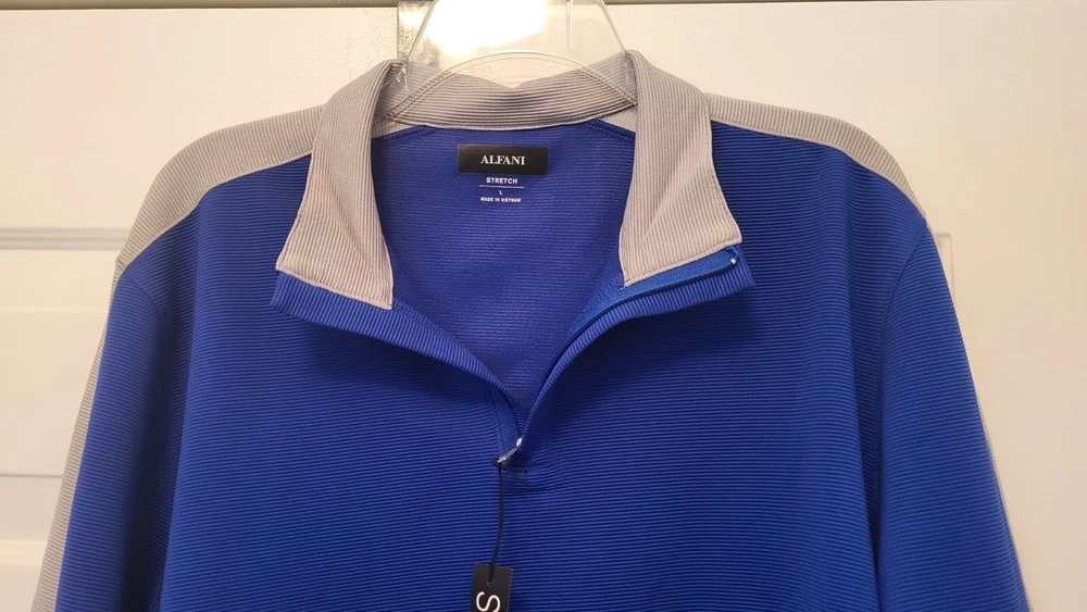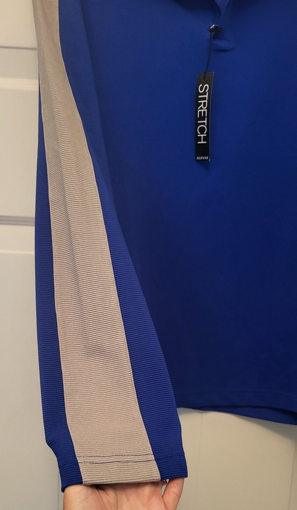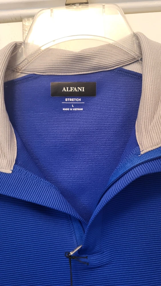 This Alfani pullover shirt is perfect for any casual occasion, with its comfortable and stretchy fabric blend. The dark wash polyester and spandex material is machine washable and easy to care for, making it a practical addition to any wardrobe. The shirt features a mock neck and quarter zip closure, with long sleeves and a regular fit. The blue and gray striped pattern adds a touch of style to the shirt, which is suitable for walking or school activities in the fall and winter seasons. The shirt is made in Vietnam and is available in size large, with a chest size of 46 inches. This casual shirt is a great choice for any man who wants to stay comfortable and stylish. Armpit to armpit measures 46 in Length is 27 in from shoulder to hem Excellent pre-owned condition shirt. Very comfy and stylish. Add it to your wardrobe today!