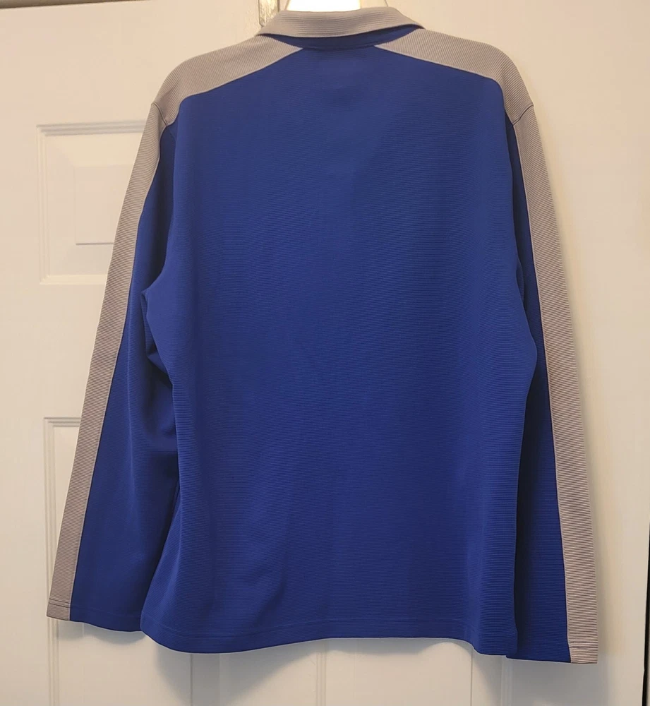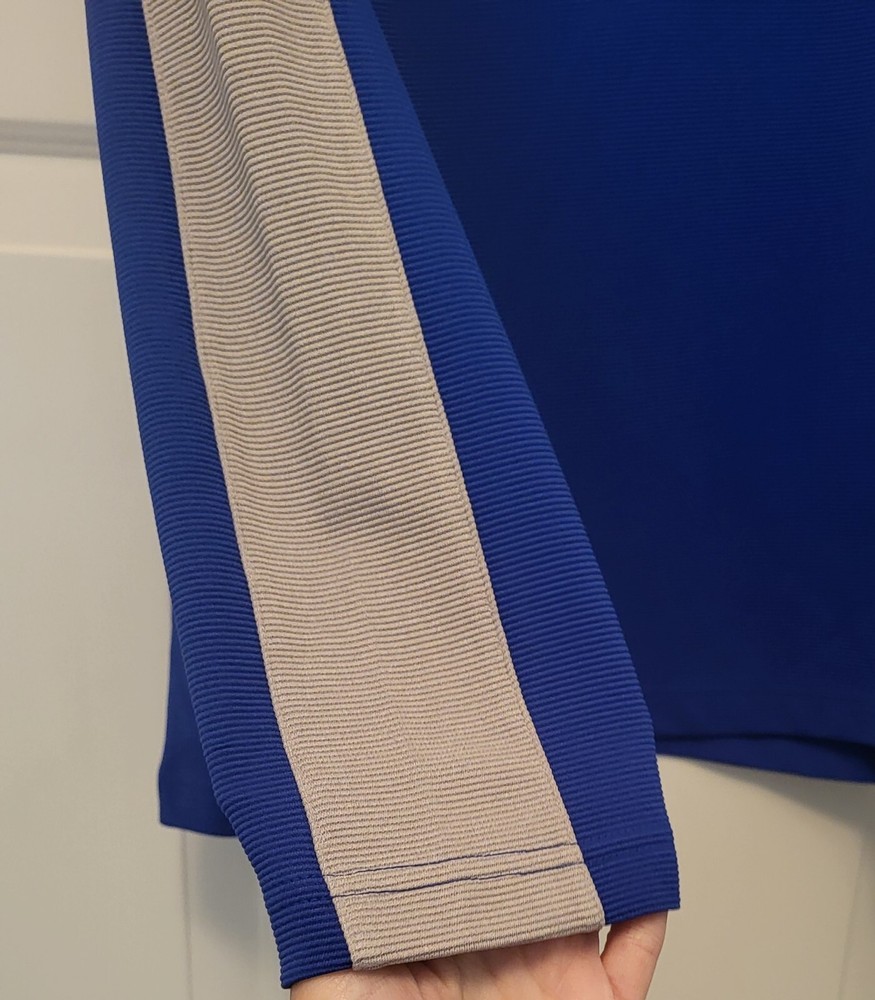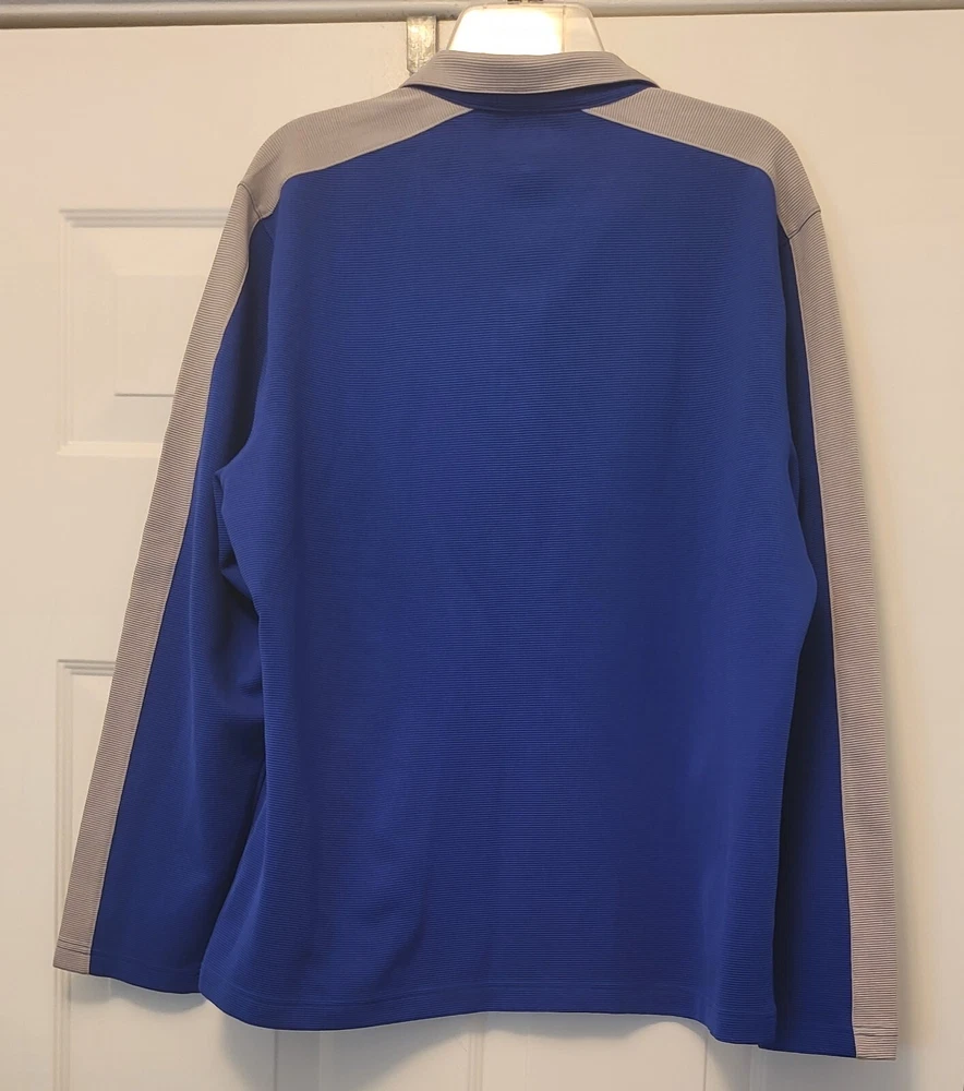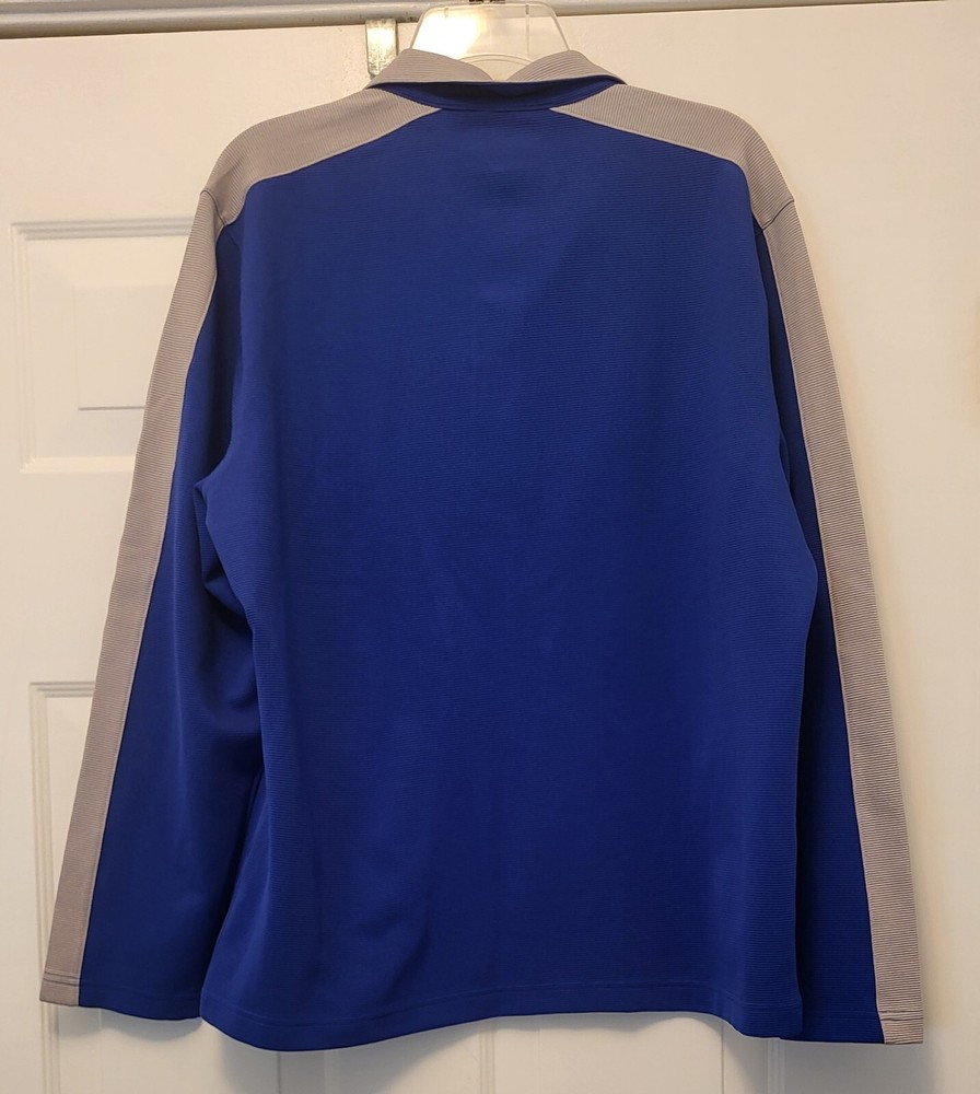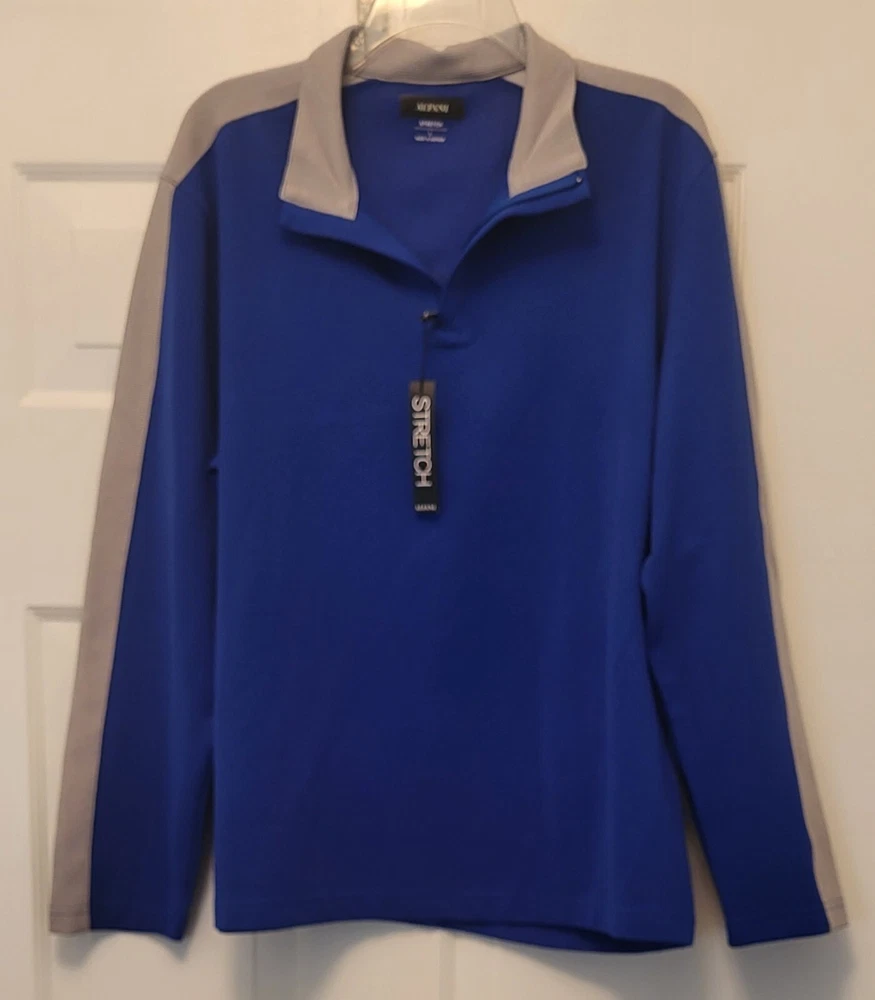This Alfani pullover shirt is perfect for any casual occasion, with its comfortable and stretchy fabric blend. The dark wash polyester and spandex material is machine washable and easy to care for, making it a practical addition to any wardrobe. The shirt features a mock neck and quarter zip closure, with long sleeves and a regular fit. The blue and gray striped pattern adds a touch of style to the shirt, which is suitable for walking or school activities in the fall and winter seasons. The shirt is made in Vietnam and is available in size large, with a chest size of 46 inches. This casual shirt is a great choice for any man who wants to stay comfortable and stylish. Armpit to armpit measures 46 in Length is 27 in from shoulder to hem Excellent pre-owned condition shirt. Very comfy and stylish. Add it to your wardrobe today!