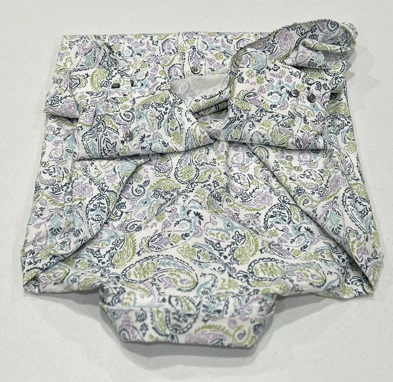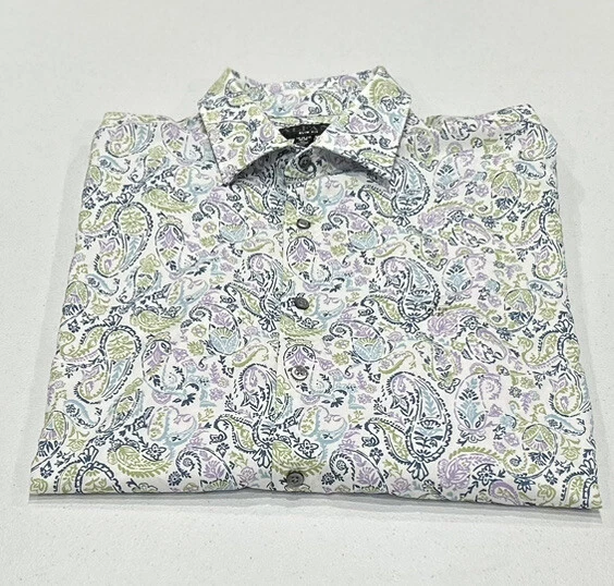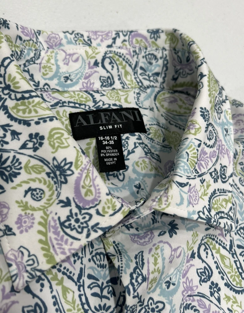 Alfani Men's Slim Fit 4-Way Stretch Paisley Dress Shirt Size: 16-16.5 (34-35) Color : White Lavender Contents: 92% Polyester, 8% Spandex