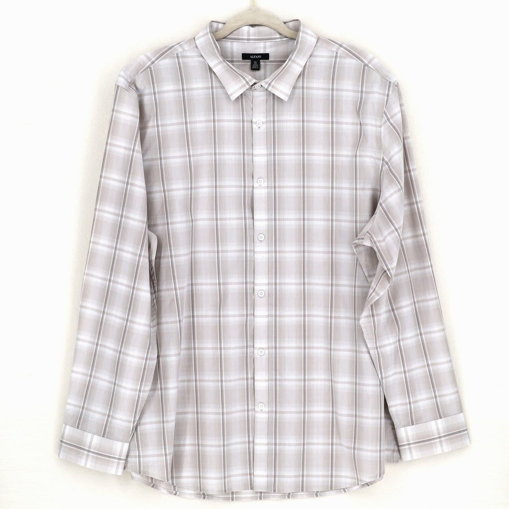 Alfani Men's White/Beige Cotton Plaid Print Long-Sleeve Button-Up Shirt Size XXL New with tags Regular fit Spread collar Long sleeves with button cuffs Plaid pattern OEKO-TEX Standard 100 certified 100% cotton Machine washable Length 32" Armpit to armpit 26.5" Sleeve 27"