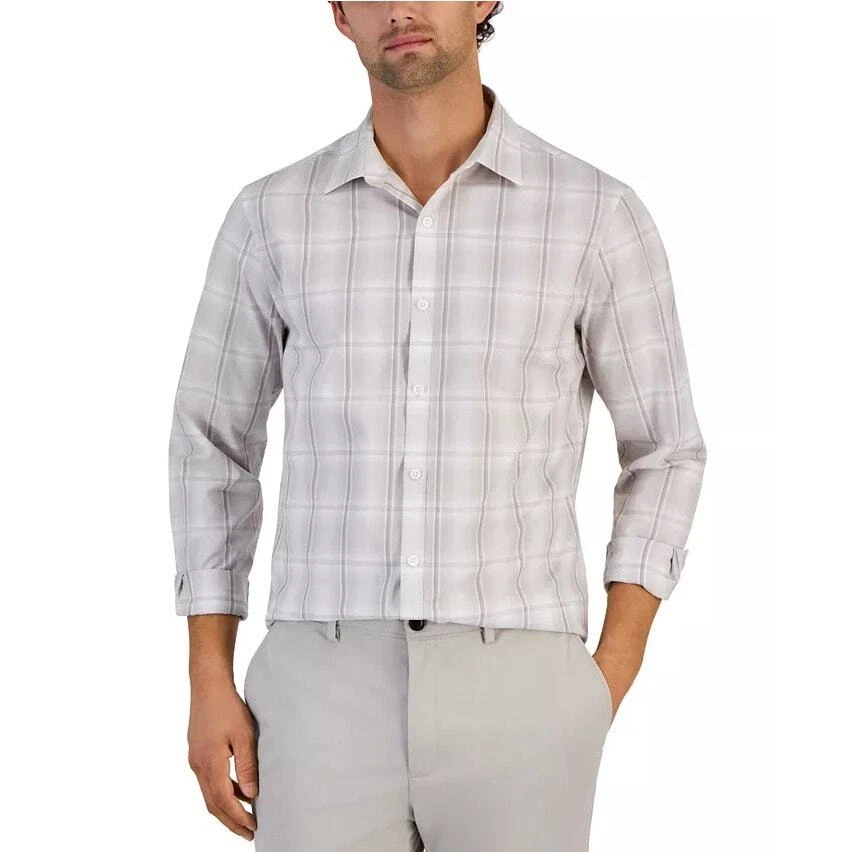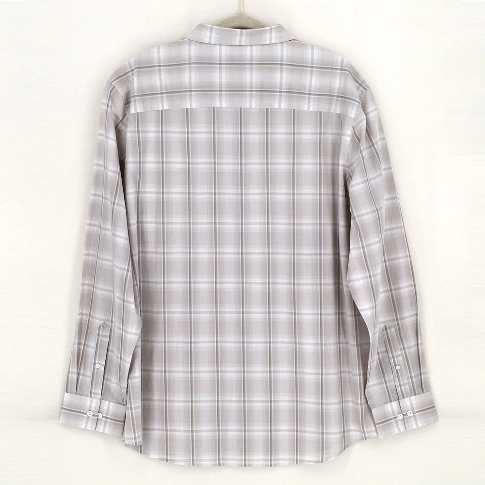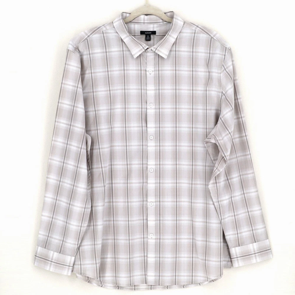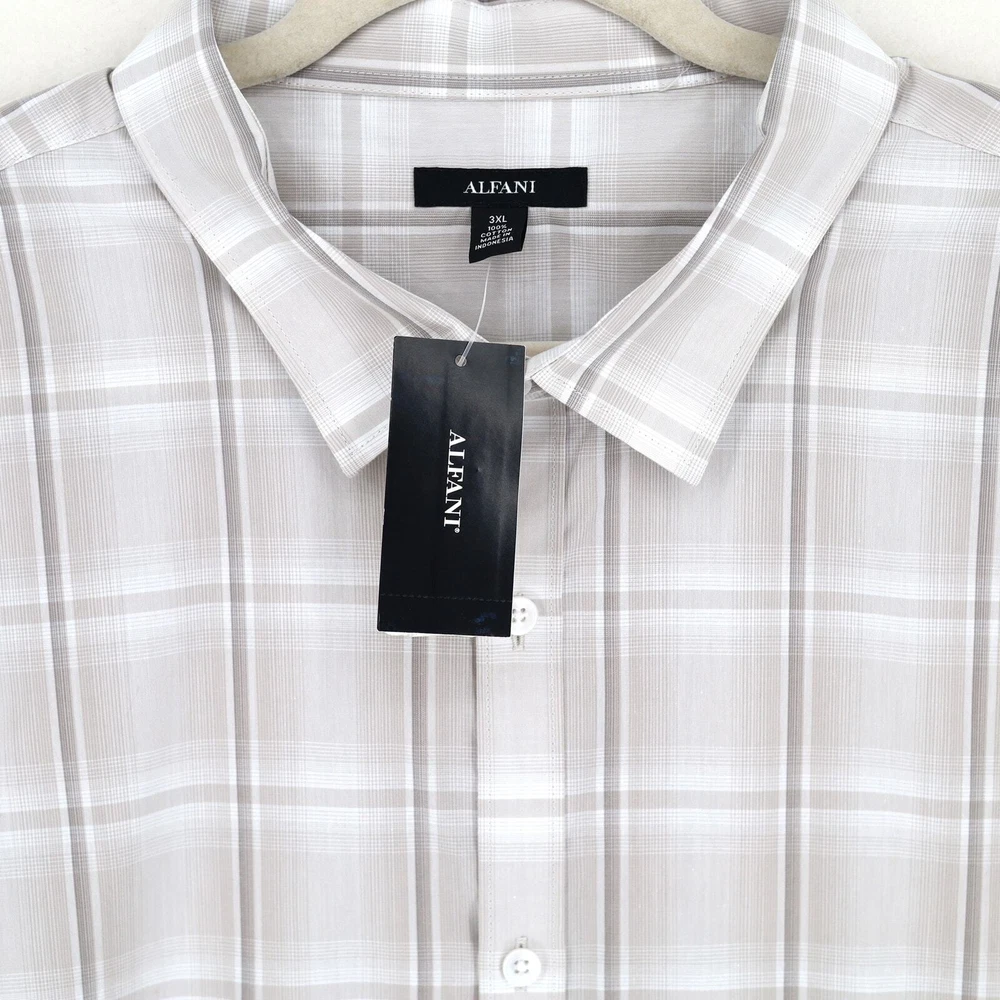 Alfani Men's White/Beige Cotton Plaid Print Long-Sleeve Button-Up Shirt Size 3XL New with tags Regular fit Spread collar Long sleeves with button cuffs Plaid pattern OEKO-TEX Standard 100 certified 100% cotton Machine washable Length 33.5" Armpit to armpit 29" Sleeve 27.5"