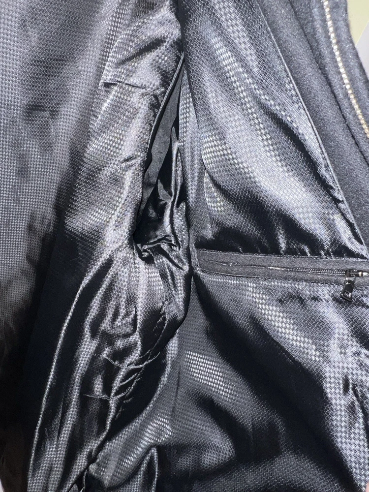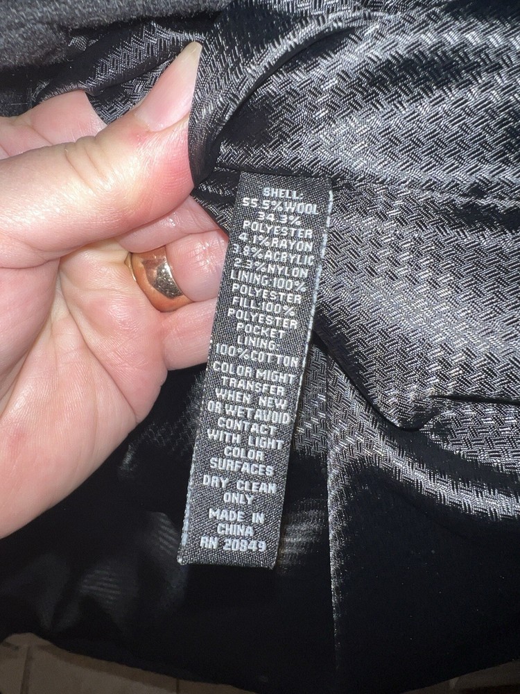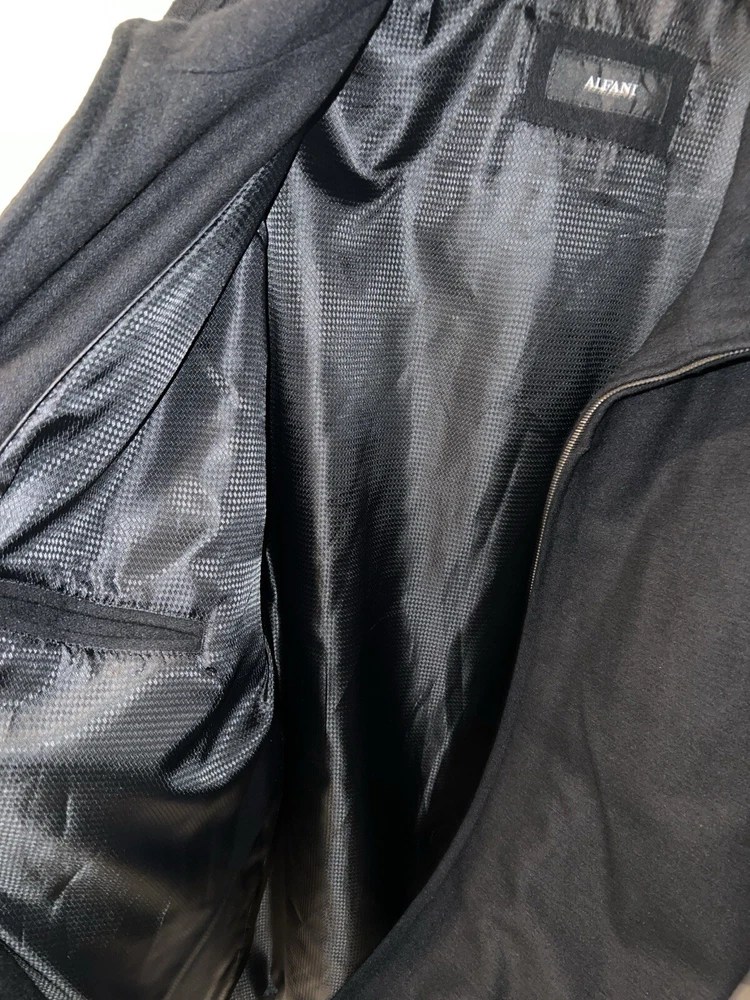 This Alfani men's overcoat is a must-have for winter. The full zip closure and outer shell wool material will keep you warm and stylish. The black color and XL size make it versatile and easy to wear. The coat also features a polyester lining material and a brand label of Alfani. Perfect for those who need a reliable and fashionable winter coat. Like new Pit to pit 26” Shoulder to hem 31” Shoulder to cuff 26”
