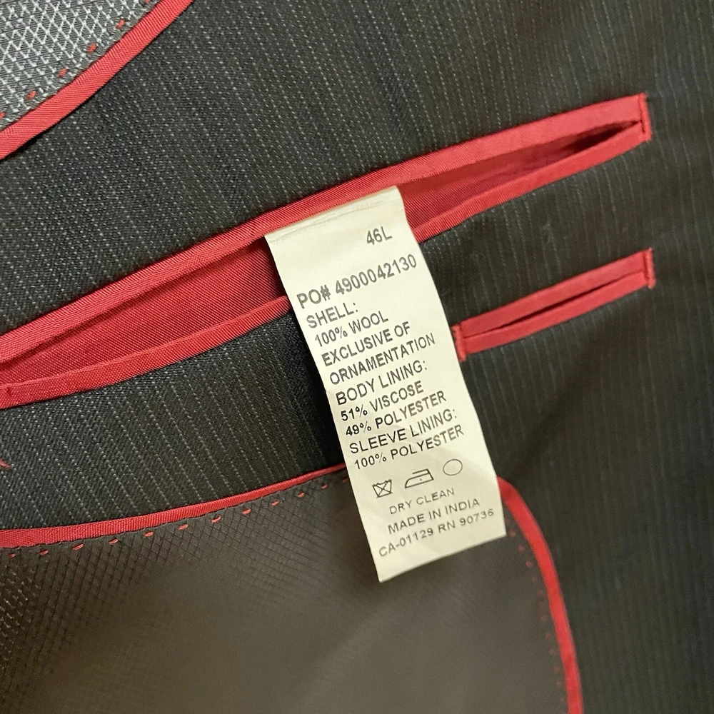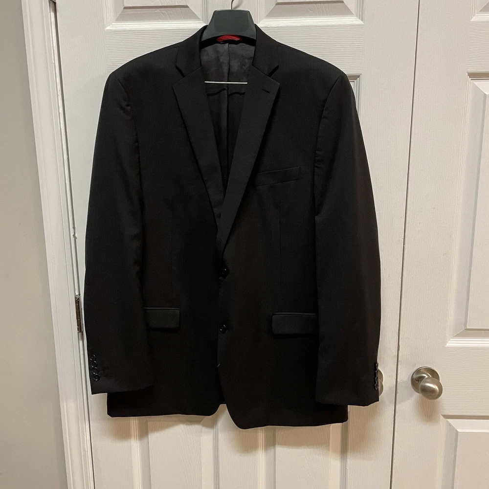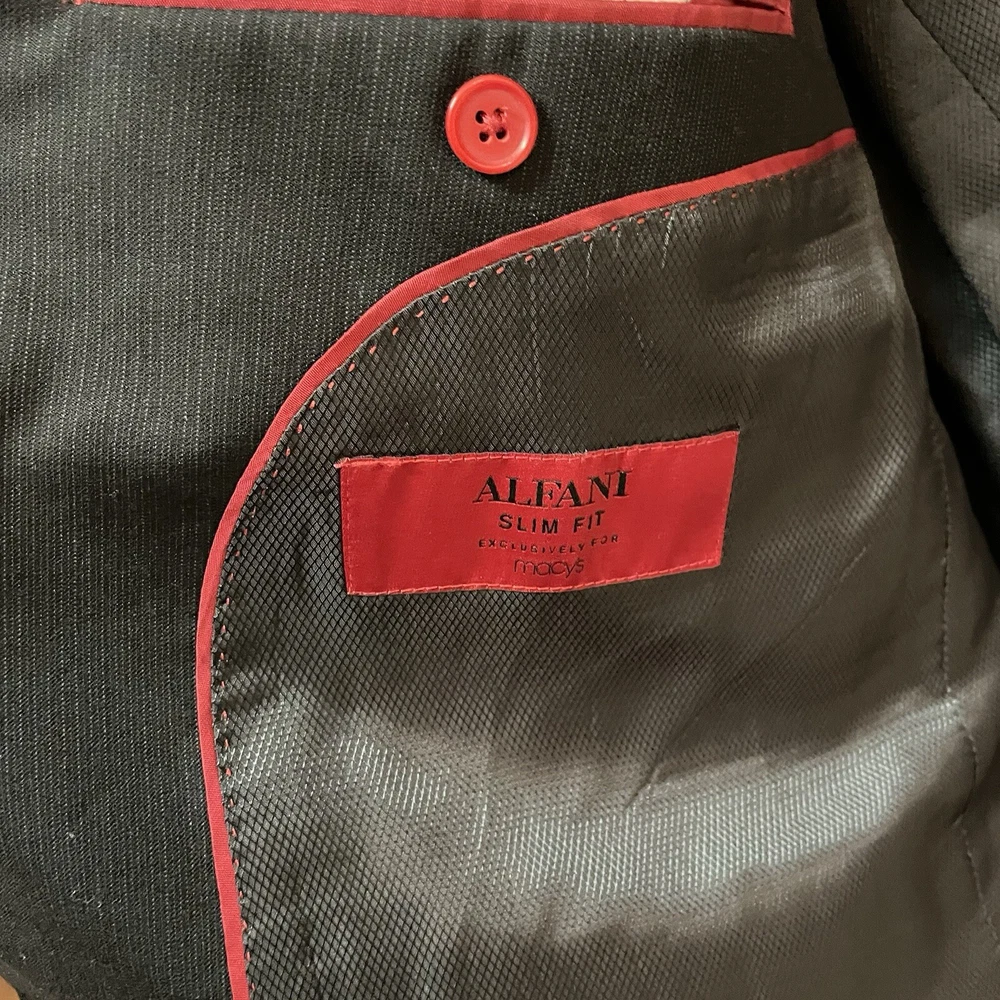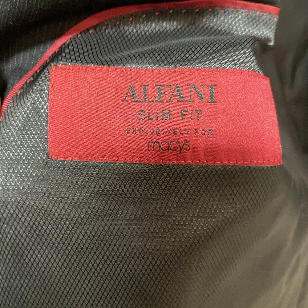 Pattern: Solid Lining Material: Viscose/Rayon Size Type: Regular Jacket Front Button Style: Two-Button Jacket/Coat Length: Long Style: 2 Piece Jacket Lapel Style: Peak Brand: Alfani Fabric Type: Rayon Jacket Cut: Single-Breasted Size: 46 Vintage: No Material: Wool Chest Size: 46 Occasion: Business, Casual, Formal, Party/Cocktail, Travel, Wedding Fit: Slim Department: Men Color: Black Theme: 80s, 90s, City, Classic, Outdoor, School, University, USA Type: Sport Coat