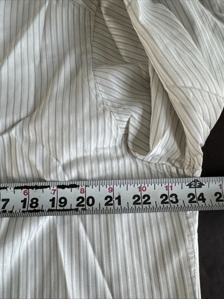 This shirt is so sharp it could cut through boring meetings. With its fitted cut and stretch fabric, it says "business" but feels like "couch." • Button-down front closure • Stretch fabric for comfort • Fitted design for a modern look • Long sleeves with buttoned cuffs • White with gray stripes for subtle flair No visible flaws noted. Top to bottom = 30 inches