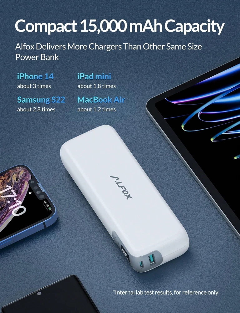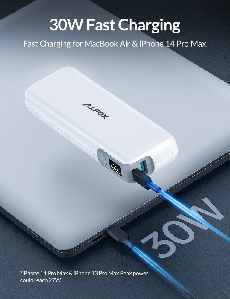 [ 15,000mAh Large Capacity]: With just one charge, this external battery can power iPhone 14 up to 3 times, iPad Pro 11 inches 1.1 times, and Samsung S22 2.7 times. Enjoy a constant source of fast charging. [️ Reckless 30W Recharging]: Unlike other power banks limited to 18W input, the Alfox portable charger supports PD3.0 protocol with a maximum 30W input. Recharge your 15,000mAh battery pack in a snap (about 2 hours)*. Charger not included. [ 1000+ Devices Wide Compatible]: Alfox battery pack supports multiple charging protocols, including PD fast charging for iPhone 15/14/13/12/11 Pro Max and PPS protocol for Samsung Galaxy S23/ S22/21/20 Ultra. Also compatible with iPad, Steam Deck, and more. [️ 5 Ways Comprehensive Protection]: Alfox power bank ensures your safety with over-charging, short-circuit, high-temperature, and surge protection. What you get: 1*15,000mAh Alfox power bank, 1*USB-C to C fast charging cable, 1*Velvet bag, 1*user manual. * The test was conducted using a variety of different iPhone models. After charging them for 30 minutes from 0%, the results show that the iPhone uses 30W power brick has 12% more power than the 20W