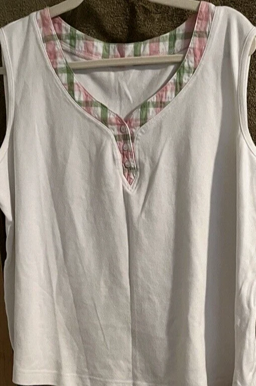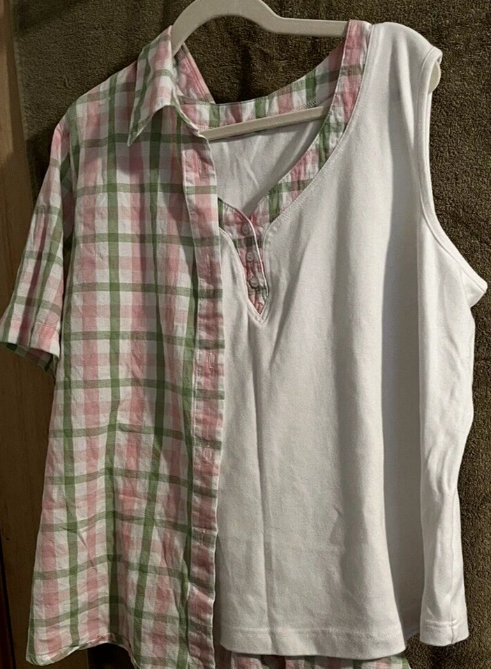 Neckline: V-Neck Personalize: No Closure: overshirt has button front Inseam: n/a Garment Care: Machine Washable Performance/Activity: n/a Fit: Classic Seller Notes: “Gently worn, with no defects or tears.” Brand: Alfred Dunner Fabric Type: Cotton and Polyester Number of Pieces: 2 Piece Size: 20W Handmade: No Department: Women Size Type: Plus Country/Region of Manufacture: Indonesia Accents: V-neck tank top inside a collared shirt Vintage: No Season: Fall, Spring, Summer Occasion: Casual Character: n/a Sleeve Length: Short Sleeve Character Family: n/a Color: White with pink/ sage checkered print Features: 2 shirts - worn together or separate Pattern: Check Set Includes: tank top and overshirt Leg Style: n/a Theme: n/a Type: Outfit/Set Material: Cotton, Polyester