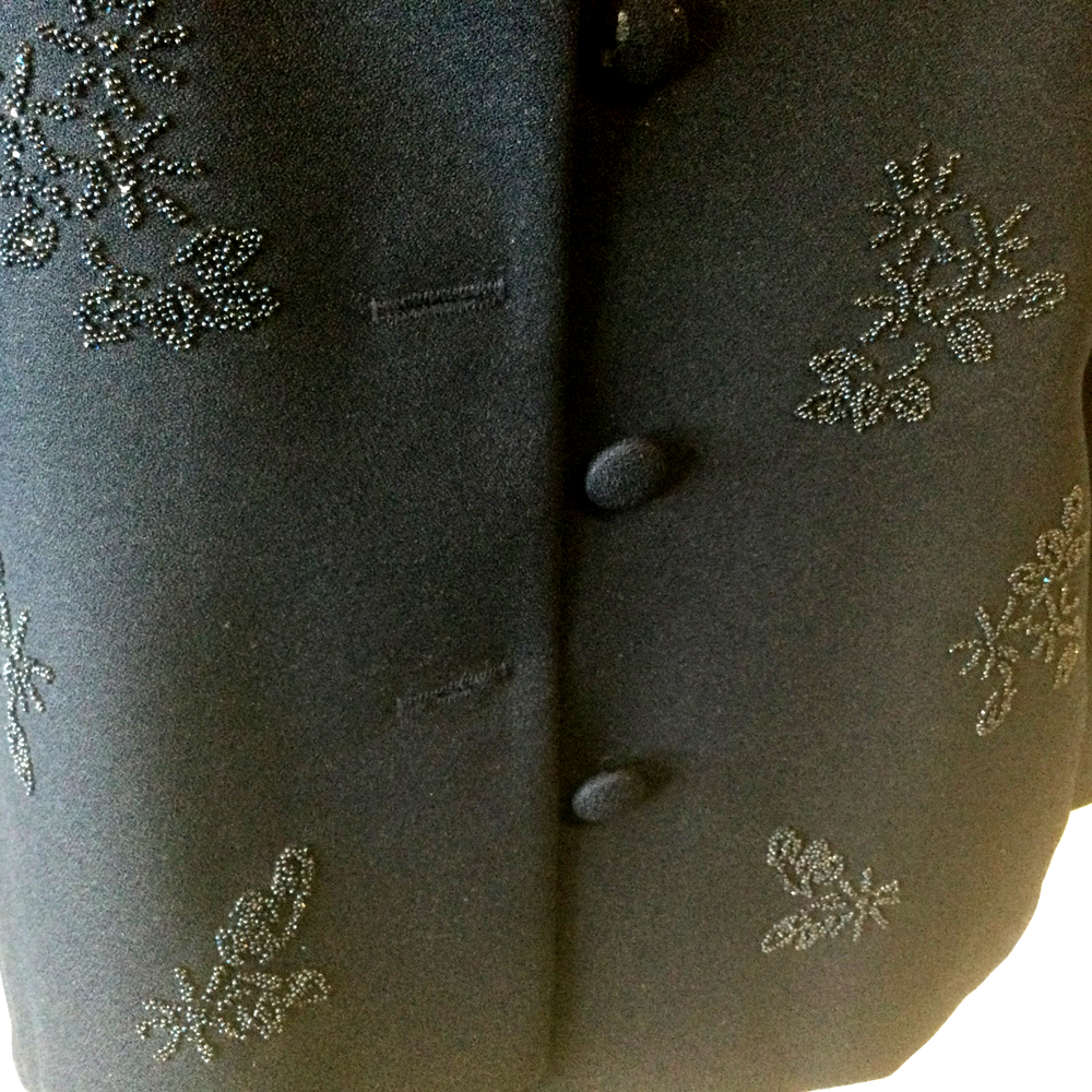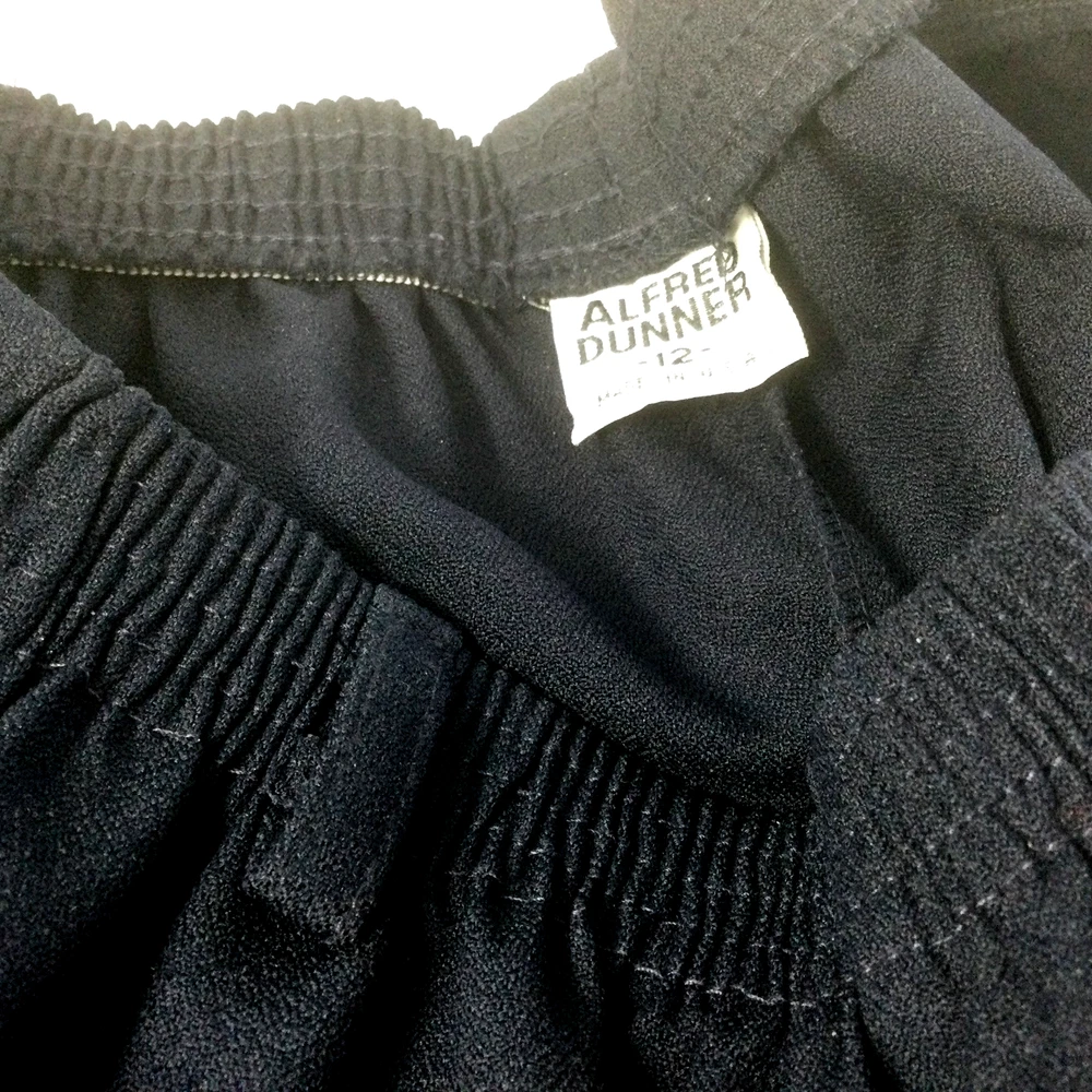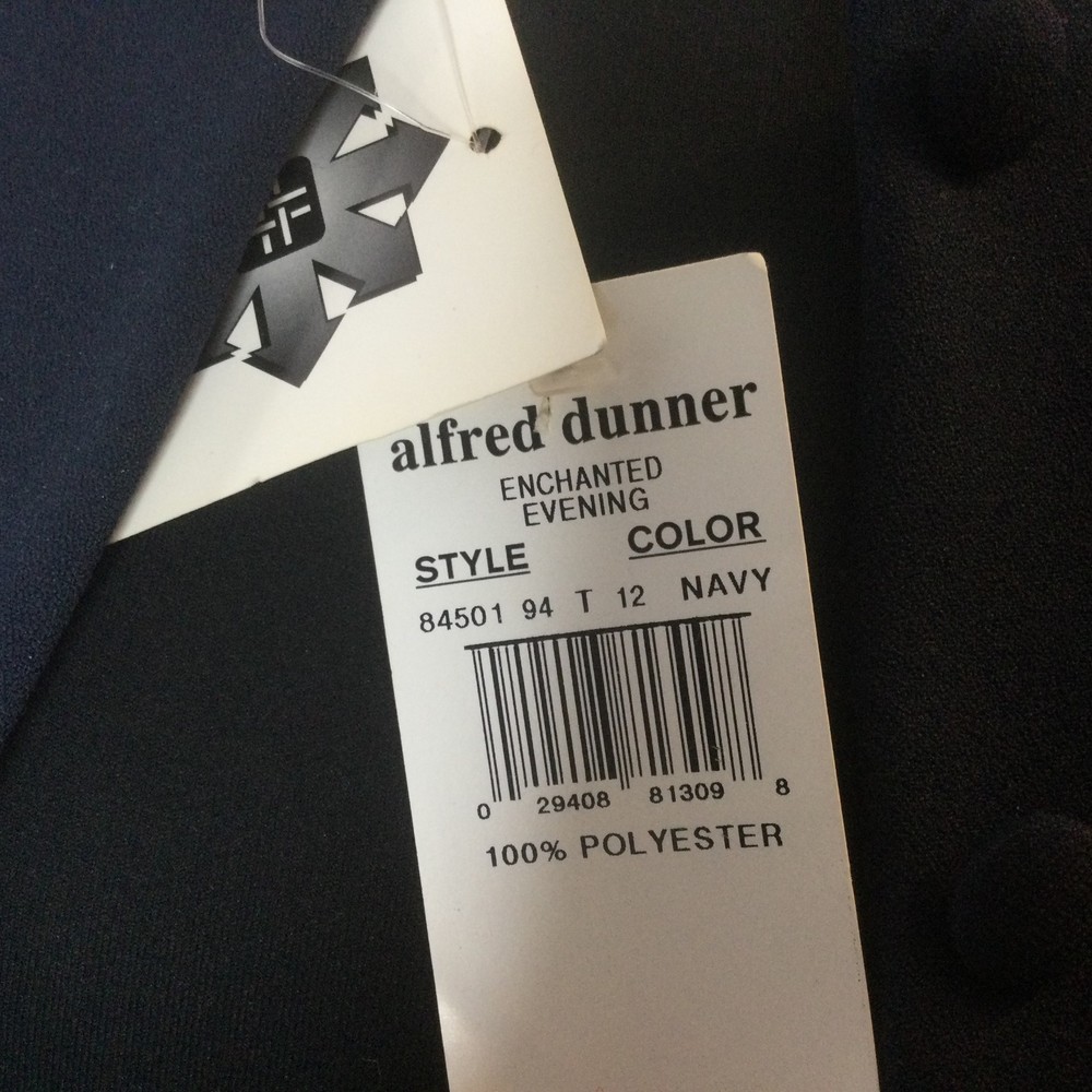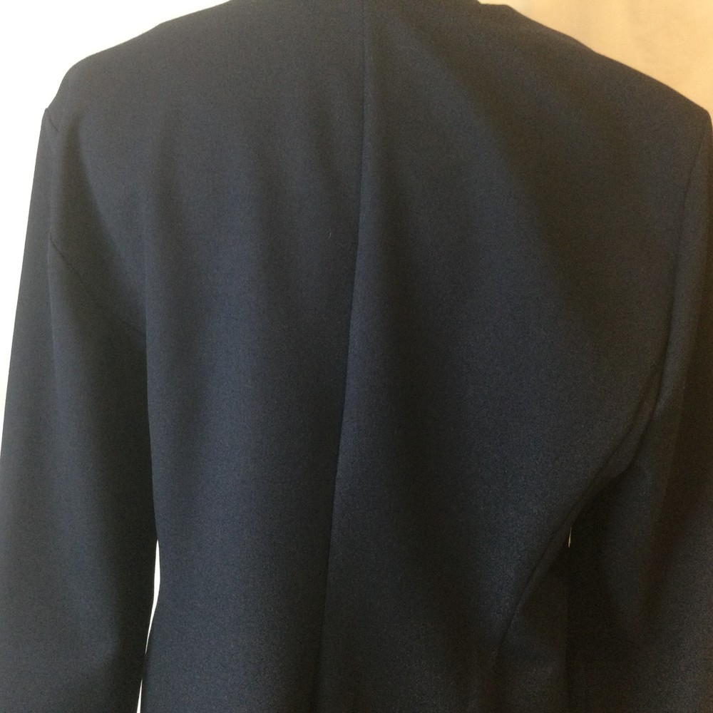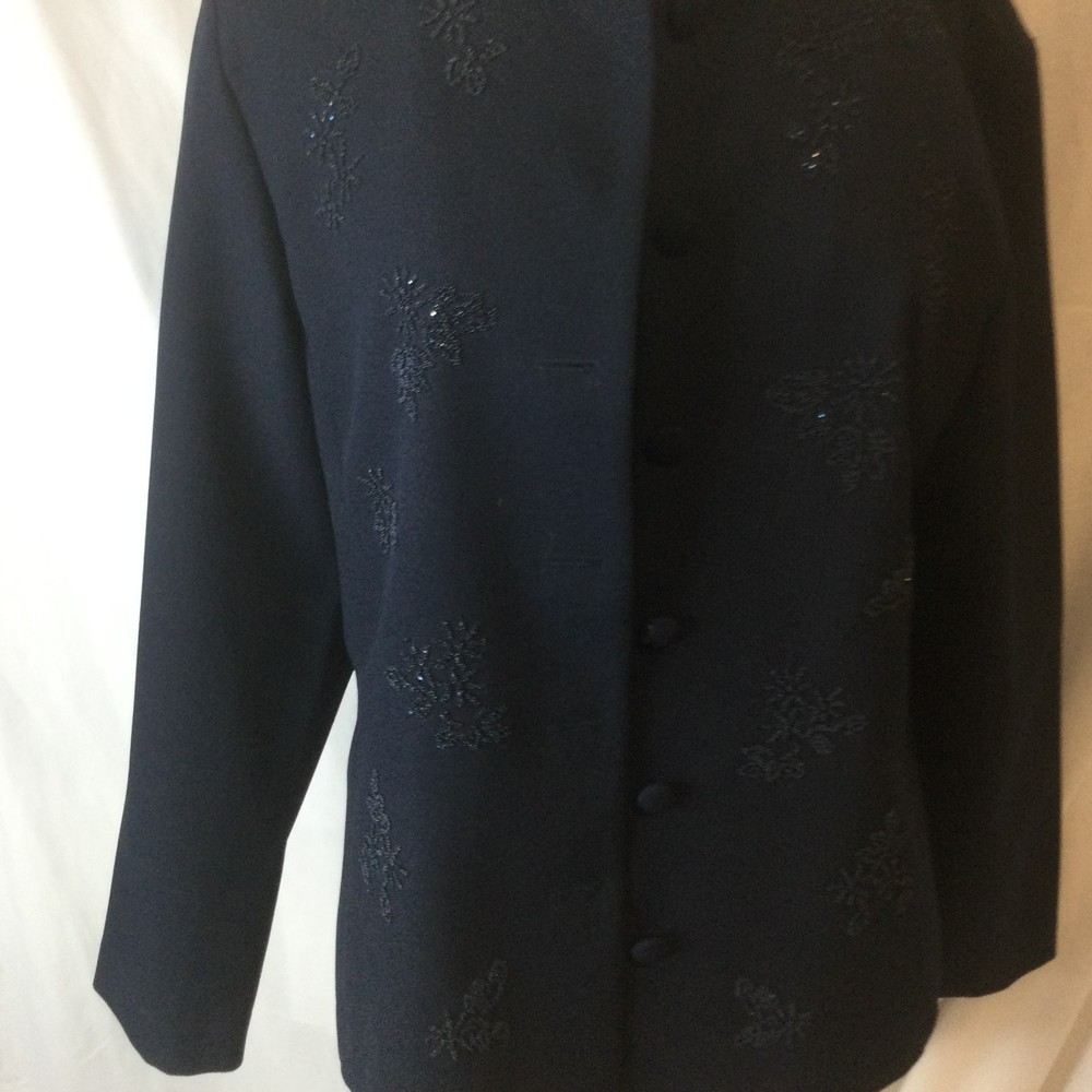 Alfred Dunner Vintage Women Suit Jacket , siz 10. Pants Navy Blue Beaded, siz 12. Stretchable fabric. Pants have elastic waist, it can stretch from 28" to 34". Inseam 15" Length 42", leg is narrowing down a little. 2 side pockets. Loops for belt. Jacket is beaded with the same blue color beads. Round neck line, 5 buttons up. 2 side pockets. Length 26" Sleeve 24" Pit to pit, closed InvN/GWB/3