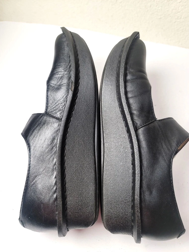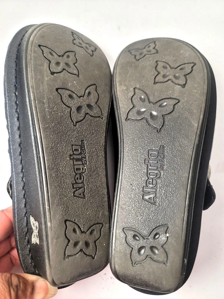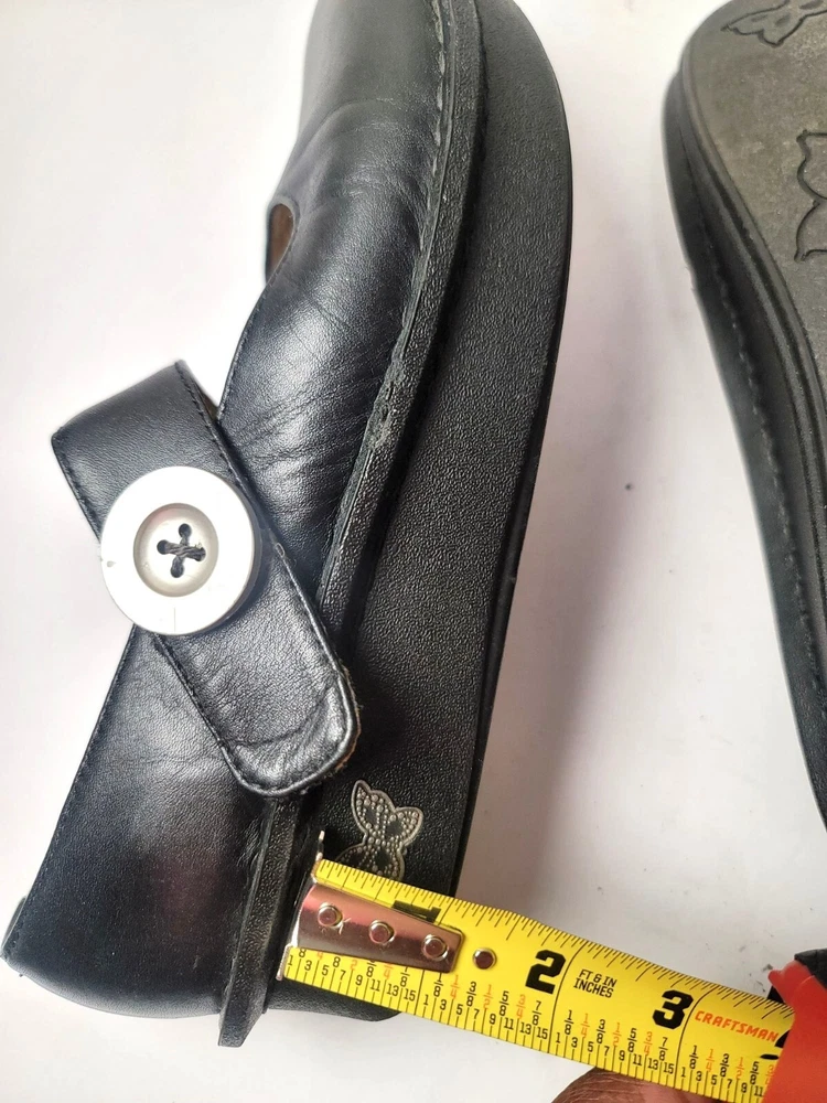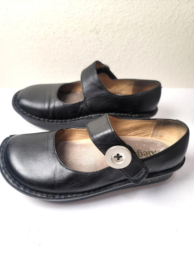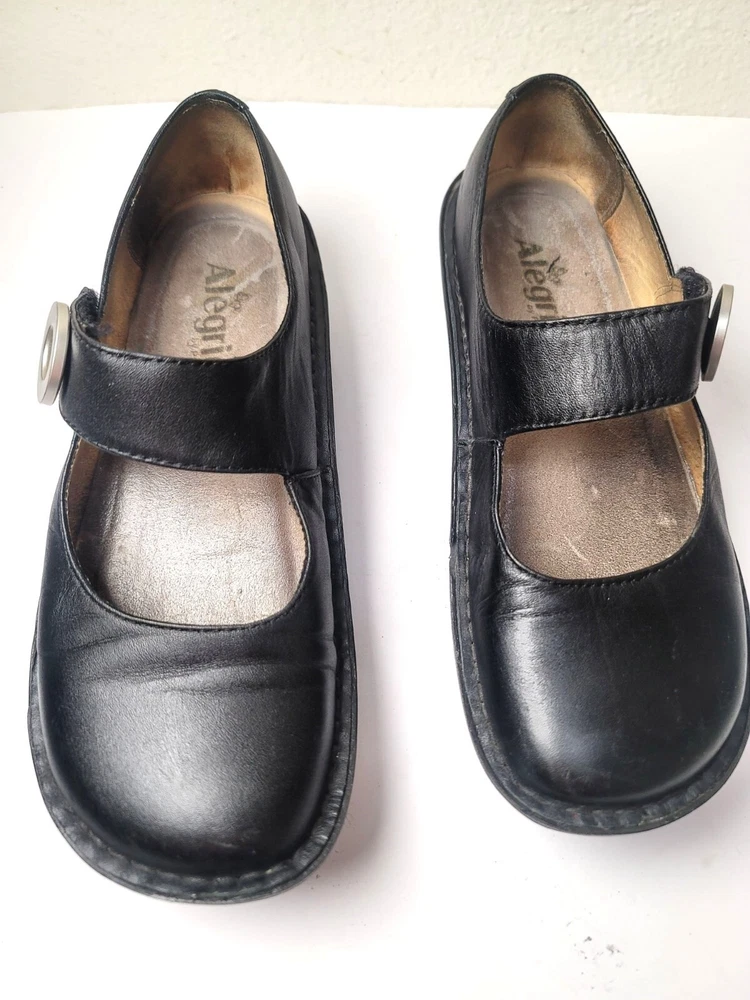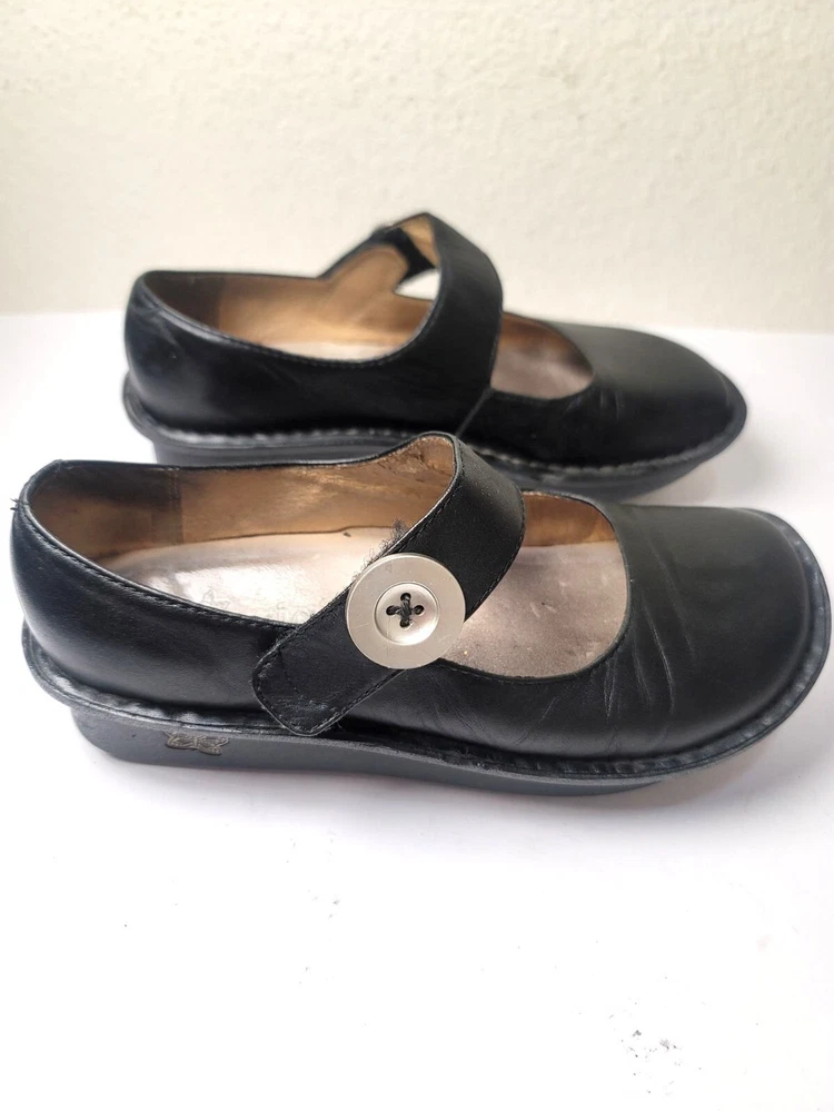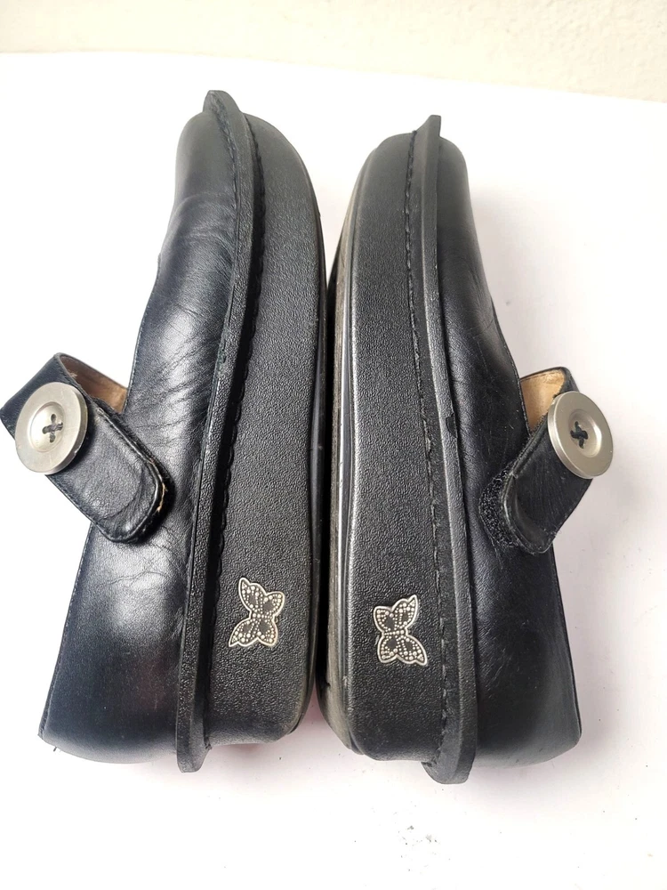 These Algeria Mary Jane shoes offer a timeless design suitable for various professional settings. The black leather construction provides durability and a polished appearance. The shoes feature a comfortable fit, ideal for long hours of wear. • Button closure for secure fit • Sturdy sole design • Round toe shape • Embossed butterfly logo on sides Top to bottom = 9.5 inches CONDITIONS pre owned, minor wear and scuffs on the side, good conditions. see photos for flaws details.