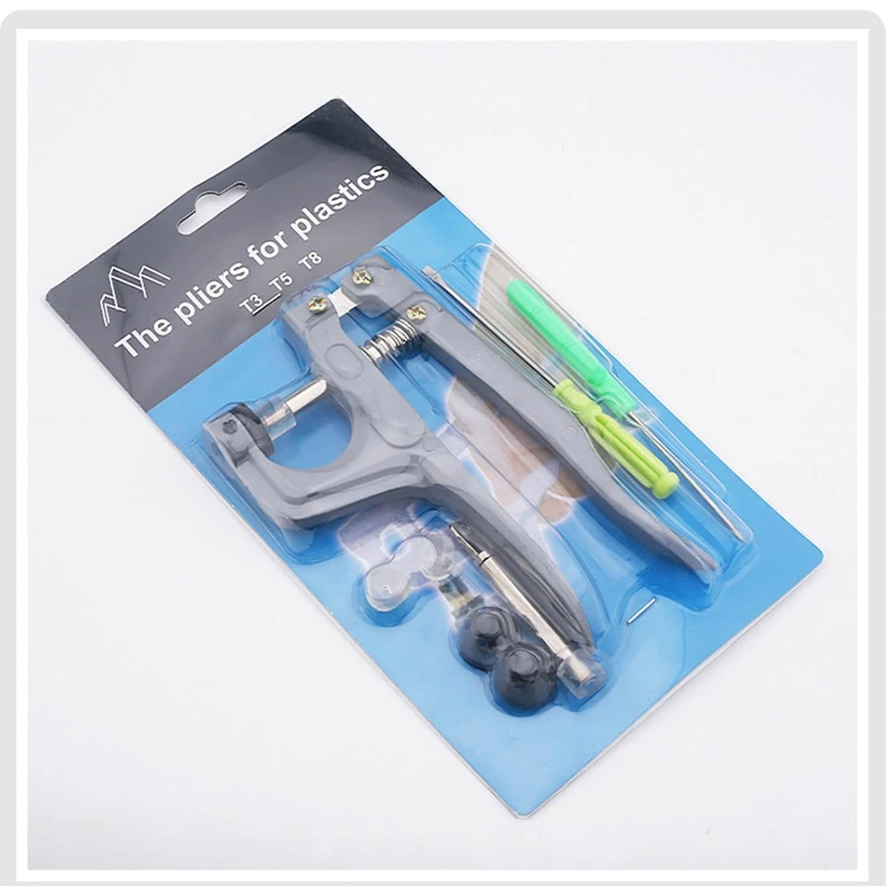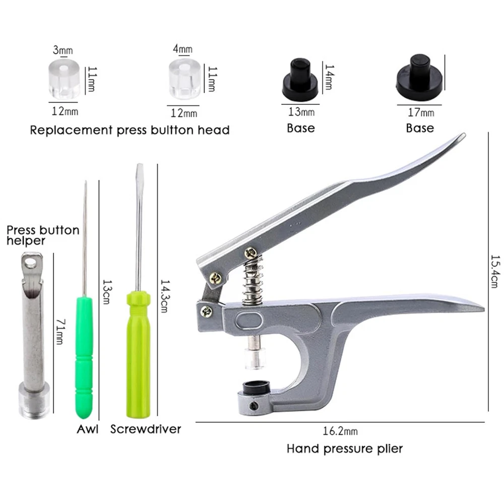 Snap Pliers for Crafts Clothing, KAM Plastic Snap, Fastener Press Attacher Punch You will get: Snap pliers kit includes 1 pliers, 1 T3 black base, 1 T5 black base, 2 spare rubber, 1 T8 push rod, 1 awl, 1 screwdriver. Easy to Use: The snap button pliers is very easy to use, it only takes a few seconds to install. Instructions are included in the package. You can also search on Youtube about HOW to snap. Attention: The pliers CANNOT install metal snaps, ONLY work with plastic snaps. Attention: If you're not good at it or using it for the first time, we suggest that you can practice with an unwanted cloth. High Quality: These pliers tools are made of high quality aluminum and are very strong and durable for a long time of use. Equipped with spring pressure bar, it is flexible and effortless to use, small and easy to hold. It is an indispensable craft tool for women, professional or beginner tailors. Wide Application: Suitable for cotton, baby clothes, bodysuit, shirts, shoes, bib, skirt, one layer of denim, DIY crafts, cloth made items, other embroidery, craft, sewing and various household projects. 3.5 inches x 5.0 inches x 0.7 inches. Weight: 8.47 oz Item model number H2-Snap Pliers Color sliver Product Dimensions 5 x 3.5 x 0.7 inches; 8.47 ounces Material Aluminum Country of Origin China Head Style cap Model Name H2-Snap Pliers