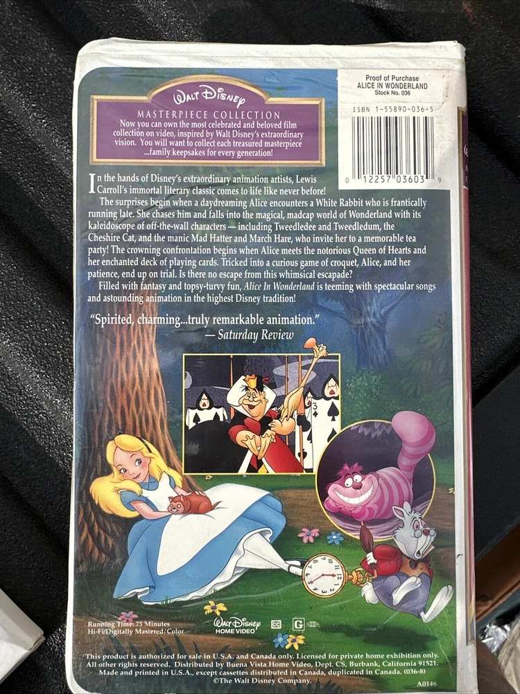 Experience the magic of Alice in Wonderland with this VHS tape from 1997, brought to you by Walt Disney Home Entertainment. This classic fantasy animation & anime film is a must-have for any fan of the genre, featuring English language and NTSC signal standard. Join Alice on her magical adventure through a world of wonder and danger, surrounded by beloved characters and stunning animation. This VHS tape is perfect for collectors and fans alike, and is sure to bring hours of entertainment and enjoyment. Don't miss out on this timeless classic and add it to your collection today.