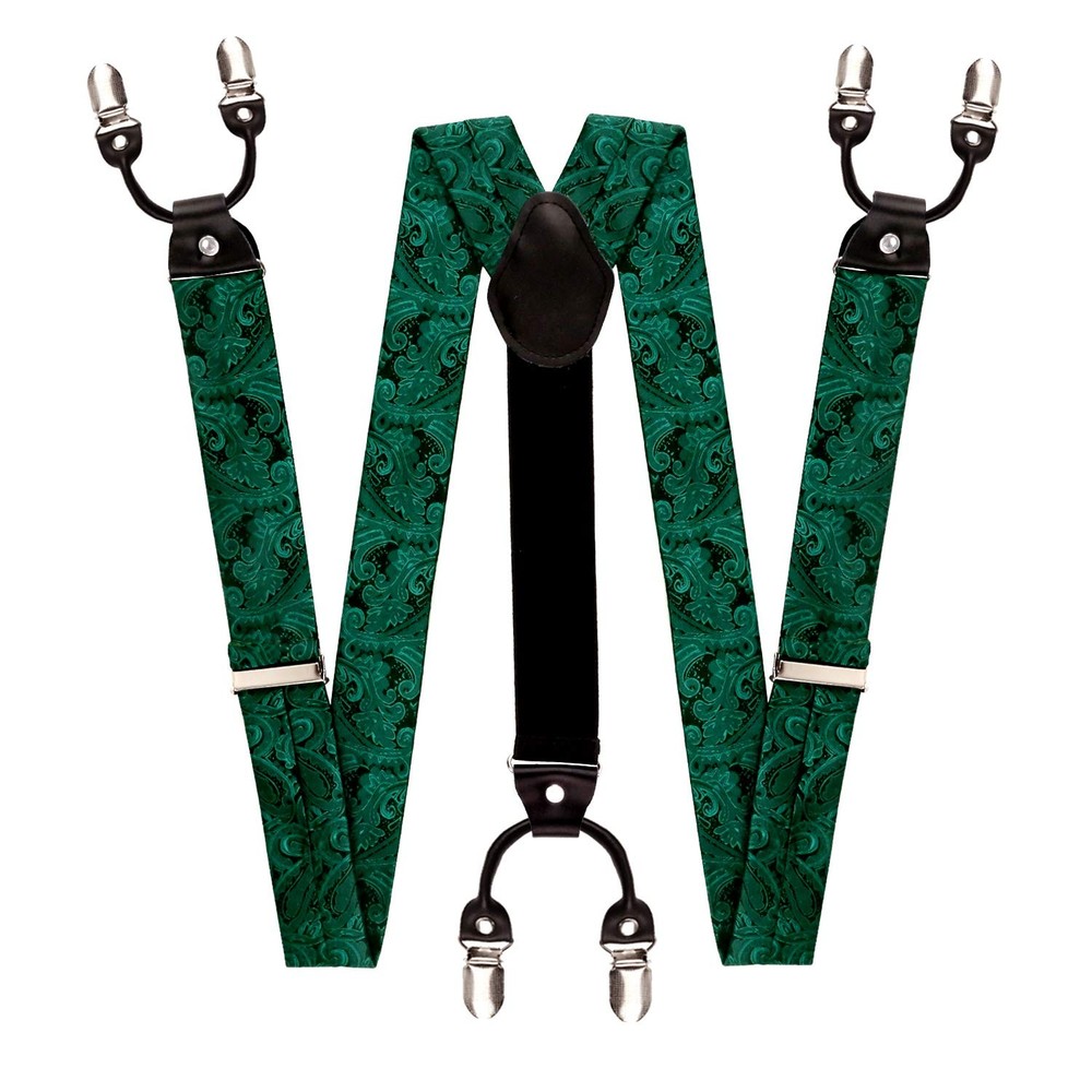 suspender [Package Includes] 1*Y Shape 6 Clips Suspenders and 1* Self-tied Bow tie (you need to tie it yourself) & 1*Pocket Square [Size] The bow tie measures approximately 4"(L)x2.5"(W) on ends when tied; Adjustable neck sizes are approximately 14.5" to 20". The pocket square size is 25*25cm (10"*10"); The width of the suspender is 3.5cm (1.38"). The back part of the suspender is elastic and adjustable (total length: up to 58" (include the length of the clips)) [Special Paisley Design] Suspenders and bow tie with the pocket square paisley pattern set with various colors to choose from to find your favorite type. And each suspenders and bow tie with the pocket square set is crafted by hand and heart, adopting the elegant and classic paisley design [High Quality] This paisley suspender is designed with 6 strong metal clips, which are not easy to rust, not easy to fall off, and not easy to deformation [Occasions] Suitable for most occasions: prom, birthday, wedding, engagement, party, business, office, meeting, or any other special event