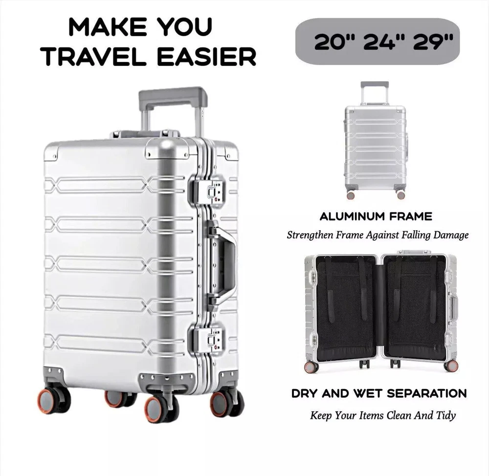 Product Page Product title: All Aluminum-magnesium Alloy Travel Suitcase Men's Business Rolling Luggage on Product description: FREE SHIPPING 30 DAYS RETURN EASY PAYMENT All Aluminum-magnesium Alloy Travel Suitcase Men's Business Rolling Luggage on REVIEWS The product came very well packaged. I'm very happy. thank you for everything. Seller strongly recommended. This is great! I definitely recommend! Product looks amazing Delivery was fast. Excellent seller, great communication. I advise everyone Main image: Sub images: