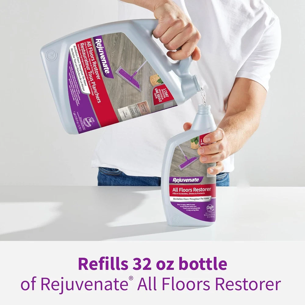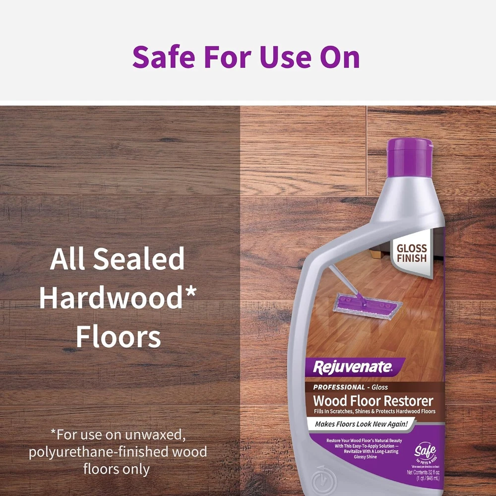 Fills in scratches and restores shine to all floor types including wood, laminate, vinyl, tile, linoleum, and terracotta. Revitalizes polyurethane-finished wood floors by filling scratches and bonding to the existing finish to resist stains and spills. Easy mop-on application provides up to 2,600 sq. ft. of coverage with the 128 oz bottle. Leaves a beautiful, glossy finish on hardwood floors with no waxy buildup. Made in the USA formulas are perfect for restoring residential and commercial floors.