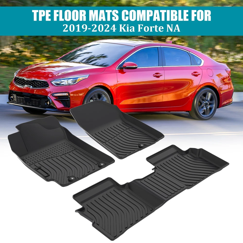 Fitment: 2019-2024 Kia Forte Package Include: 2 ×Front Floor Mats 1 ×Rear Floor Mat Features & Benefits : 1.All-Weather Protection: These floor mats are designed to withstand temperatures from -40°F to 122°F, effectively trapping sand, water, mud, dirt, and rain to protect your vehicle floor from messy accidents and moisture. 2.Custom Fit & Non-Slip: Tailored to fit your vehicle's exact dimensions, these mats provide maximum coverage and will integrate seamlessly with your car's interior. The 3D extended border ensures no slipping during use. 3.Durable & Environmentally Friendly: Made from high-intensity TPE material, these mats offer better temperature resistance than PVC and are extremely wear-resistant, even in extremely cold weather. They contain no harmful substances such as cadmium, lead, or PVC. 4.High-Quality & Protective: Created using high-tech 3D digital laser scanning, these rubber floor liners protect the front and back of your car footwell. They are durable, fade-resistant, waterproof, and antifouling, effectively extending the service life of your vehicle floor. 5.Easy to Clean: Simply remove the floor mat from the car, wipe with a wet towel, or rinse directly, ensuring no detergent is left. Allow them to dry in a well-ventilated place, either hanging or laying flat.
