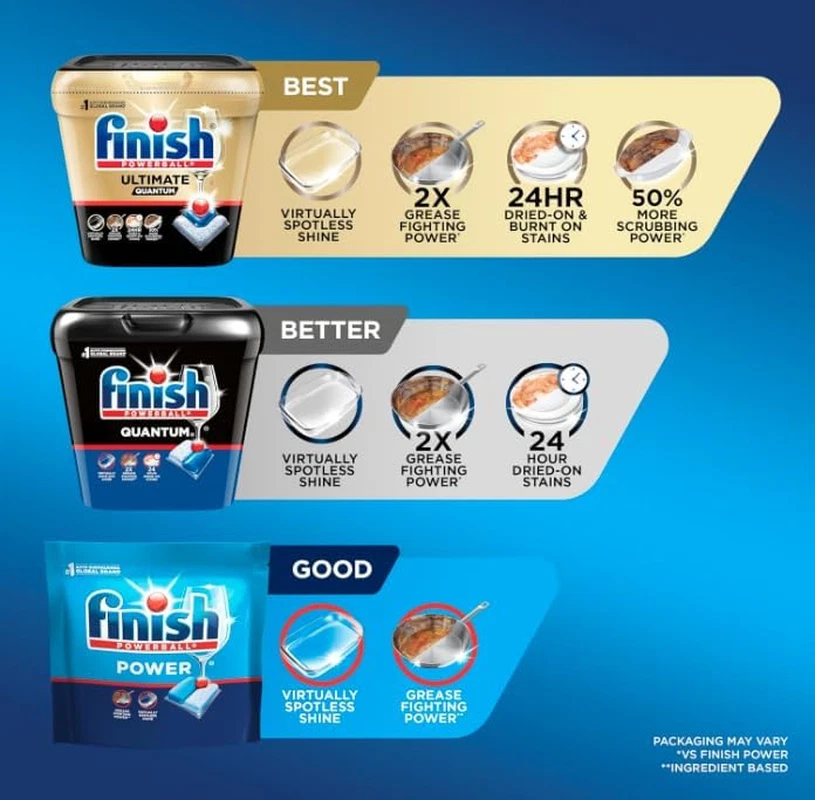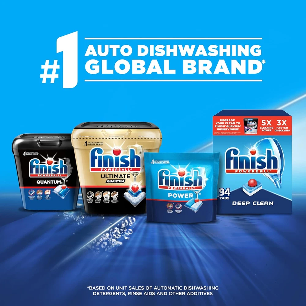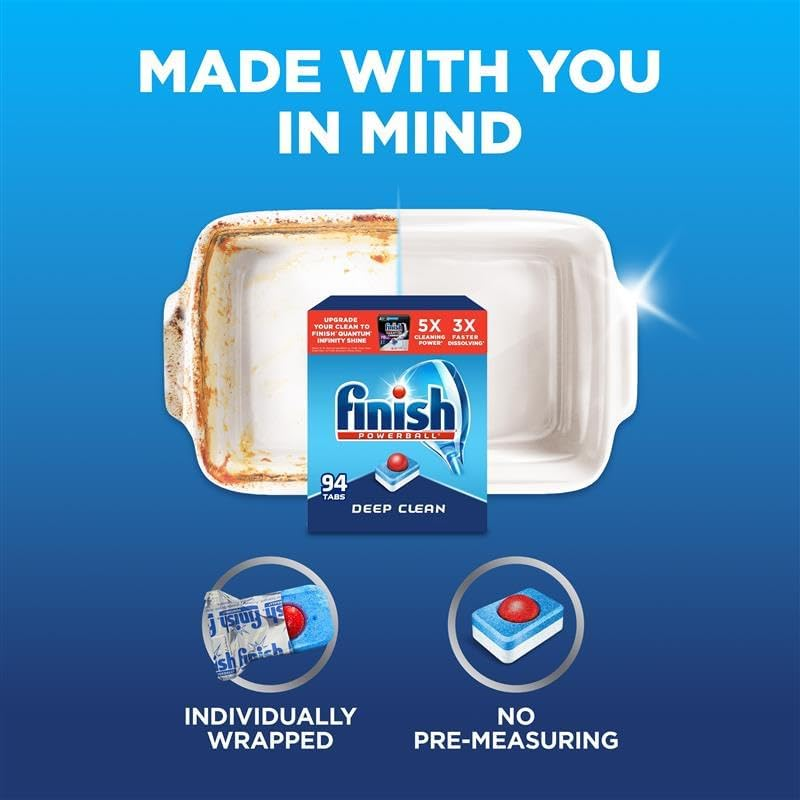 Help soften the toughest food residues like baked-on lasagna and dried-on oatmeal for easy removal Powerful cleaners remove even the toughest stains. No need to pre-soak or pre-rinse with Powerball cuts through grease & scrubs away burnt & dried-on food Each individually wrapped Finish Powerball tab provides a premeasured dose of detergent, eliminating guesswork and dissolves completely Rinse agent action helps rinse away residues, eliminating spots and film for a sparkling shine Finish is the worldwide leader in dishwashing and is the recommended brand worldwide by more dishwashing brands than any other brand Thanks to a unique and powerful dishwashing technology, Finish All In 1 Powerball Dishwasher Detergent Tabs give you an amazing clean and Finish Jet-Dry shine every time - which means you will never have to re-wash your dishes again in your dishwasher.