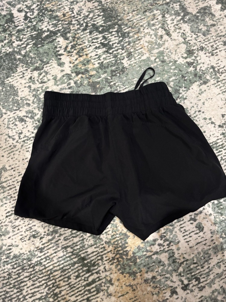 The All In Motion Black Athletic Running Shorts are designed for women in size medium. Featuring a solid black color and a drawstring closure, these shorts are perfect for both activewear and casual occasions. Made of a lightweight and breathable polyester blend fabric, they offer an athletic fit with elastic waist and drawstring for a comfortable and adjustable fit. The shorts also include convenient drawstring pockets for added functionality. Ideal for walking, cross training, gym workouts, and running, these shorts provide both style and performance in one versatile garment.