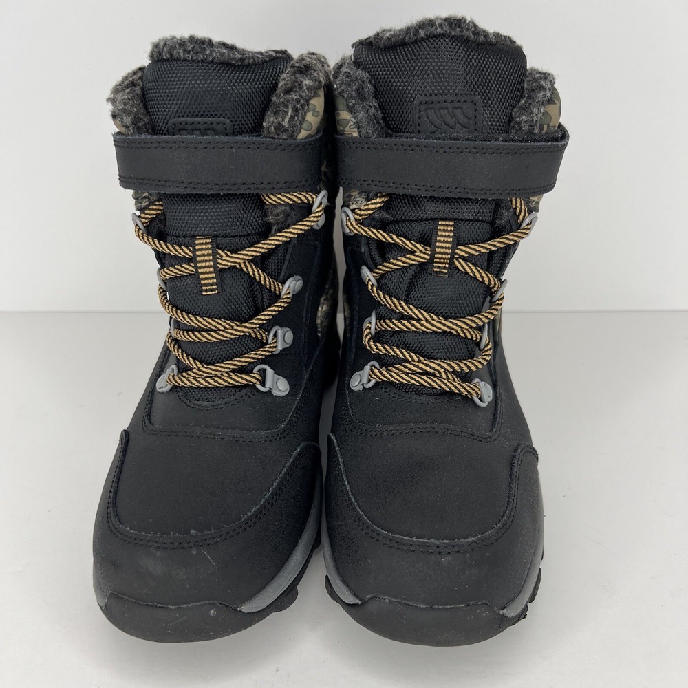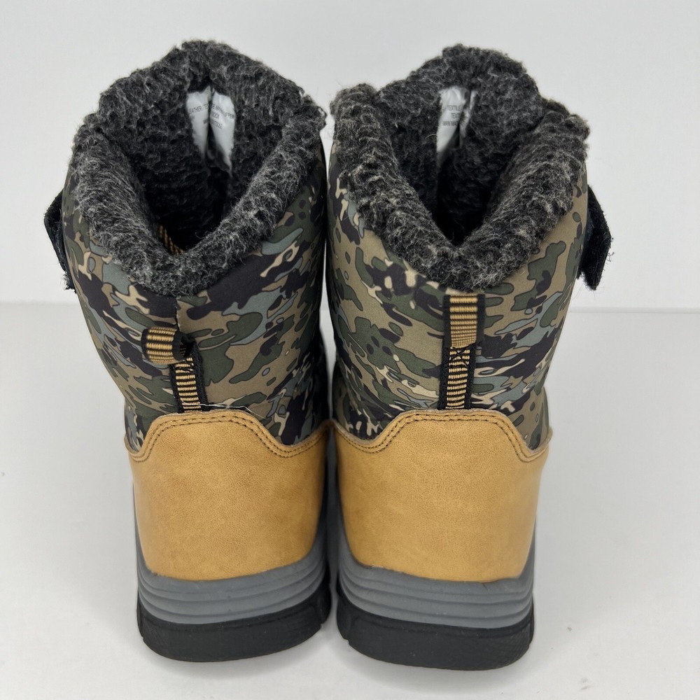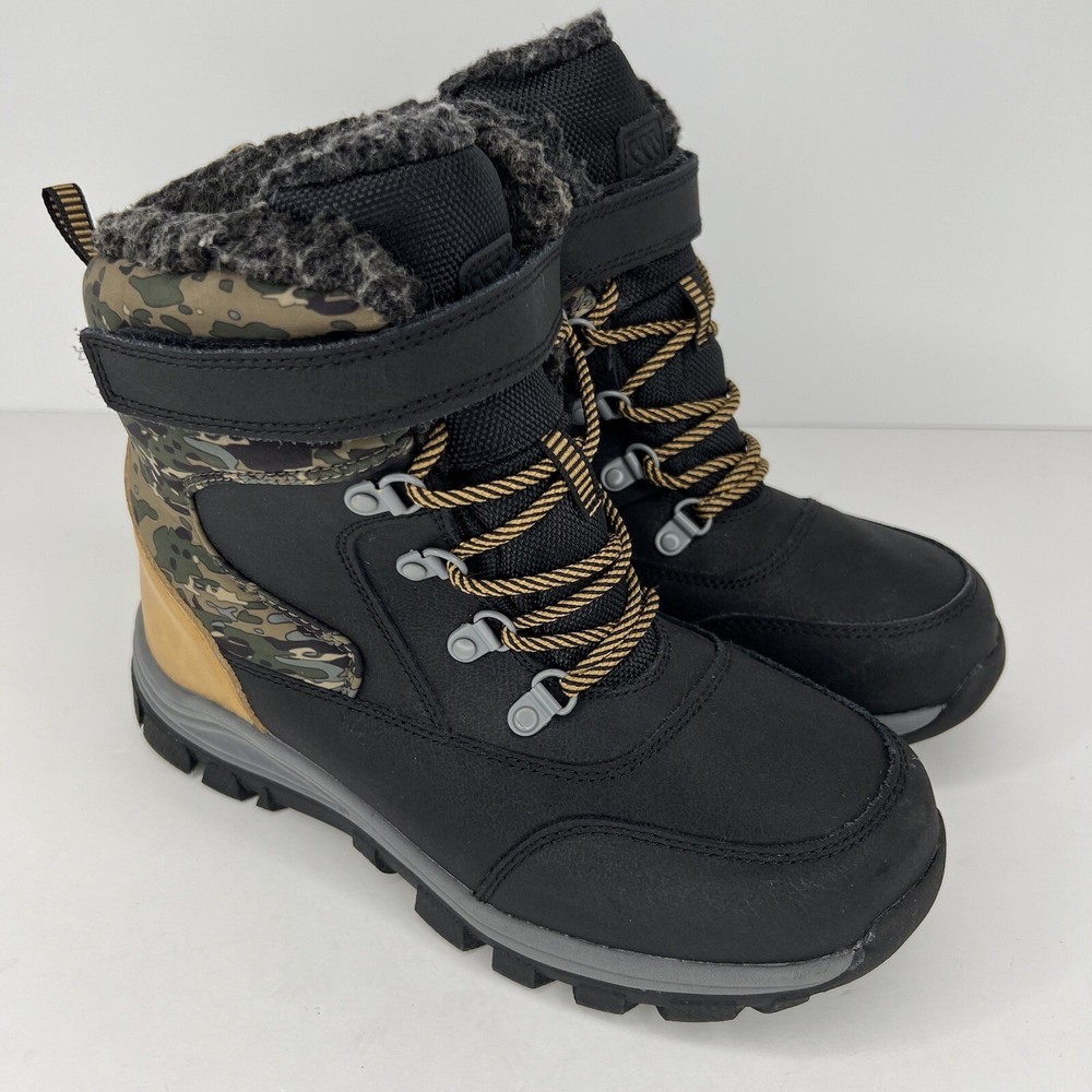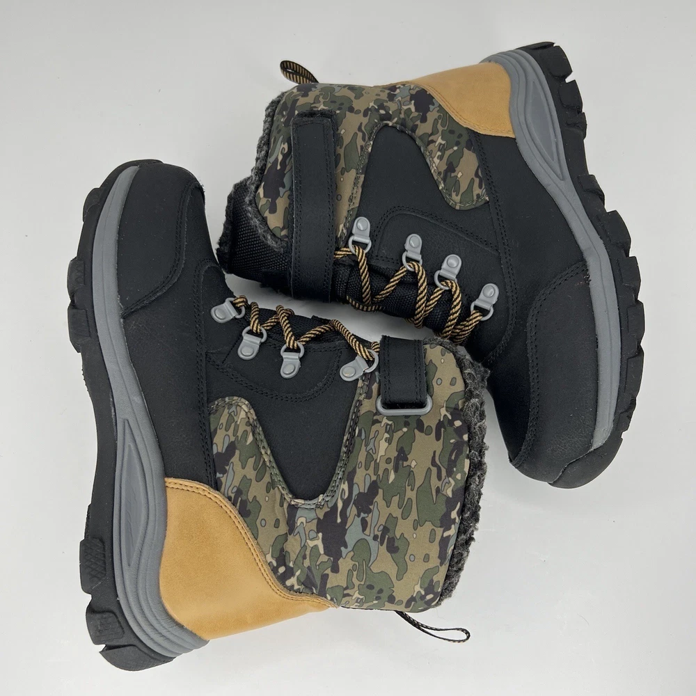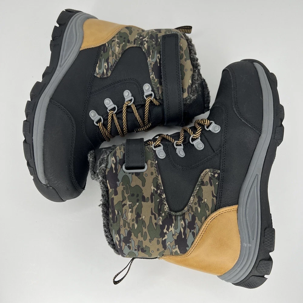 These Foster winter boots are perfect for any outdoor activity, from hiking to walking. The black and tan camouflage pattern adds a stylish touch to these lace-up high top snow boots. The outsole is made of durable rubber, providing excellent traction on wet and slippery surfaces. The boots feature Comfort Plus technology, with an insole made of 80% EVA and 20% polyester, ensuring your little one's feet stay warm and comfortable in the coldest winter weather. The Thermolite lining material adds extra insulation, making these boots water-resistant and perfect for any winter season. These boots come in a standard shoe width and are available in a size 4 for boys 100% CUSTOMER SATISFACTION IS OUR GOAL! Our items are always carefully examined for condition, measured if necessary, and photographed in a climate controlled and smoke-free environment. We make every attempt to accurately describe and clearly picture the items we have for sale. Please, ALWAYS view all of the photos. We value your business and our goal is your complete satisfaction. FAST SHIPPING All items are packaged with care and shipped out the same or next business day via USPS, FEDEX, or UPS with tracking numbers so you are always informed. RETURNS We offer a 30-day return policy. All items must be unused and unopened in the condition in which they were received, with original packaging, and all accessories included for return. REVIEWS - CUSTOMER SATISFACTION - COMMUNICATION We aim to make you happy. After you receive your shipment, please leave a positive review . If you have concerns or questions about your order, please contact us so we can resolve the issue. We will do our best to make you satisfied. THANK YOU FOR YOUR BUSINESS!