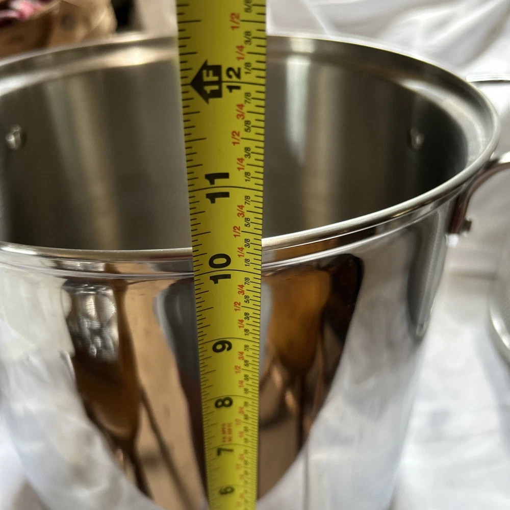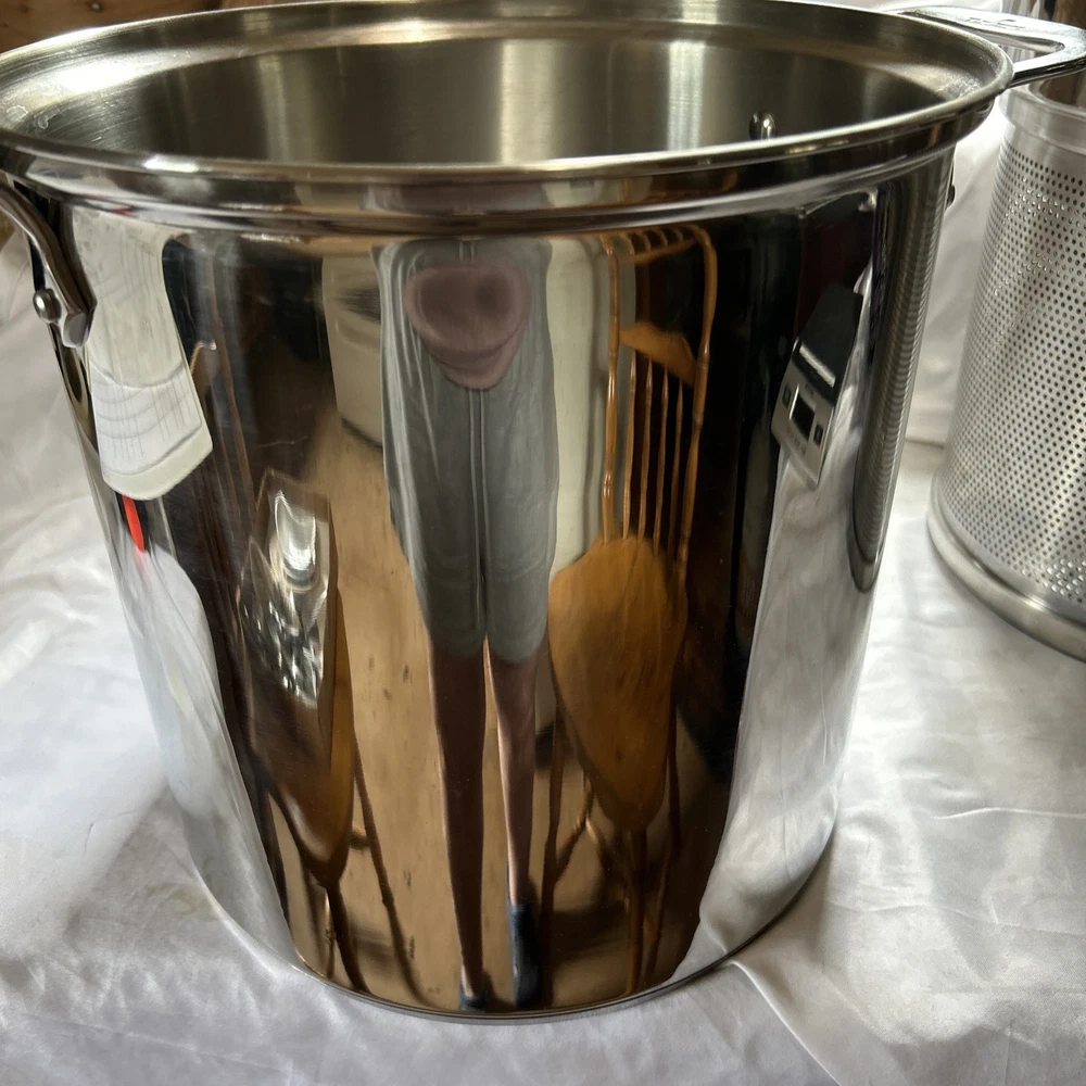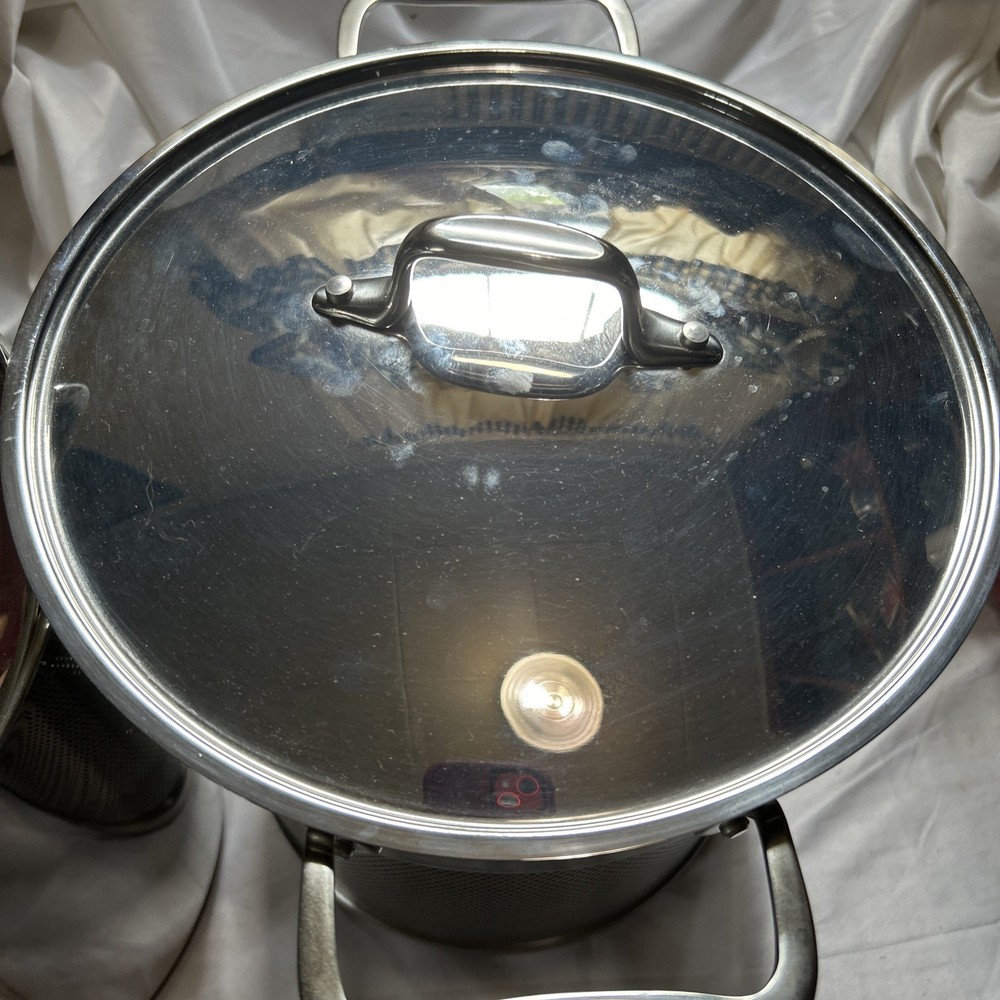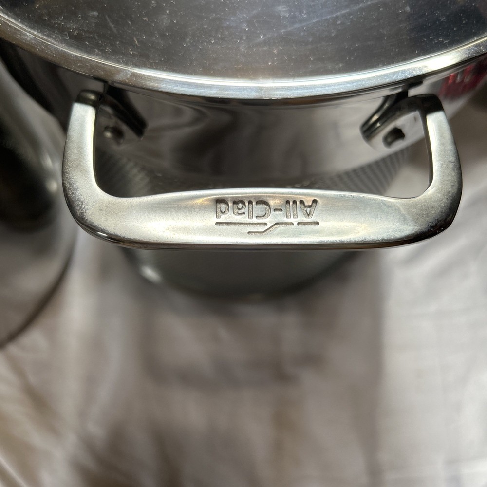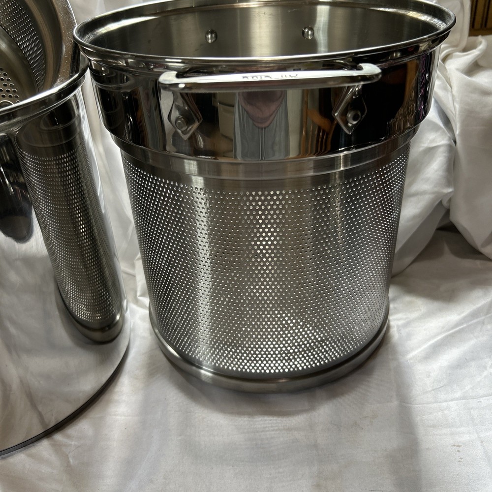 The All-Clad 12 Qt Stock Pot Multi Cooker Steamer Pasta Strainer 4 Piece Set is a versatile and high-quality kitchen essential. Made in the USA with durable stainless steel, this set includes a stockpot, steamer, strainer, and lid, all designed for electric and gas stoves. The round shape and 12Qt capacity make it perfect for a variety of cooking needs, while features like a flat-bottomed design, easy cleaning, and double handles add practicality to the pots. The set is finished in a sleek silver color and is sure to elevate any kitchen's functionality. In real good shape! Normal wear.