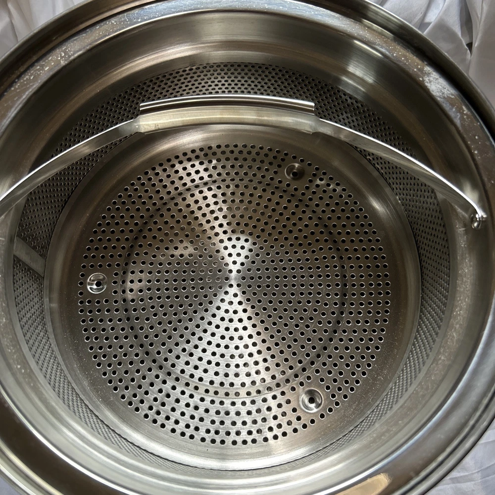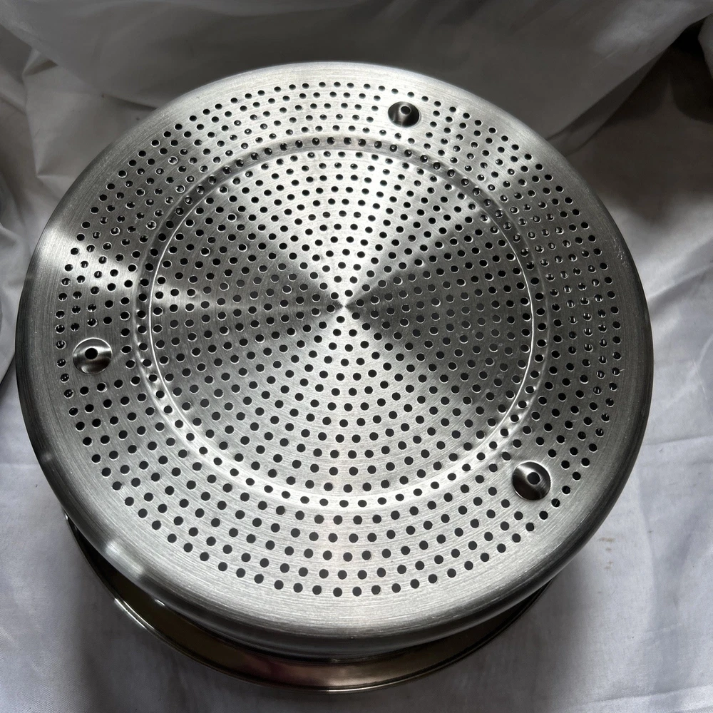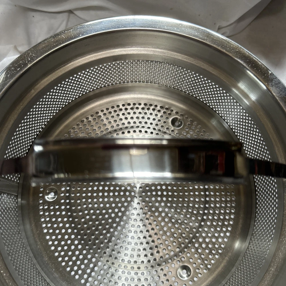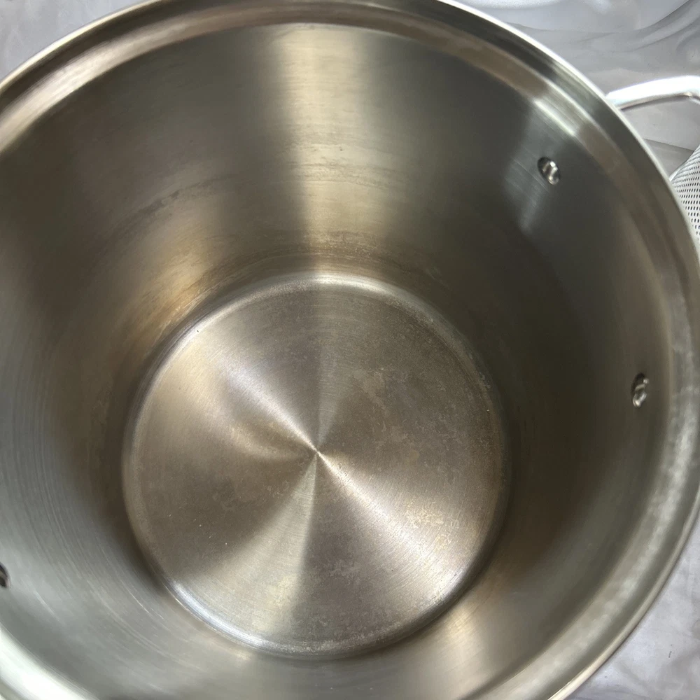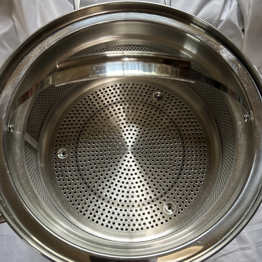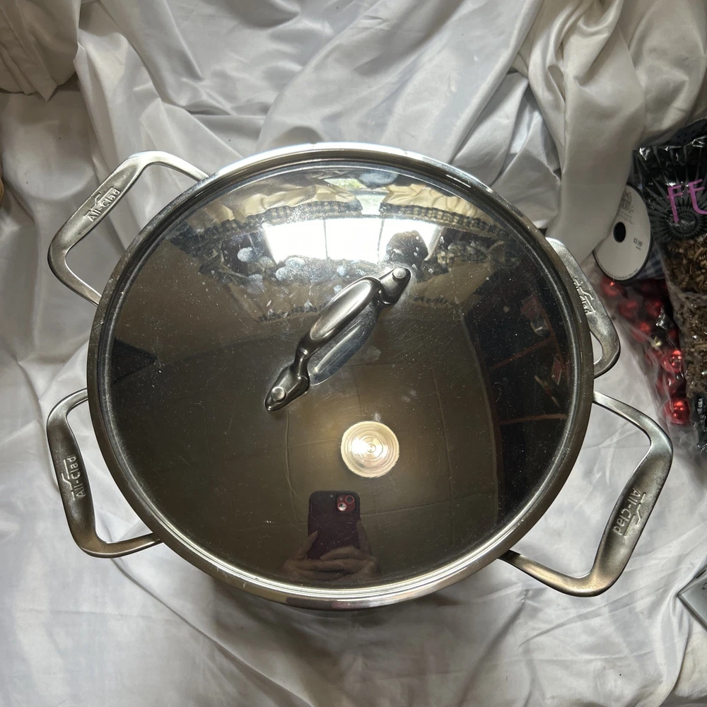 The All-Clad 12 Qt Stock Pot Multi Cooker Steamer Pasta Strainer 4 Piece Set is a versatile and high-quality kitchen essential. Made in the USA with durable stainless steel, this set includes a stockpot, steamer, strainer, and lid, all designed for electric and gas stoves. The round shape and 12Qt capacity make it perfect for a variety of cooking needs, while features like a flat-bottomed design, easy cleaning, and double handles add practicality to the pots. The set is finished in a sleek silver color and is sure to elevate any kitchen's functionality. In real good shape! Normal wear.
