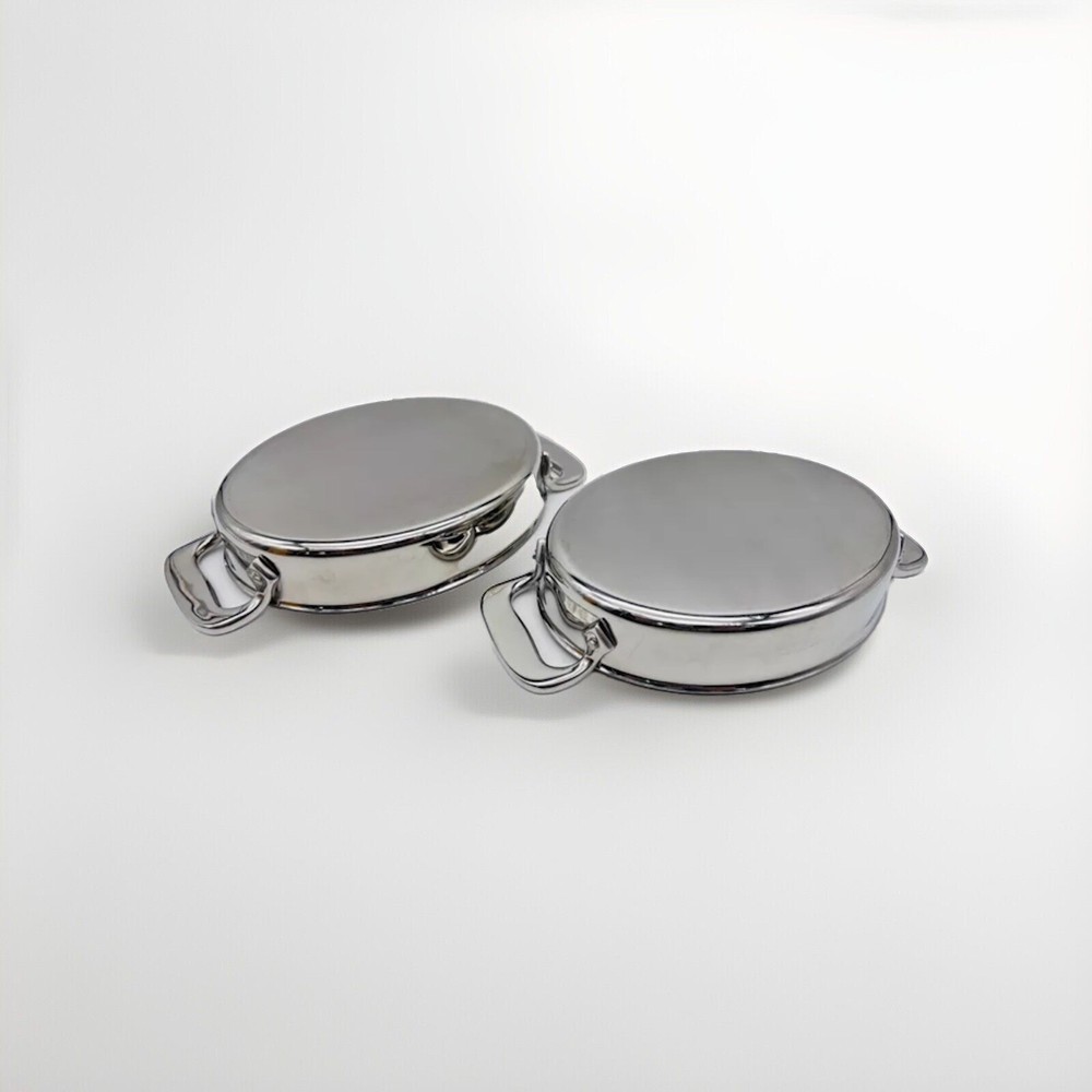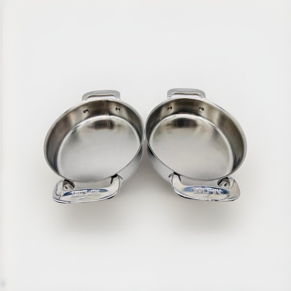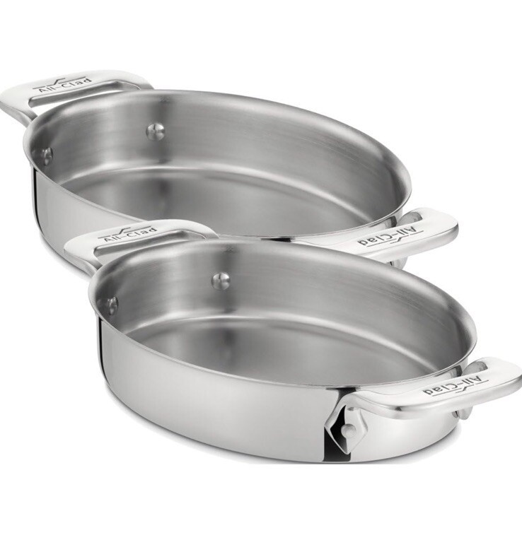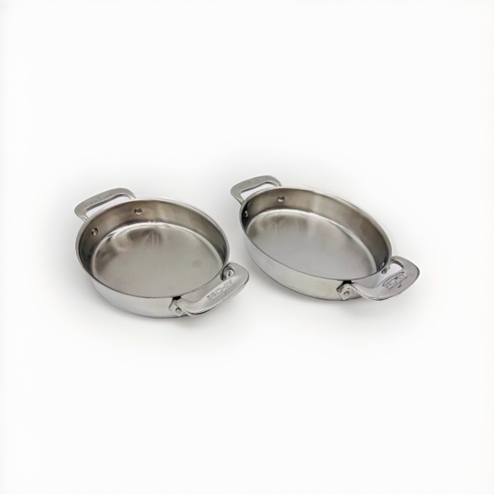 The product is a two-piece set of 7" stainless steel gratin oval-shaped bakers or individual casseroles by All-Clad. These versatile bakers are compatible with induction, electric, and gas stoves, as well as gas ovens. Made of high-quality stainless steel, each casserole features a silver color and measures 5-1/2" in diameter and 6" in length and width. Perfect for baking and serving various dishes, these original All-Clad pieces are a valuable addition to any kitchen collection.