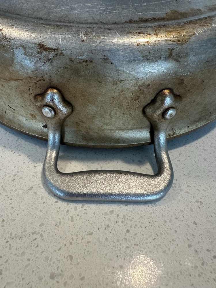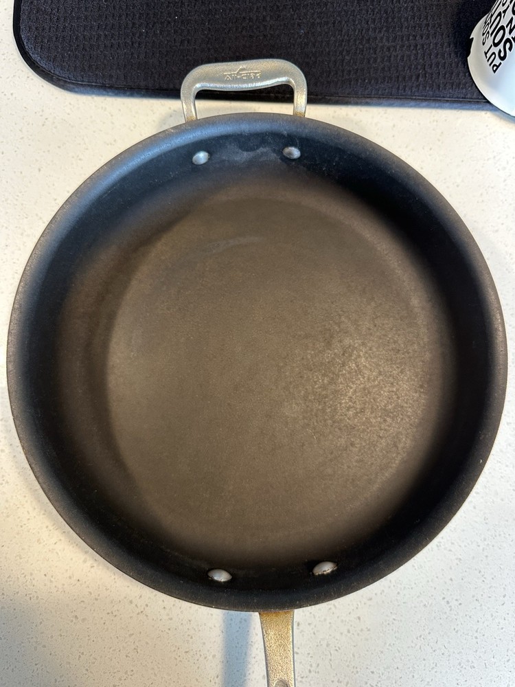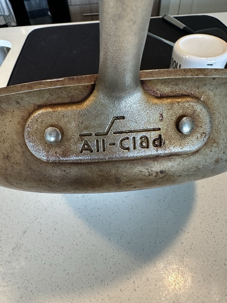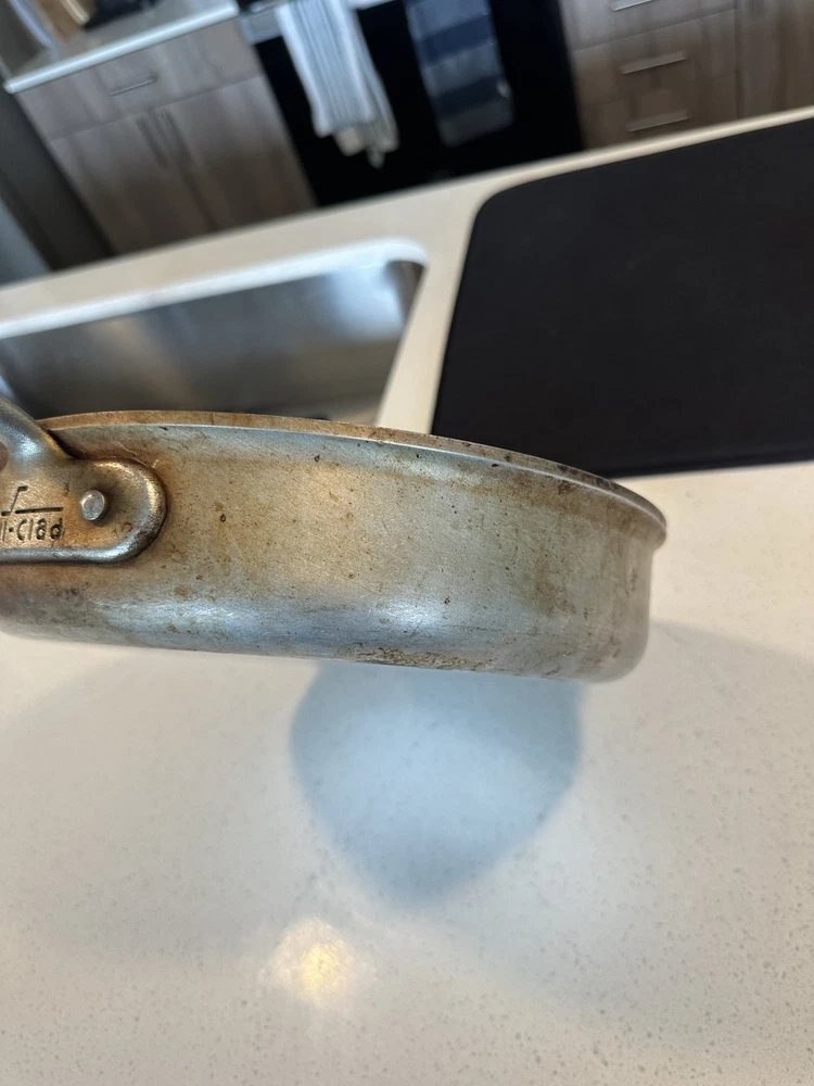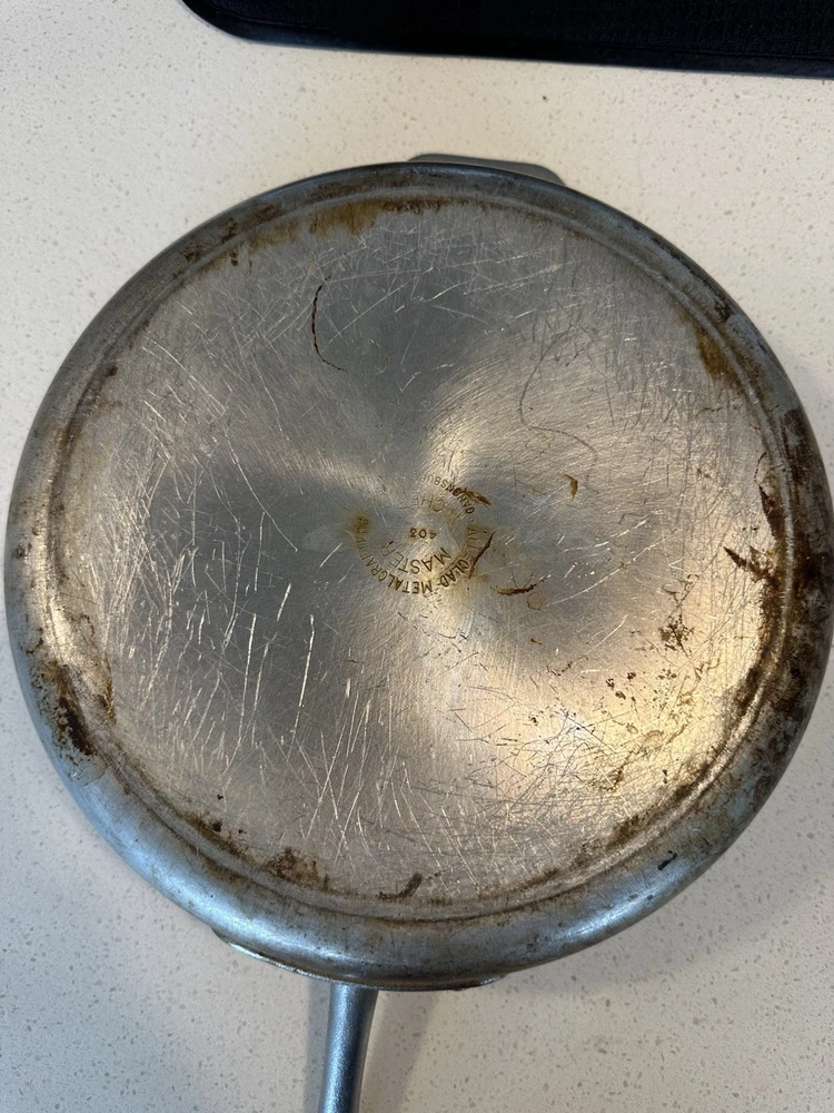 Used All-Clad Master Chef Series 403 skillet/frying pan, made in Canonsburg, PA, USA. 12-inch diameter, solid aluminum construction with riveted handles. Shows signs of heavy use including surface scratches and staining (see photos), but still functional and structurally sound. A solid addition to any kitchen or collector of American-made cookware.