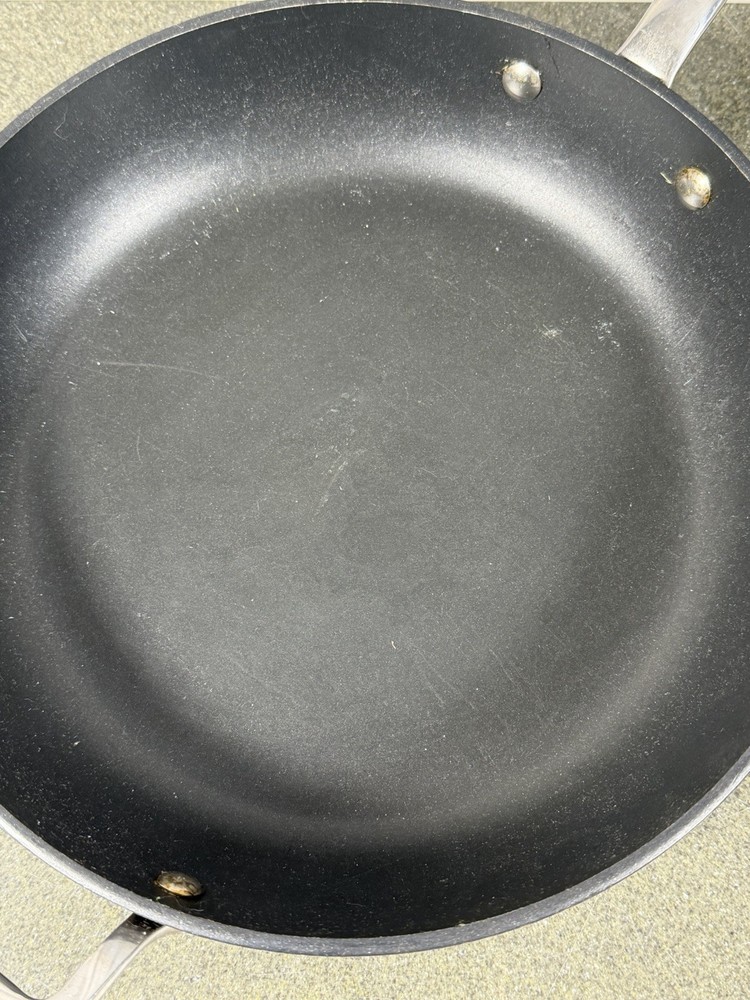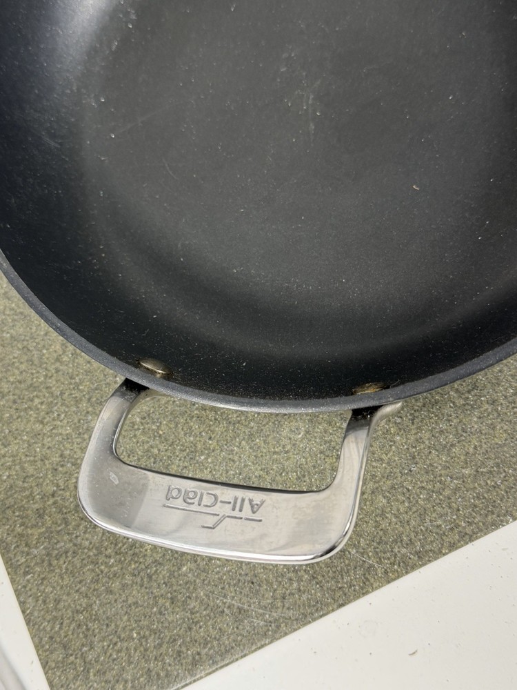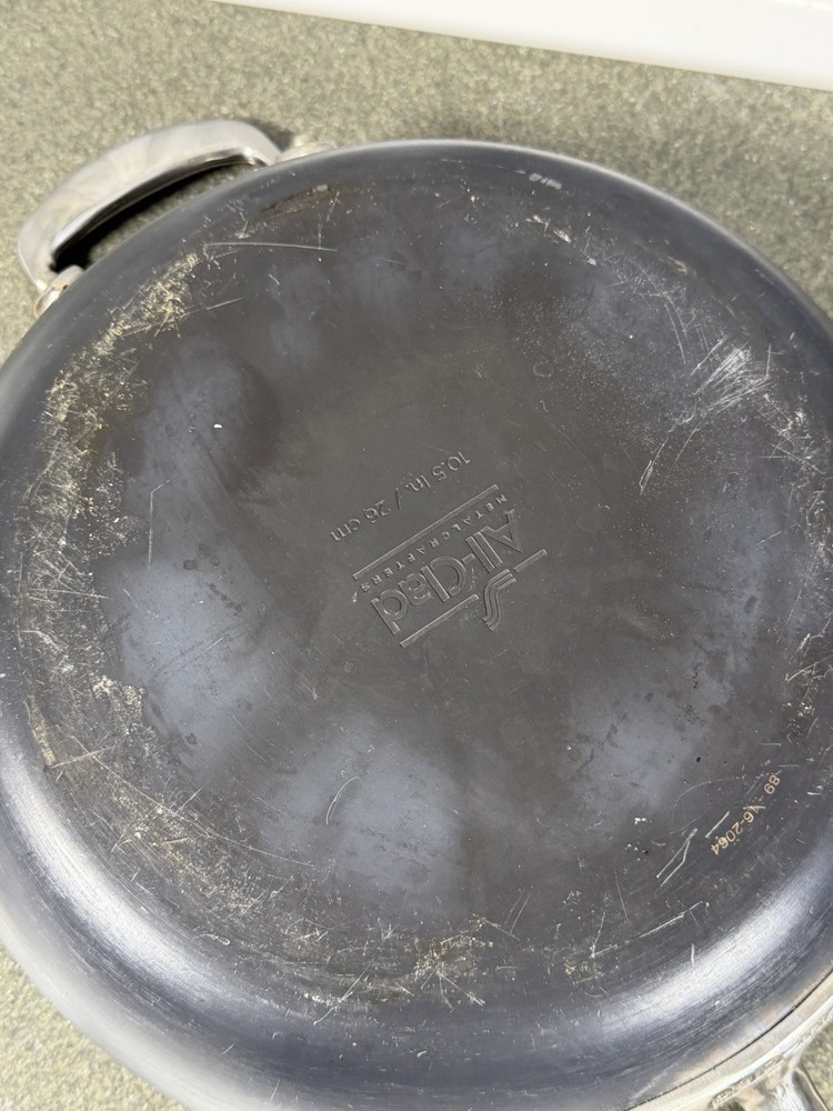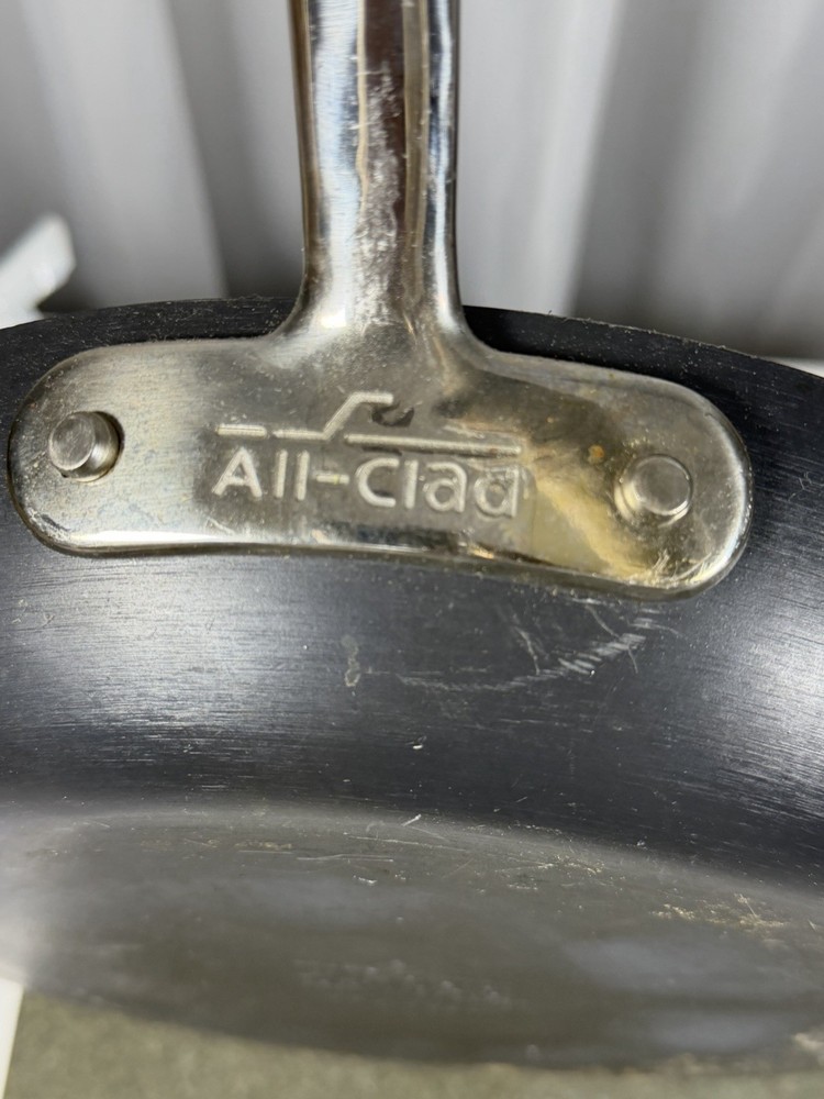All-Clad Metal Crafters Nonstick Fry Pan 10.5" 20” long with handle, about 2.25” deep.