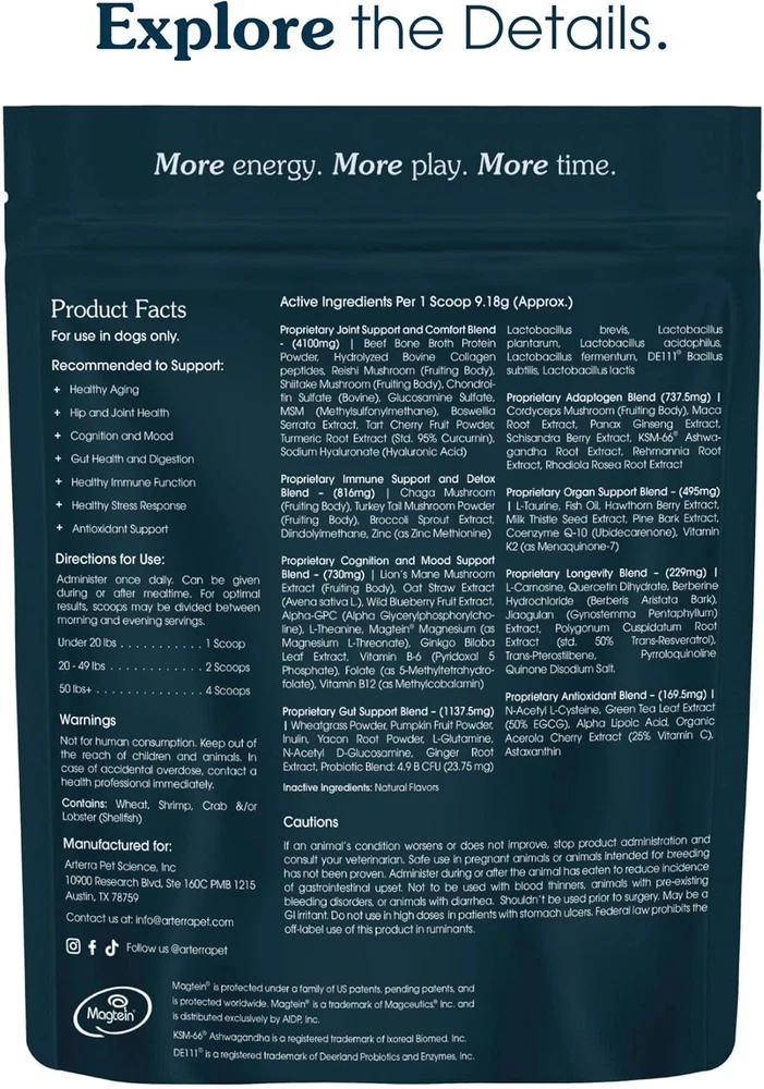 AutoDS Template Store New Arrivals Add to Favorite View Feedback Contact All-In-One Dog Supplement for Advanced Wellness & Longevity, 63 Premium Ingredie All-In-One Dog Supplement for Advanced Wellness & Longevity, 63 Premium Ingredie Comprehensive Wellness and Longevity Support: Our all-in-one, senior regenerative formula is designed to turn back the clock, restoring youthful energy and mobility in aging dogs who have begun to slow down. This daily supplement supports healthier joints and mobility, provides targeted relief for arthritis pain, and addresses age-related cognitive and mood decline. It also boosts vitality, digestion and gut health, organ function, cellular support, skin and coat health, and overall wellness for optimal longevity. Premium, Natural Ingredients: Made with 63 powerful ingredients for maximum anti-aging benefits, Arterra’s formula is developed by veterinarians and backed by science to ensure the highest quality and efficacy. Our product delivers more comprehensive health support than others on the market, significantly outperforming competitors in both ingredient quality and dosage. Made in the U.S.A., 100% filler-free, and backed by our Results Guarantee, Arterra is the superior choice for your dog’s health needs. Advanced Hip & Joint Mobility Care: Promotes joint health, eases discomfort, and supports connective tissues. Loaded with 11 effective ingredients, including Glucosamine, Chondroitin, Bone Broth Protein, Collagen Peptides, and MSM, our formula aids in hip and joint lubrication and cartilage health, ensuring your dog maintains mobility and comfort. Optimal Digestive Health: Infused with probiotics and prebiotics, our supplement improves gut integrity, supports efficient digestion, and helps alleviate gastrointestinal issues for enhanced overall well-being. Cognitive Function Enhancement: Supports brain health and enhance mood stability with Fish Oil rich in Omega-3 EPA and DHA, Magnesium L-Threonate, Lion’s Mane, and other functional nutrients that promote cognitive function, helping your senior dog stay sharp, alert, and mentally active as they age. Easy To Use: Arterra is simple to administer—just mix the appropriate scoop size with your dog's daily food based on their weight, making it an effortless and tasty addition to their wellness routine. See results in as little as one week to 30 days, as the benefits are cumulative and amplify over time. Product Description Wellness Today Means More Time Together Tomorrow. Digestion & Gut Supports overall digestive health by nourishing beneficial gut bacteria and strengthening the intestinal lining. Hip & Joint Mobility Reinforces joint health, eases discomfort, and supports connective tissues. Promotes lubrication, reduces inflammation, and supports optimal mobility. Energy & Vitality Boosts energy, promotes endurance, and helps the body adapt to stress. Regulates hormones and enhances recovery for a resilient, energetic dog. Cognition & Mood Optimizes brain function and enhances mood stability. Boosts cognitive clarity, neural health, and calmness for a sharp mind and balanced temperament. 23 Essential health benefits for overall wellness, vitality, and longevity. Immune Support Strengthens the immune system, protects against cellular damage, stimulates immune cells, supports detoxification, and maintains hormone balance. Skin, Coat & Allergy Relief Makes coats shinier, softer, and fuller. Soothes inflammation and supports immune function, reducing itching, scratching, and allergic reactions. Organ Function Safeguards vital organs, strengthens heart walls, supports liver detoxification, and boosts circulation for peak internal system performance. Cellular Health Boosts cellular energy metabolism and mitochondrial health, activates healthy aging pathways, reduces AGEs, and clears out old, dysfunctional cells. Power packed solutions to keep your dog healthy. Add to Cart Add to Cart Add to Cart Add to Cart Add to Cart Add to Cart Add to Cart Customer Reviews 4.4 out of 5 stars 150 4.4 out of 5 stars 150 4.4 out of 5 stars 150 4.4 out of 5 stars 150 4.4 out of 5 stars 150 4.4 out of 5 stars 150 4.3 out of 5 stars 329 Price $56.99 $ 56 . 99 $109.99 $ 109 . 99 $199.99 $ 199 . 99 $49.99 $ 49 . 99 $69.99 $ 69 . 99 $109.99 $ 109 . 99 $19.99 $ 19 . 99 Recommended Uses Wellness & Longevity Support Wellness & Longevity Support Wellness & Longevity Support Wellness & Longevity Support Wellness & Longevity Support Wellness & Longevity Support Fights Decay, Reduces Tartar Product Benefits Restores Energy & Mobility Restores Energy & Mobility Restores Energy & Mobility Slows Aging Process Slows Aging Process Slows Aging Process Repairs Teeth, Freshens Breath Premium Ingredients 63 Active Ingredients 63 Active Ingredients 63 Active Ingredients 46 Active Ingredients 46 Active Ingredients 46 Active Ingredients 14 Active Ingredients Irresistible Flavors Chicken-Bacon Flavor (Vegan) Chicken-Bacon Flavor (Vegan) Chicken-Bacon Flavor (Vegan) Chicken-Bacon Flavor (Vegan) Chicken-Bacon Flavor (Vegan) Chicken-Bacon Flavor (Vegan) Peanut Butter (Plant-based) Form Powder Powder Powder Powder Powder Powder Paste Veterinarian-Formulated ✔ ✔ ✔ ✔ ✔ ✔ ✔ Science-Backed ✔ ✔ ✔ ✔ ✔ ✔ ✔ Made in U.S.A. ✔ ✔ ✔ ✔ ✔ ✔ ✔ Maximum Efficacy & Potency ✔ ✔ ✔ ✔ ✔ ✔ ✔ Easy To Use ✔ ✔ ✔ ✔ ✔ ✔ ✔ Serving Size 1 Month for Small Breed 1 Month for Medium Breed 1 Month for Large Breed 1 Month for Small Breed 1 Month for Medium Breed 1 Month for Large Breed 1 Tube Item model number FBASUPSRSPK1 Age Range Description Senior Warranty Description Manufacturer Country of Origin USA Target Audience Keyword dogs Breed Recommendation Small Product Dimensions 6.5 x 2 x 8 inches; 9.7 ounces Flavor Name Senior Formula Directions Administer once daily. Can be given during or after mealtimes. For optimal results scoops may be divided between morning and evening servings. Item Form Powder Item Packa