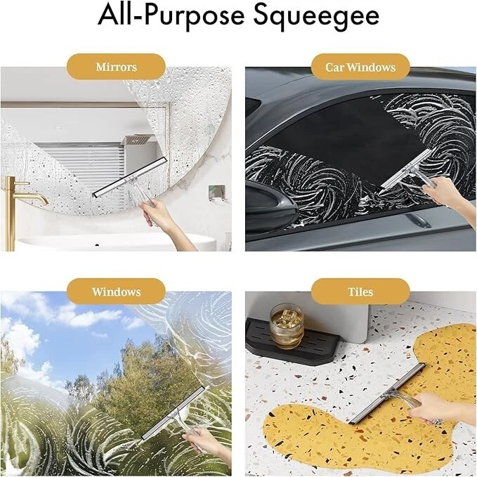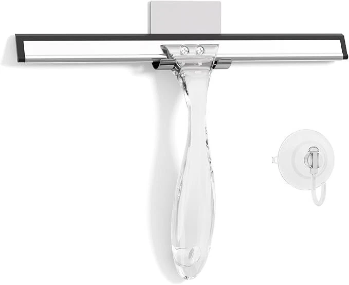 Shower Squeegee for Glass Doors, All-Purpose Squeegee with Suction Hook & Adhesive Hook, Clear Squeegee for Shower Glass, Windows, Mirrors, Tiles and Car Windows - 10 Inches, Clear About this item Acrylic Ergonomic Handle: Ditch the traditional metal handle and embrace the comfort and beauty of the clear acrylic handle. The curved design of our shower squeegee ensures a comfortable grip while the lightweight nature prevents wrist strain, making your cleaning experience more enjoyable. All-Purpose Squeegee: The wide silicone blade effortlessly removes water and foam from various surfaces such as shower doors, windows, mirrors, tiles, and car windows. Its versatility makes it a go-to tool for all your cleaning needs on smooth and flat surfaces. Shiny & Streak-Free: Say goodbye to streaks and smudges with ease. The window squeegee's efficient water-clearing ability ensures a sparkling finish every time without requiring vigorous scrubbing. Pair the glass squeegee with your favorite household cleaner for an added shine. Dual Hanging Options for Convenience: Enjoy the flexibility of two hanging solutions with the AmazerBath bathroom squeegee. Choose between the convenient suction cup hook for easy, removable placement or the reliable adhesive hook for a more permanent and discreet mounting option. Ideal for daily use and hassle-free storage. Sturdy & Durable Construction: Reinforced handle-to-blade connection ensures lasting durability and easy adjustments. Crafted from non-rust material, this shower door squeegee is built to withstand daily use and promises longevity, especially in damp environments like shower areas.