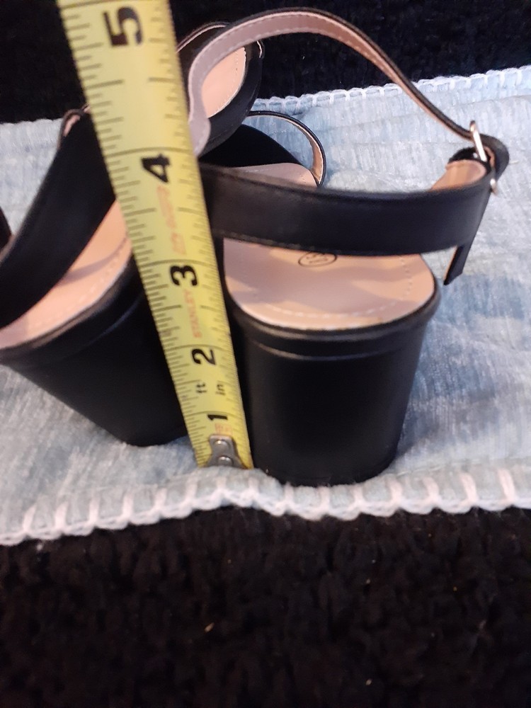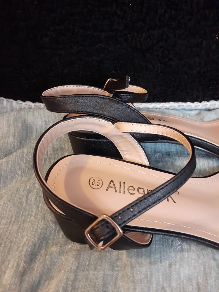 Smoke free home. Worn once. This product is a pair of women's black block heel sandals by Allegra K in size 8.5. They feature an open toe design with an ankle strap closure secured by a buckle. The chunky heel style provides stability and comfort, making them suitable for summer and spring seasons. The upper material is faux leather, giving the sandals an elegant look perfect for various occasions.