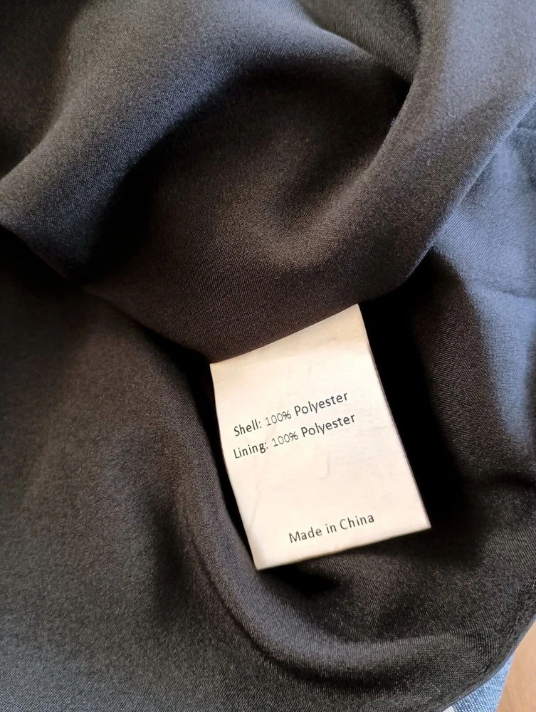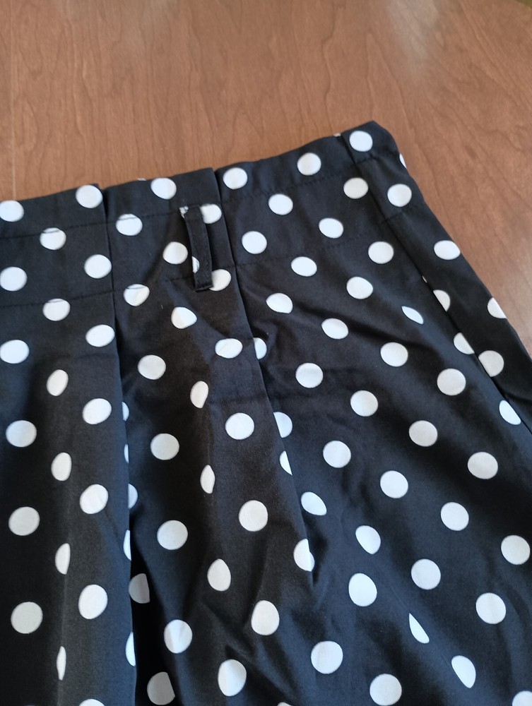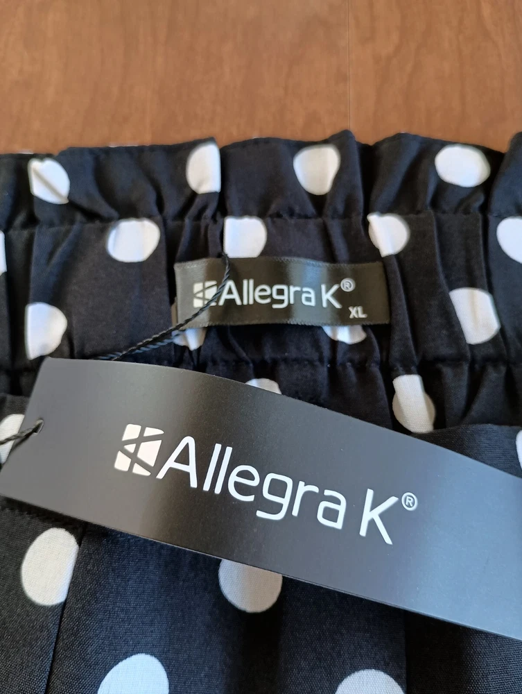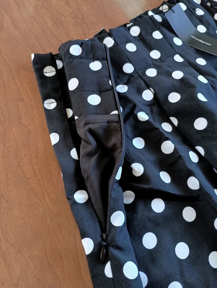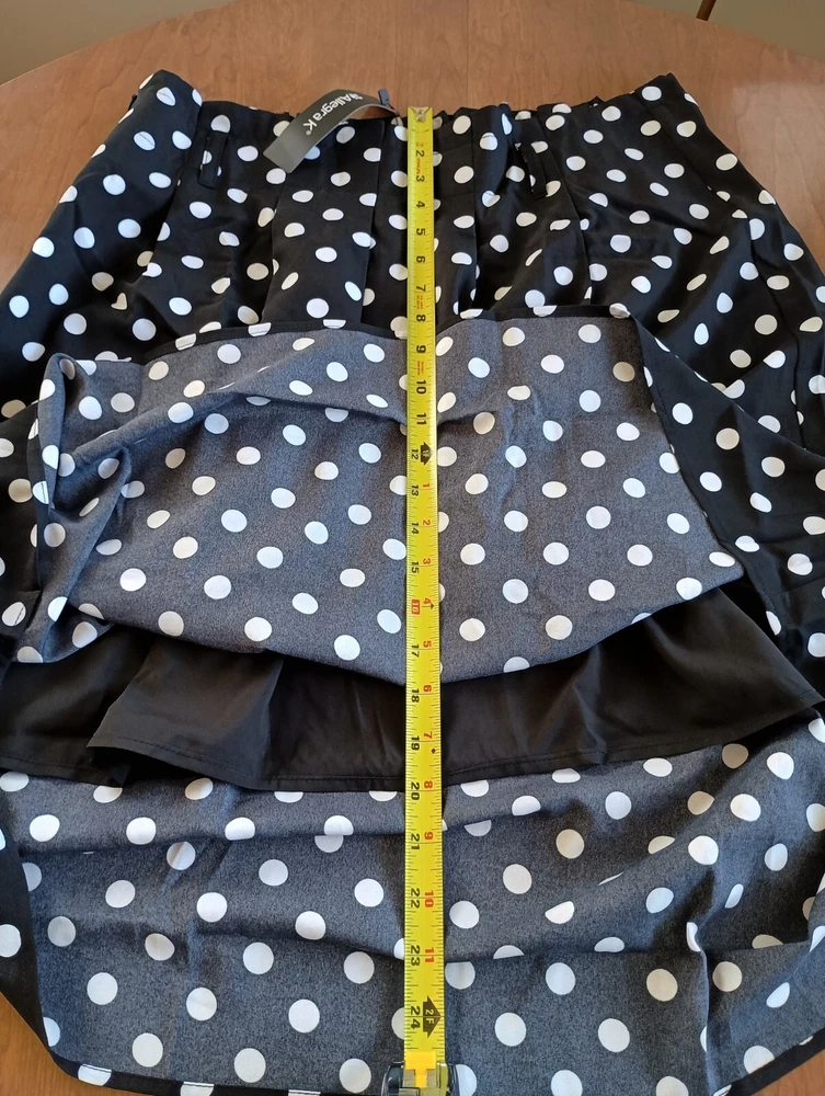 Shell color is black with white Polka Dots. Lining color is black. Size says XL - see photos for exact measurements. Also has secret zipper on one side that zips down about 6inches Shell and lining is 100% Polyester Also comes with Polka dot waist tie belt. This is currently being stored in a smoke/pet friendly home (will be put back in packaging until sold) Please see all photos before purchasing If you have any questions feel free to message me