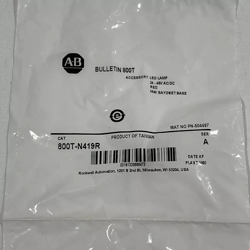 New! Allen Bradley 800T-N419R N419R 24-48V AC/DC Red LED Replacement Lamp Pilot light/Selector Switch/Push Button Replacement Bulb Fast Free Standard Shipping! This is a NEW item in original package - Package may show signs of handling. Your satisfaction is guaranteed! If you have any problems, return this item to me in the same condition that it was sent to you and I will refund the purchase price (less shipping cost) for 30 days. Location: Shelf B10 - Bin 106 Overnight Shipping Overnight orders need to be purchased and arranged with the seller Prior to 2:30pm Central Time. We can ship UPS Next Day Air in many cases and can also ship using your UPS account if desired. Contact us to arrange specific shipping details. DOMESTIC SHIPPING Most items will ship within one business day of the payment clearing. The item is guaranteed to ship within three business days. INTERNATIONAL SHIPPING International buyers are responsible for all customs charges. Please provide a contact name and phone number that can be used on the customs form. It is against company policy to mark purchased items as "gift" or to adjust the customs value lower than the actual cost. PAYMENTS Payment must be received within 7 business days unless other arrangements are made beforehand. Indemnity: Buyer shall, at no expense to the Seller, indemnify, defend and hold the Seller harmless against any and all losses, damages and expense (including punitive damages, multiple damages, attorney fees and other costs of defending any action) Seller may incur as a result of any claim made against the seller by any person, including without limitation, Buyer, it's successors, assigns, representatives, agents, employees, insurers, and customers, actually or allegedly arising out of the regarding the transportation, installation or use of the equipment sold hereunder by Seller or out of any products manufactured or sold by Buyer, including, without limitation, any claim which in whole or in part actually or allegedly arises out of (a) Seller's negligent or other wrongful act or omission, (b) danger or default in any equipment sold by Seller to Buyer, (c) infringement by Seller of any patent, copyright, or trade secret relating to any equipment sold by Seller to Buyer.