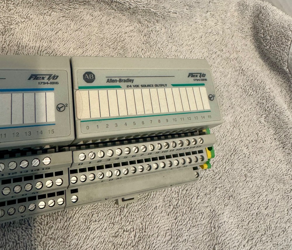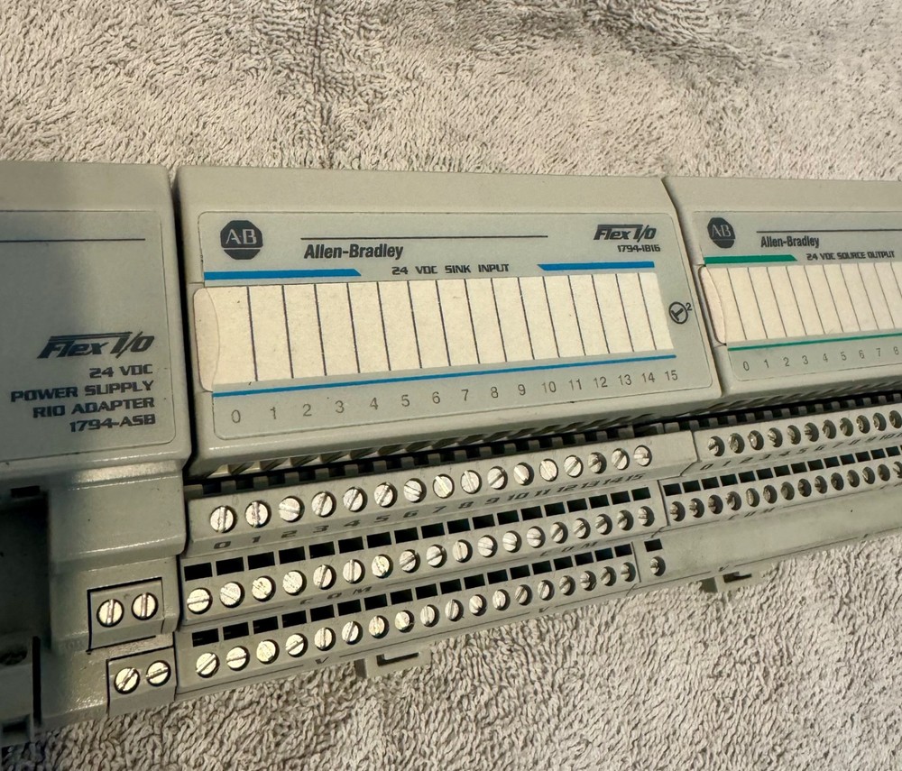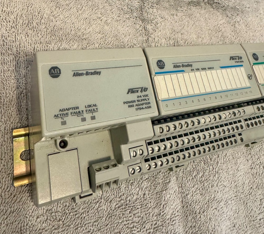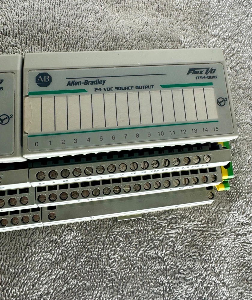 The Allen Bradley Flex I/O 1794 Complete I/O module is a high-quality PLC input/output module designed for industrial automation and motion control systems. Made by Allen-Bradley in the United States, this analog module is compatible with the FlexLogix controller platform. This module provides reliable and efficient communication between the controller and various peripheral devices, making it an essential component for a seamless automation process. Included: Flex I/O 24 volt power supply 1794-ASB, 1794-1816 24 VDC Sink input, 1794-0816 24 VDC Source output, All mounted on a din rail.
