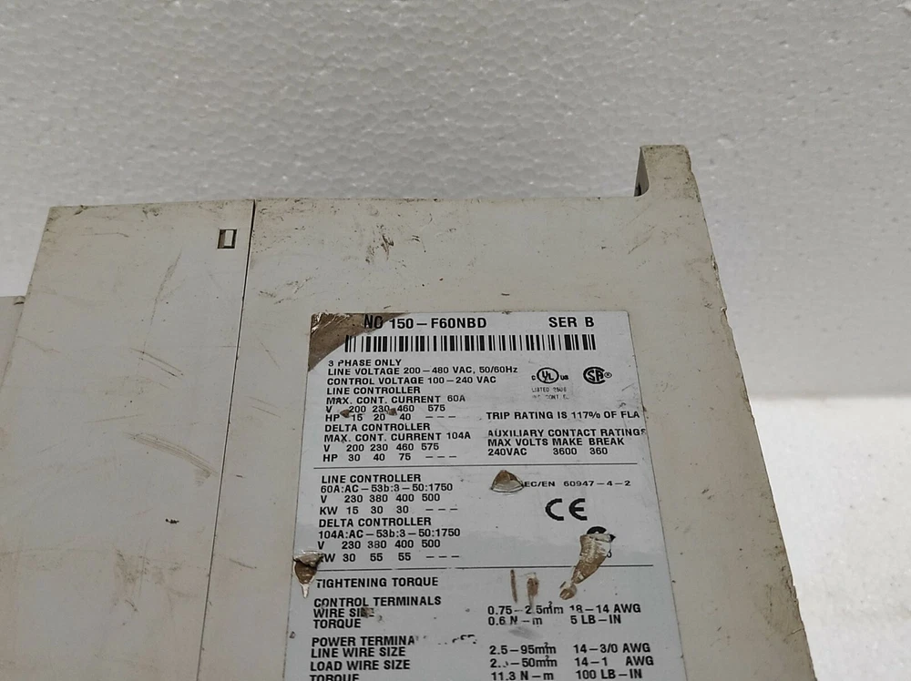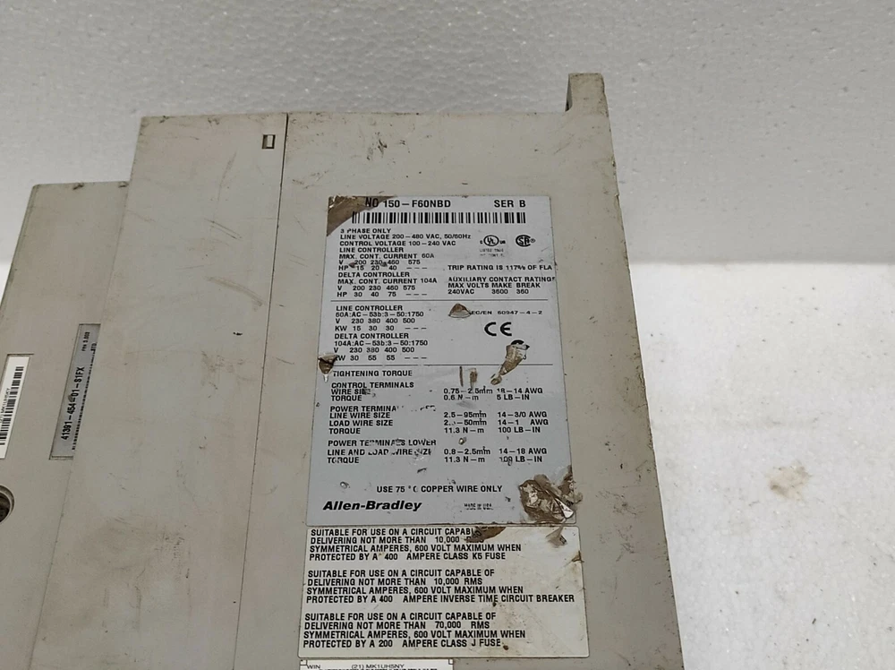 We are pleased to offer ALLEN BRADLEY SMC-FLEX CAT NO 150-F60NBD SERIES B MOTOR CONTROLLER SOFT STARTER Product Detail: ALLEN BRADLEY SMC-FLEX CAT NO 150-F60NBD SERIES B MOTOR CONTROLLER SOFT STARTER MODEL: SMC-FLEX CAT NO: 150-F60NBD SERIES: B TYPE: MOTOR CONTROLLER SOFT STARTER MADE IN USA Shipment processing time: All orders are processed within 1-2 business days. Orders are not shipped or delivered on weekends or holidays. Shipment confirmation & Order tracking: You will receive a Shipment Confirmation email once your order has shipped containing your tracking number(s). The tracking number will be active within 24 hours. Customs, Duties and Taxes: We are not responsible for any customs and taxes applied to your order. All fees imposed during or after shipping are the responsibility of the customer (tariffs, taxes, etc.). Damages: In case of damage or lost of shipment during transit, We will investigate the matter and provide the satisfactory resolution. Returns Policy: We offer return or exchange of ordered item up to 30 days of receipt of goods in subject to certain condition. In case of damaged goods we shall offer the replacement or refund for the ordered item. If you require any more details, request you to send us the direct message through eBay for early resolution. Thanks