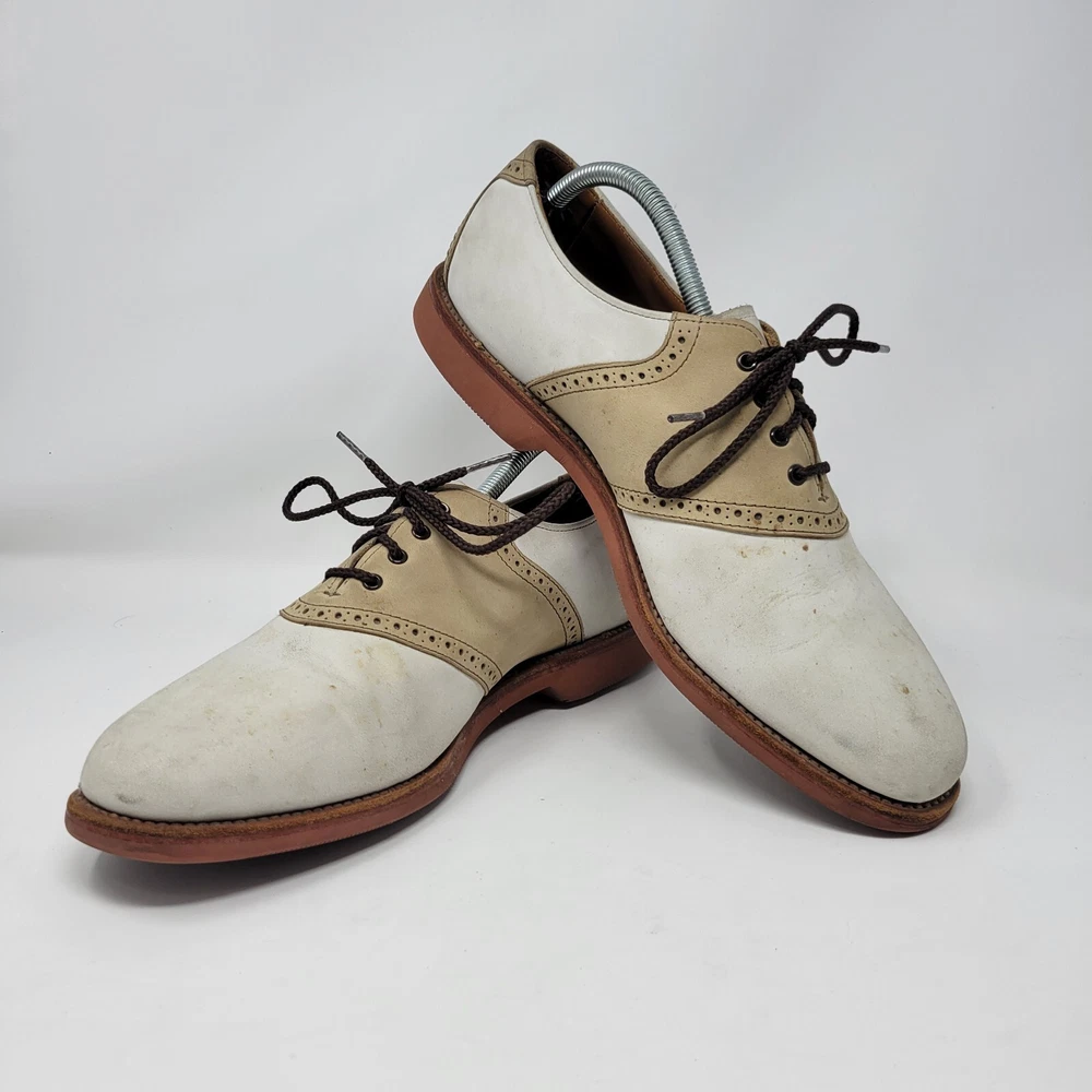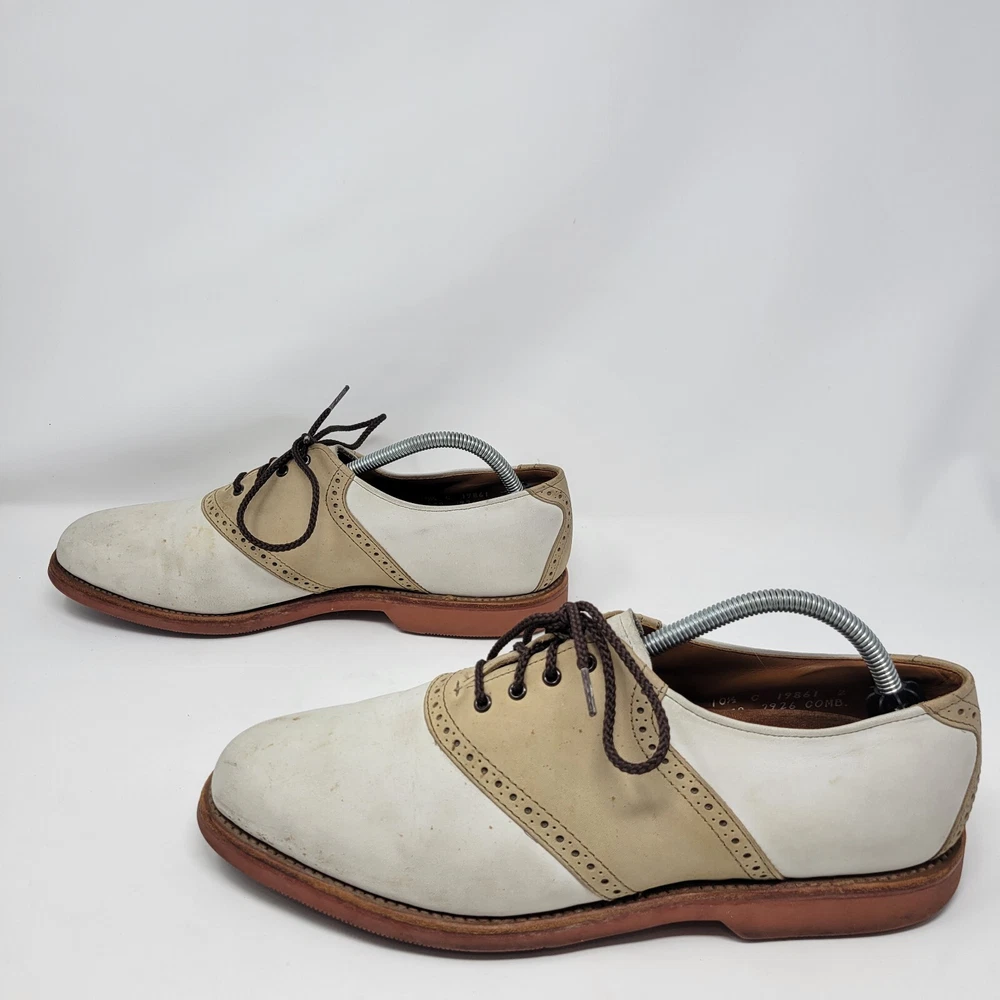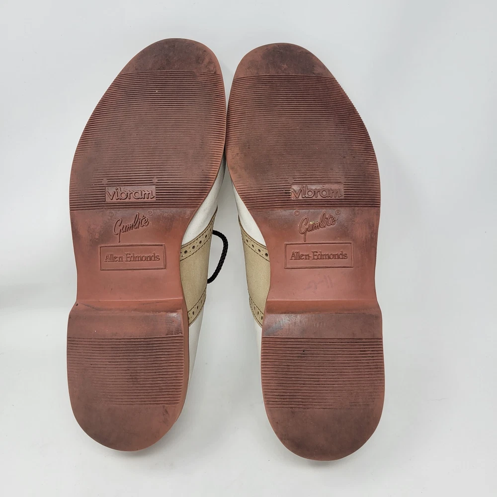 Elevate your style with these Allen Edmonds men's dress shoes. Crafted from premium beige and tan leather, these Oxford lace-up shoes feature an almond toe and colorblock pattern with the brand's iconic logo accents. The adjustable straps and Vibram gumlite outsole provide comfort and performance, making them perfect for any occasion. These shoes are tailored for a classic look with a preppy city vibe and are suitable for winter, summer, fall, and spring. They are available in US size 10.5 and UK size 10, with a C shoe width. The lining, insole, and outsole are made of leather, ensuring durability and quality. Add a touch of sophistication to your wardrobe with these timeless Allen Edmonds saddle shoes. These shoes are in excellent “pre owned” condition. For more information, please see photos or feel free to contact me with any questions. All orders are shipped within 24 hours of payment received.